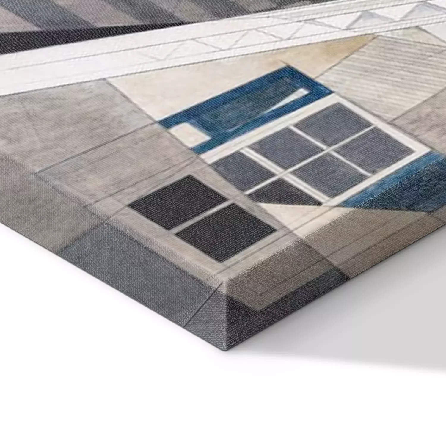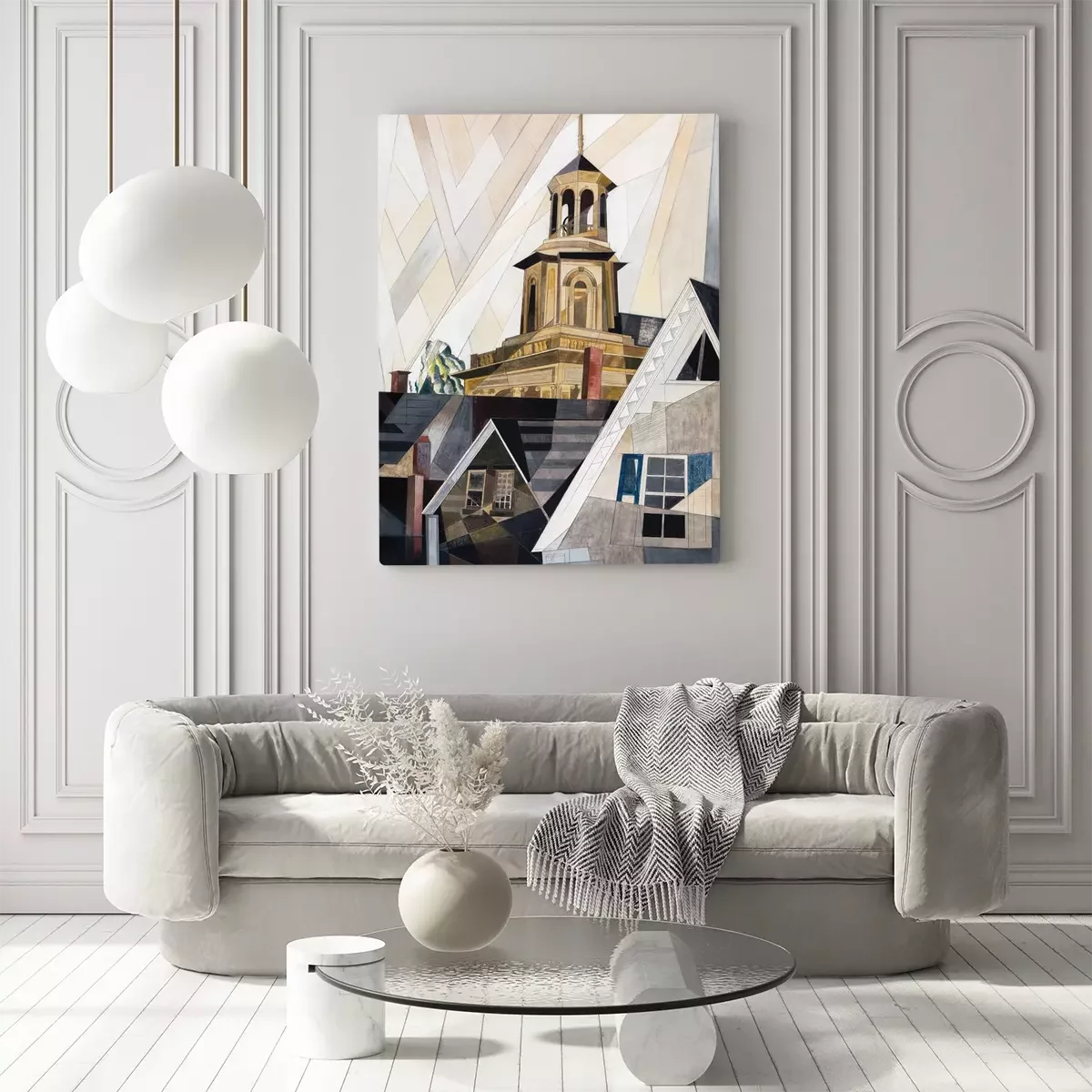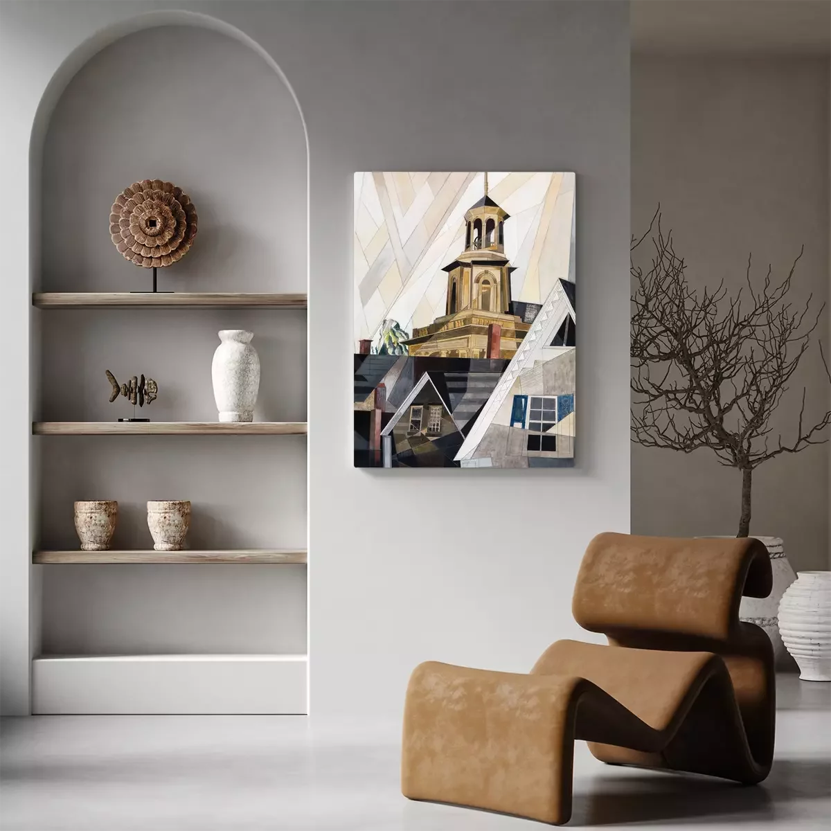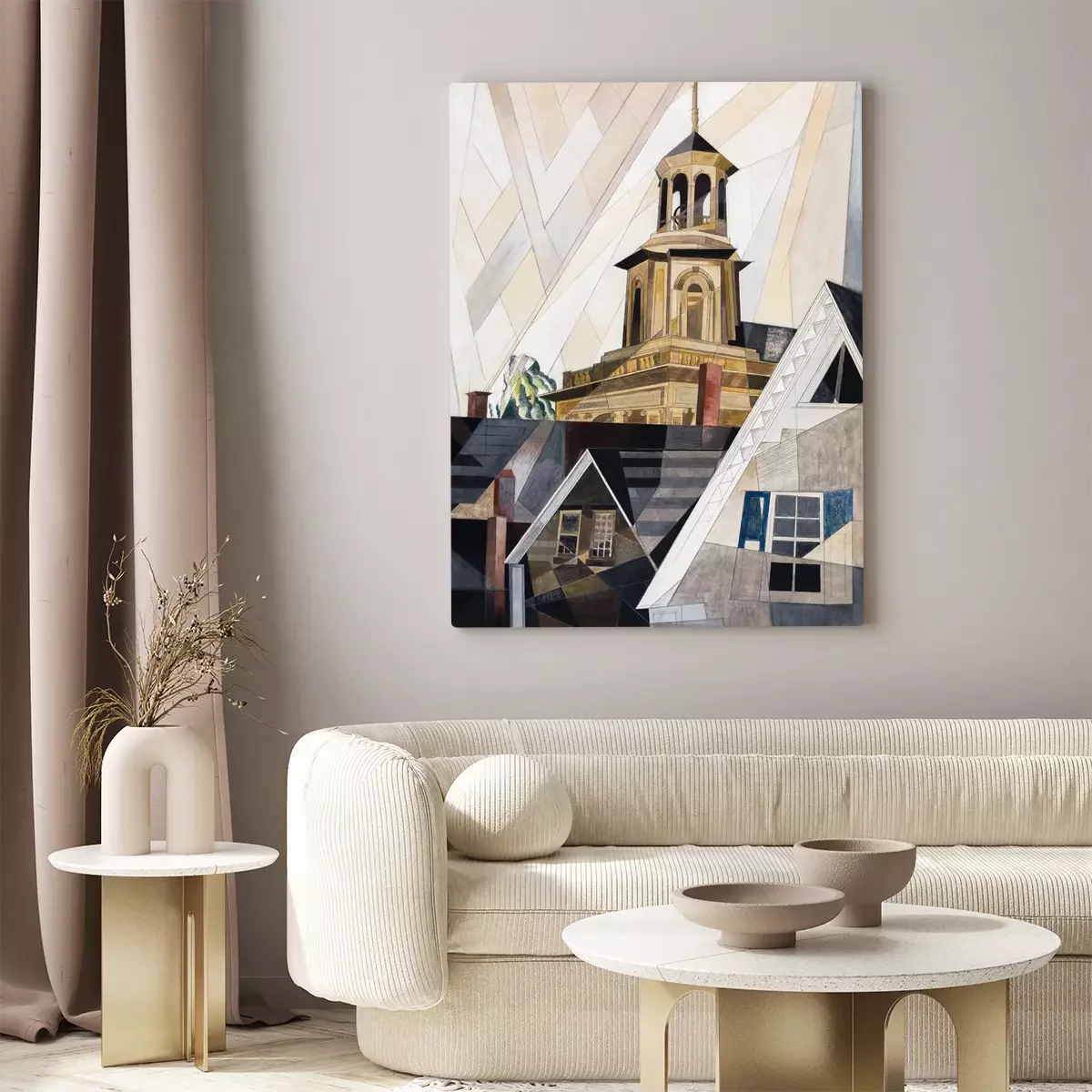 Bâtiments cubistes avec une tour se détachant sur un ciel lumineux