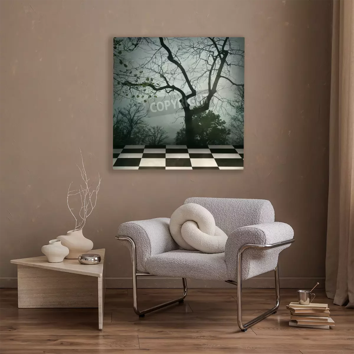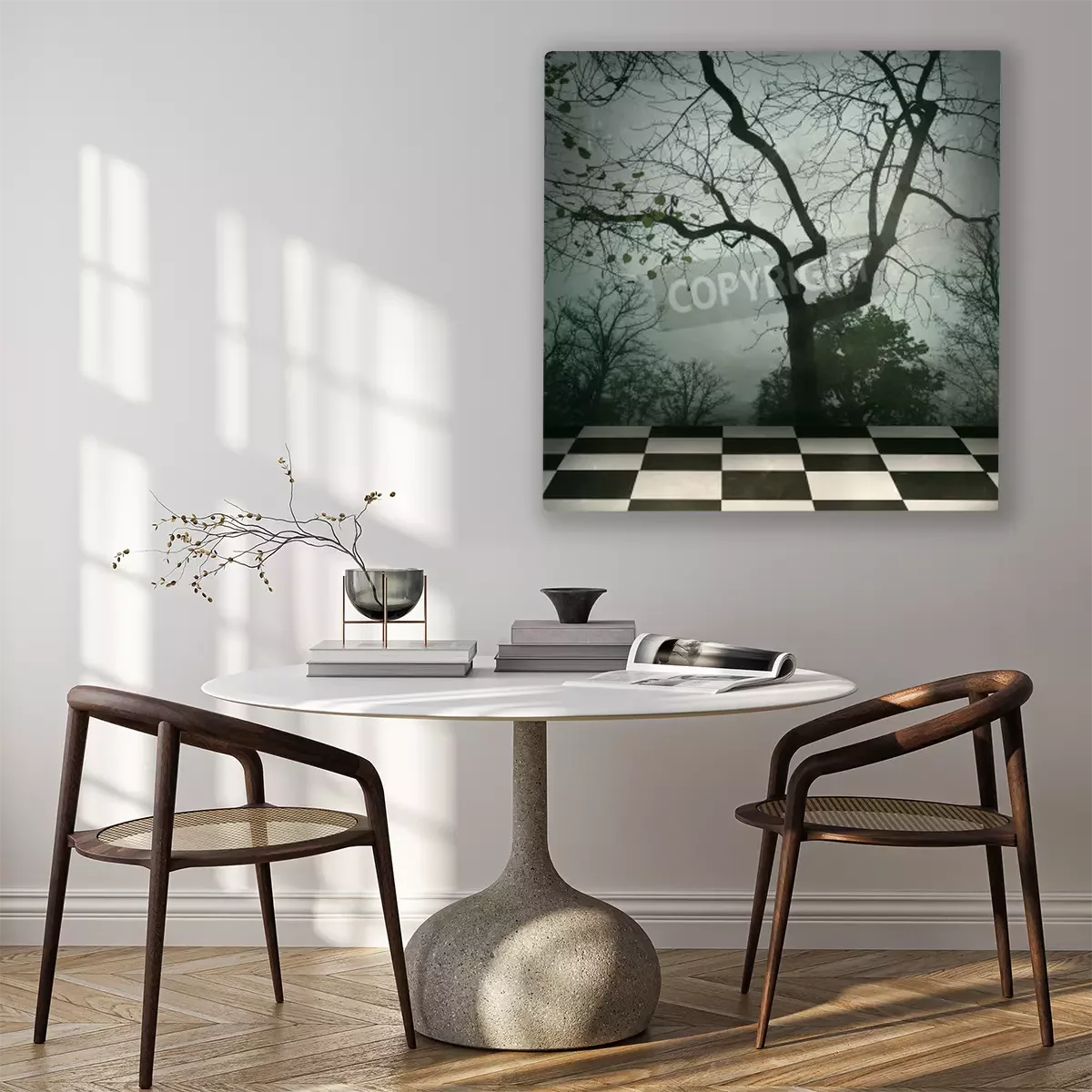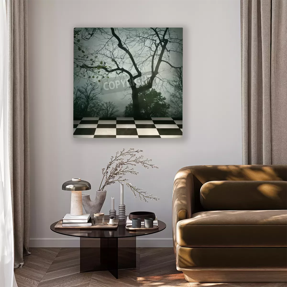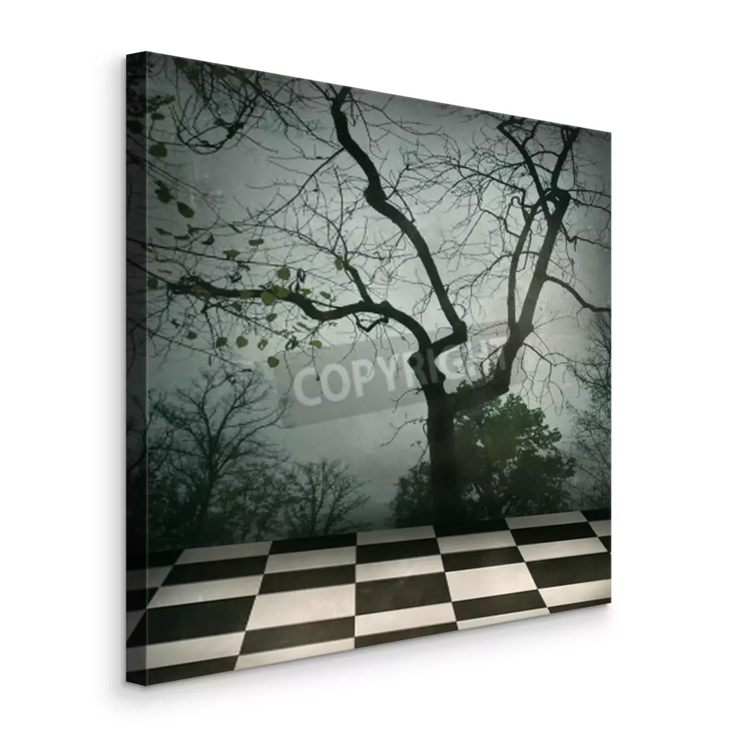 Tableau  Beau fond surréaliste d'arbres et blanc plancher de carreaux en noir et un style grungy