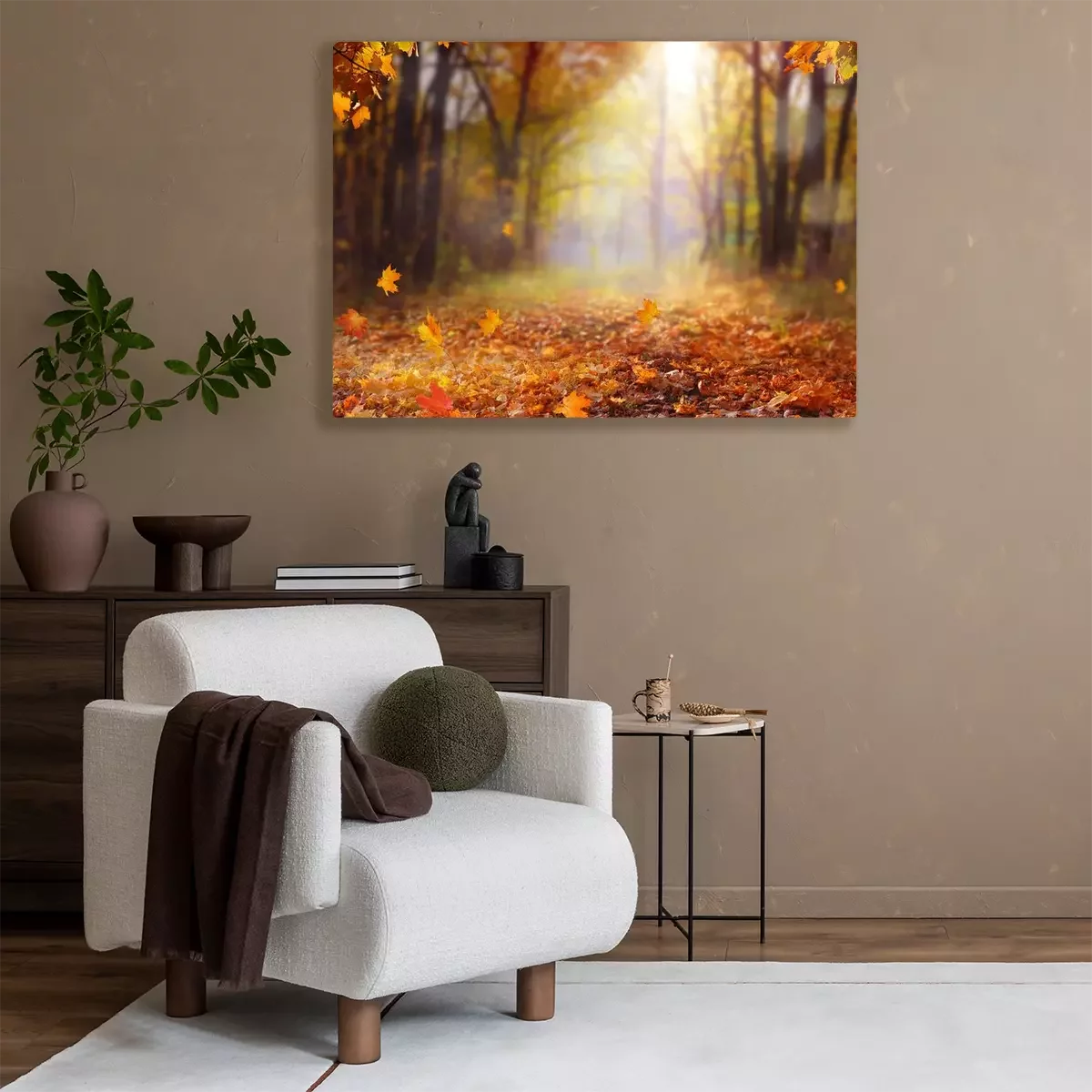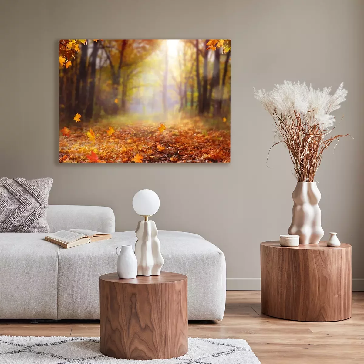 Tableau : Beautiful autumn landscape with yellow trees and sun. Colorful foliage in the park. Falling leaves natural background .Autumn season concept
