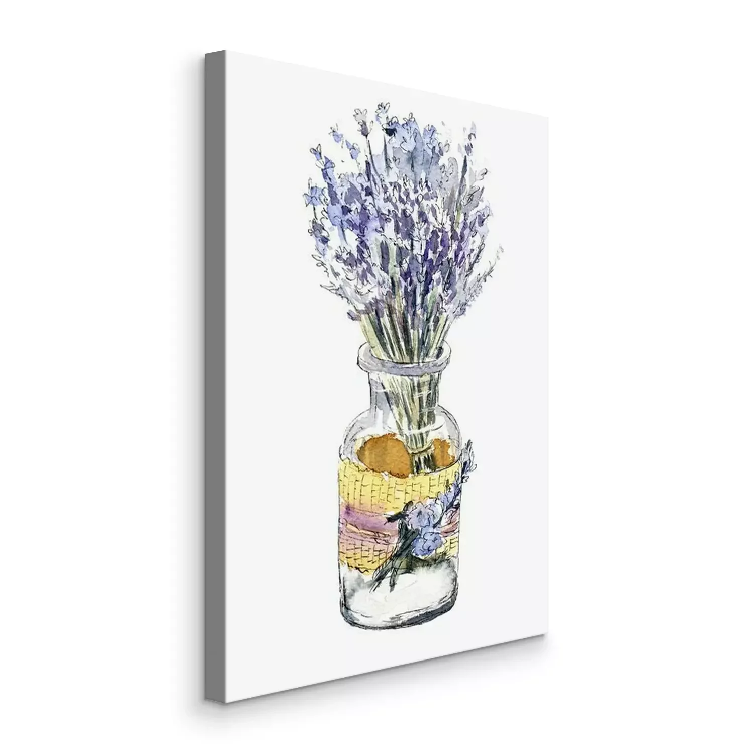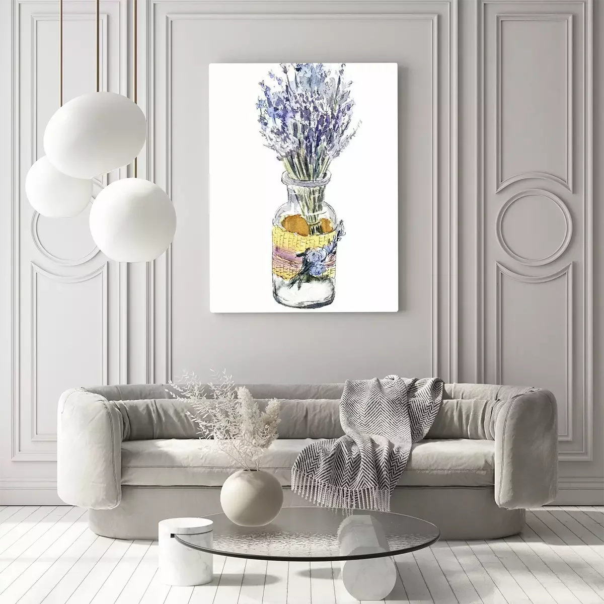 Tableau  Beautiful bouquet of lavender in a glass bottle. Watercolor illustration on white background