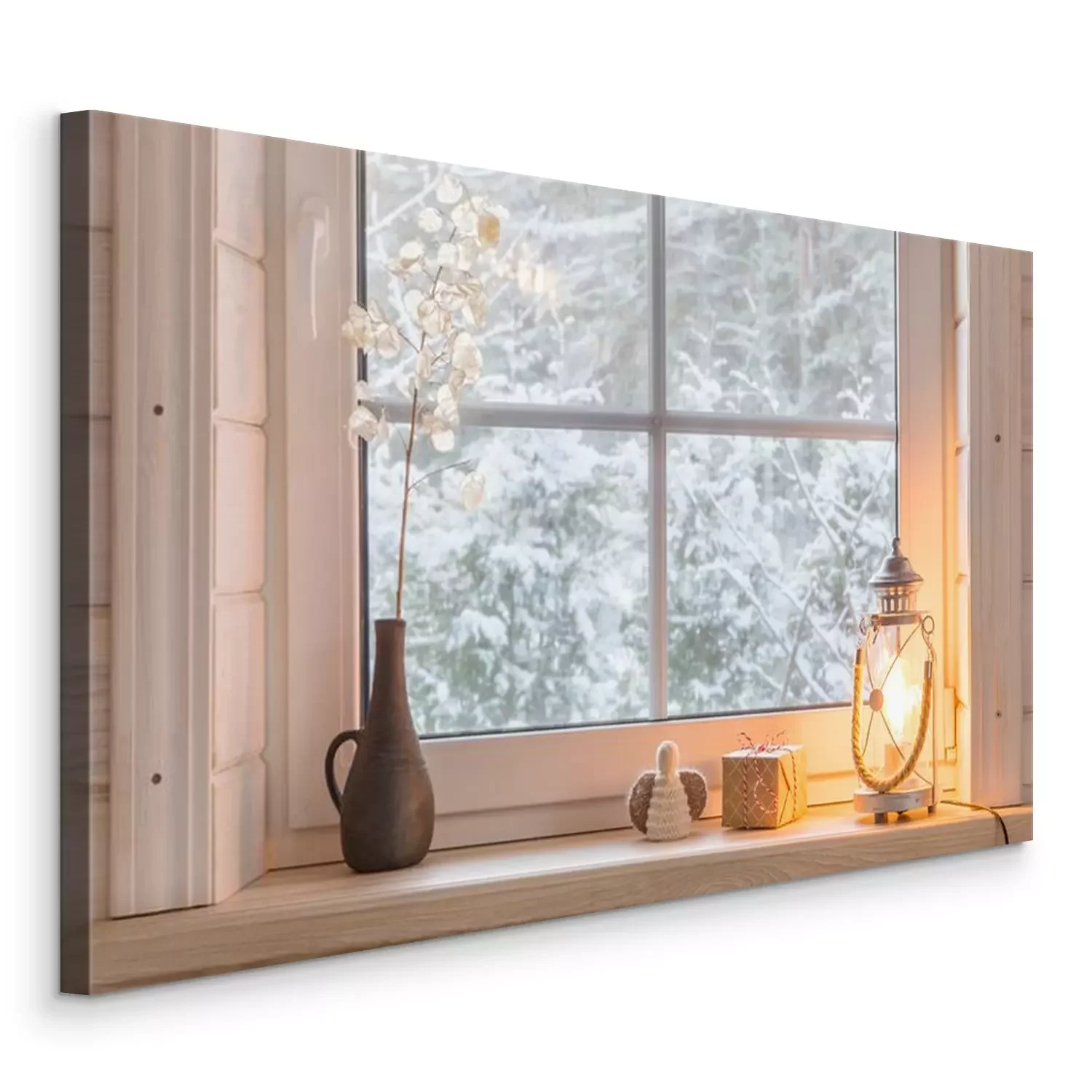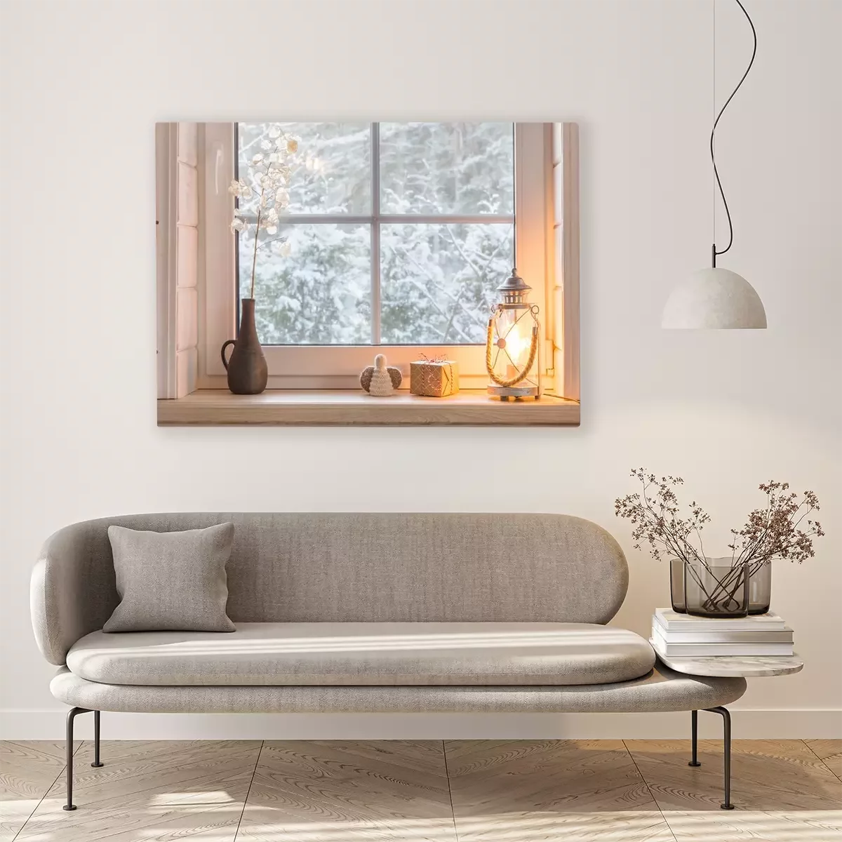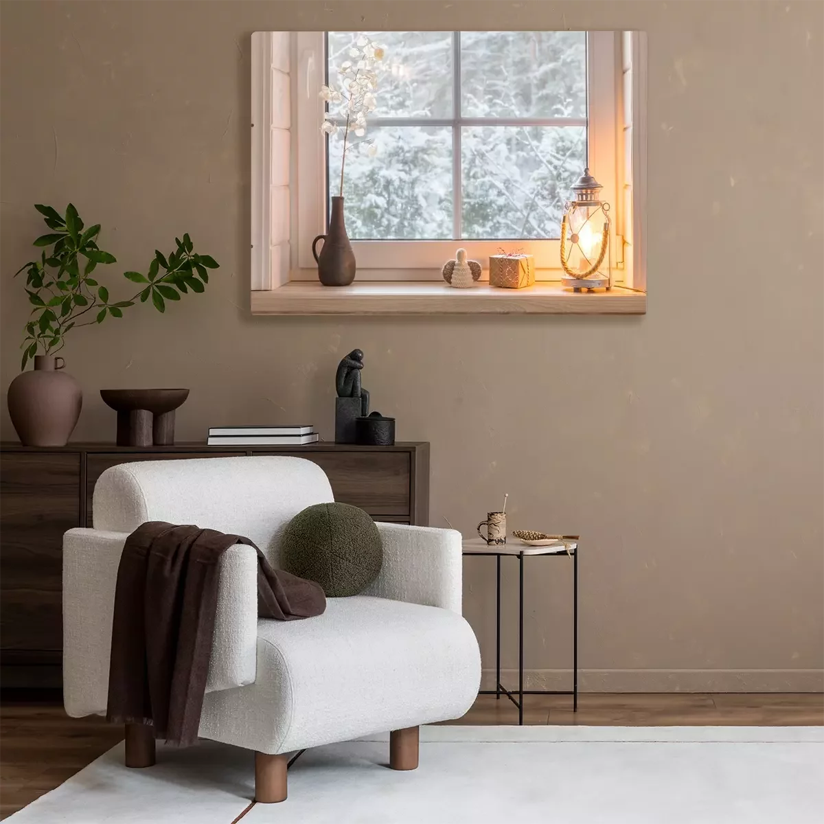 Tableau  Beautiful burning candles and fairy lights on windowsill indoors