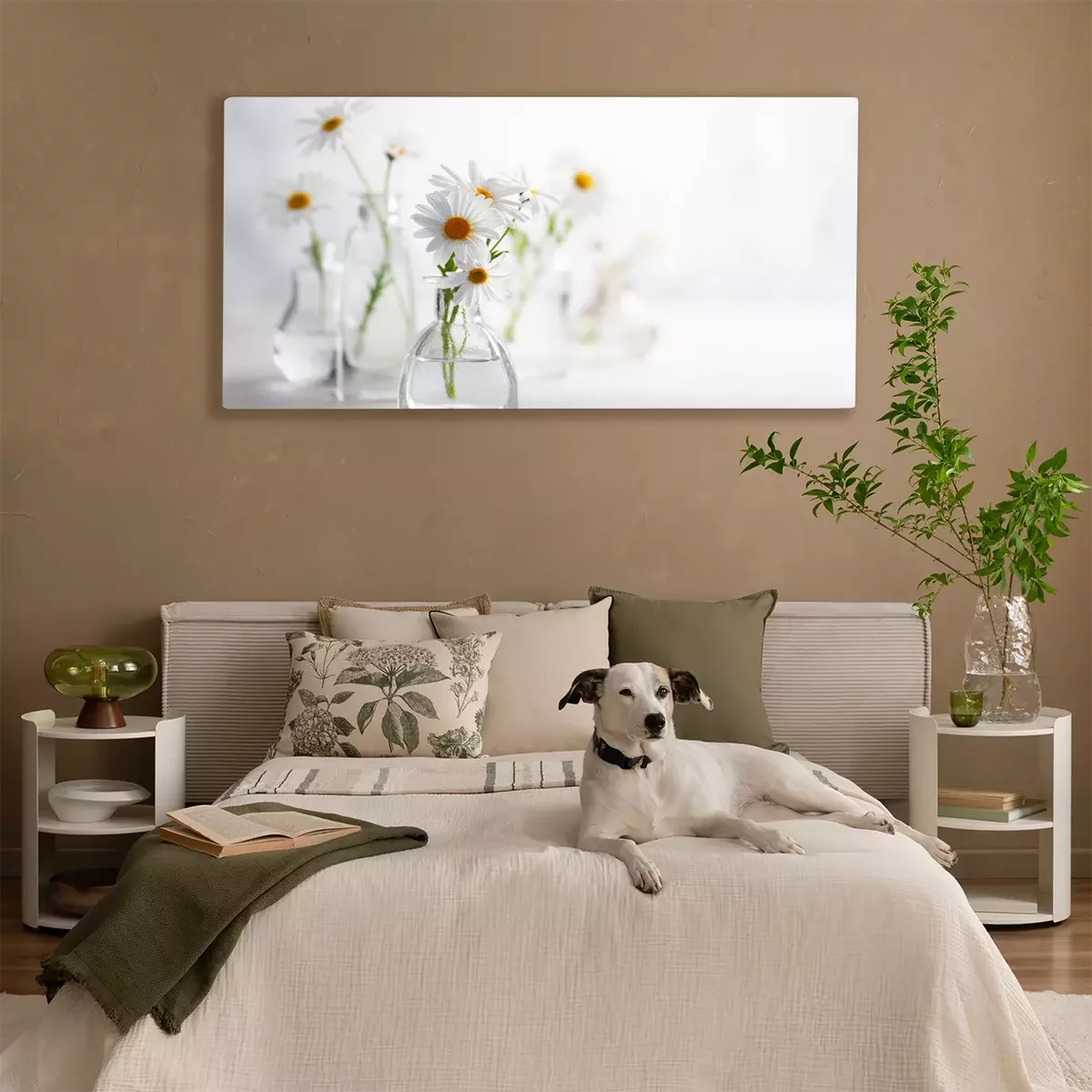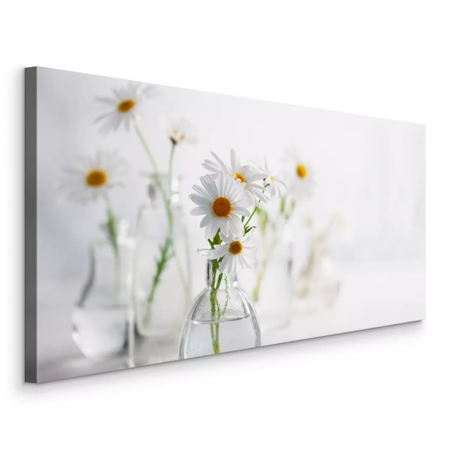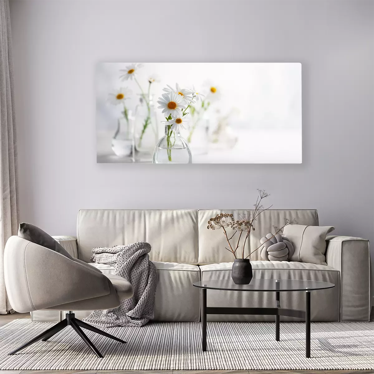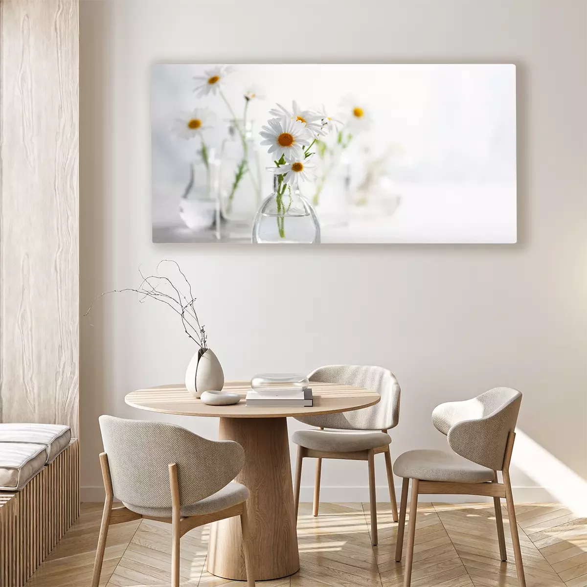 Tableau : Beautiful daisy flowers in glass vases on light background. Floral composition in home interior.