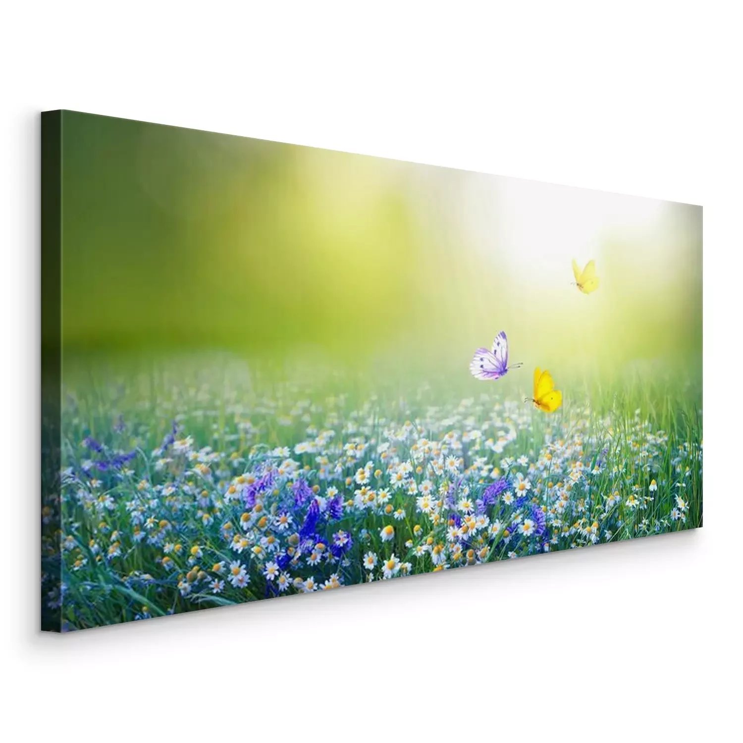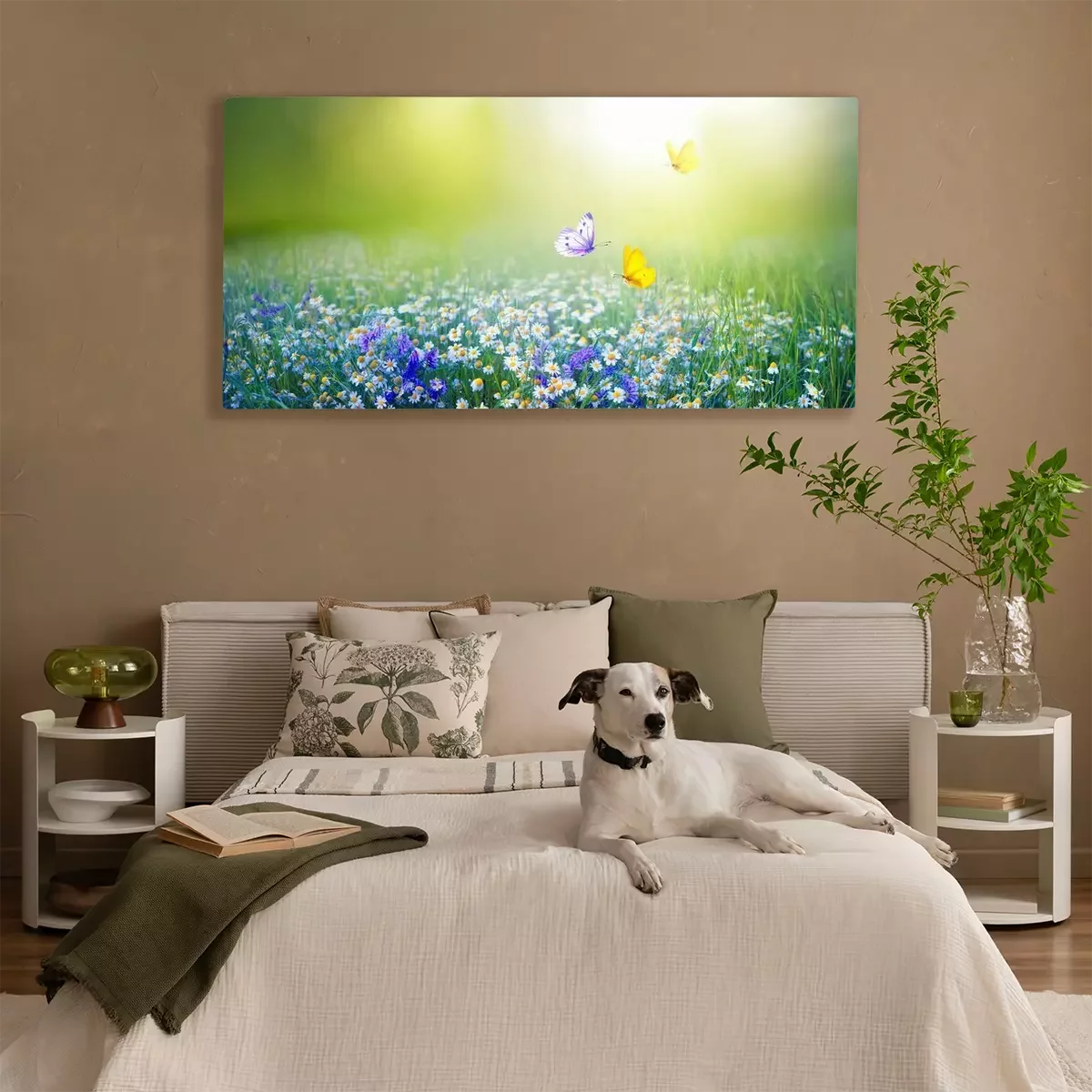 Tableau  Beautiful field meadow flowers chamomile and violet wild bells and three flying butterflies in morning green grass in sunlight, natural landscape. Delightful pastoral airy fresh artistic image nature.