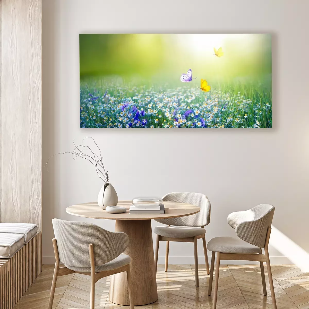 Tableau : Beautiful field meadow flowers chamomile and violet wild bells and three flying butterflies in morning green grass in sunlight, natural landscape. Delightful pastoral airy fresh artistic image nature.