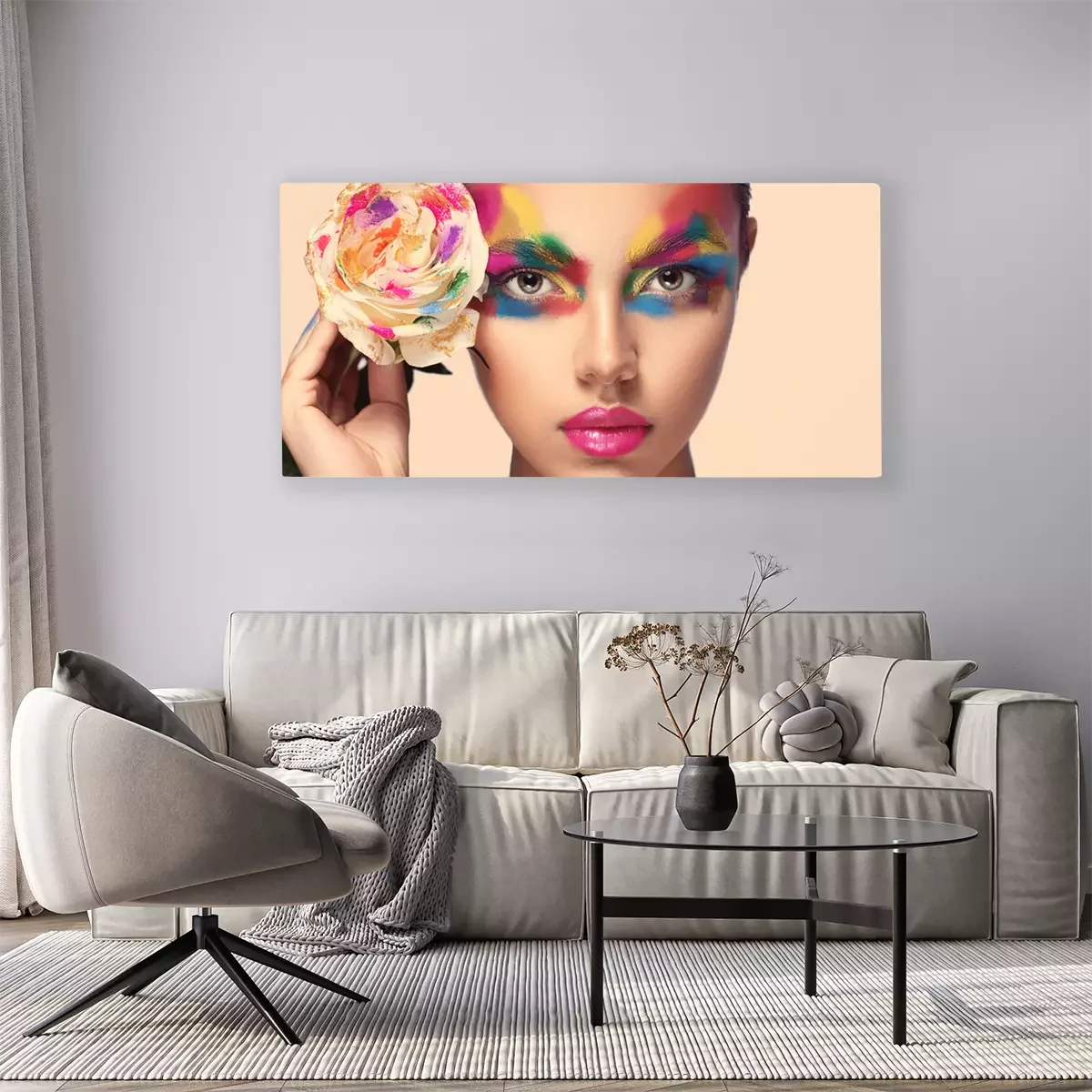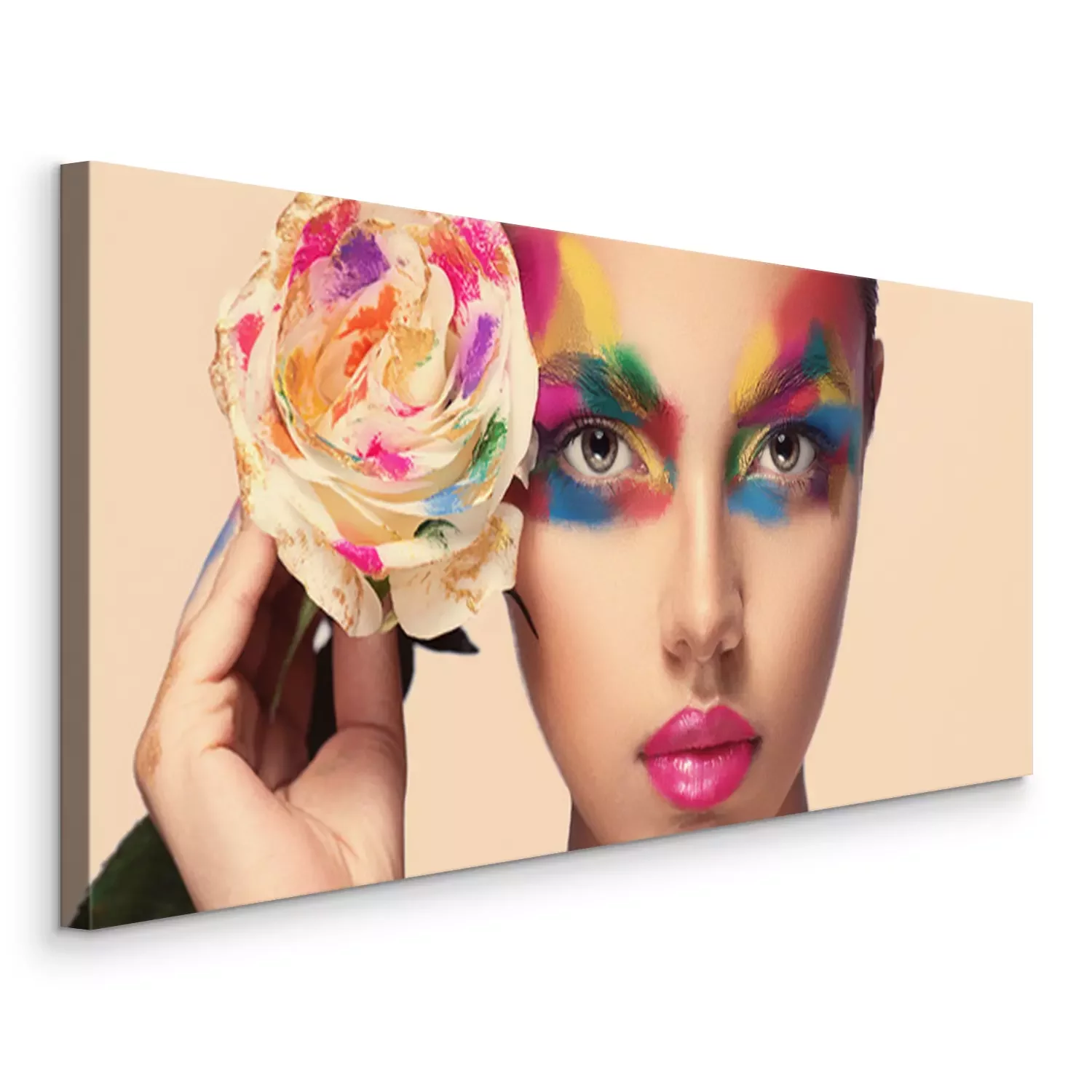 Tableau : Beautiful girl model with multi-colored paints on her face. Woman with rose flower and bright color make-up. Cosmetics, beauty and makeup. Spring and summer flowering shopping