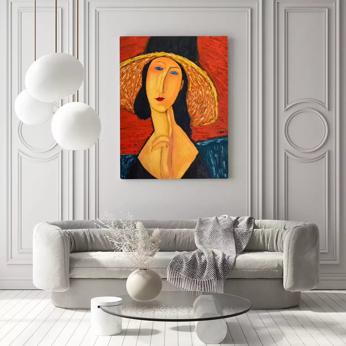 Tableau  Beautiful Image Oil portrait On Canvas. Portrait of a woman in a hat. On the motives of painting by Amedeo Modigliani