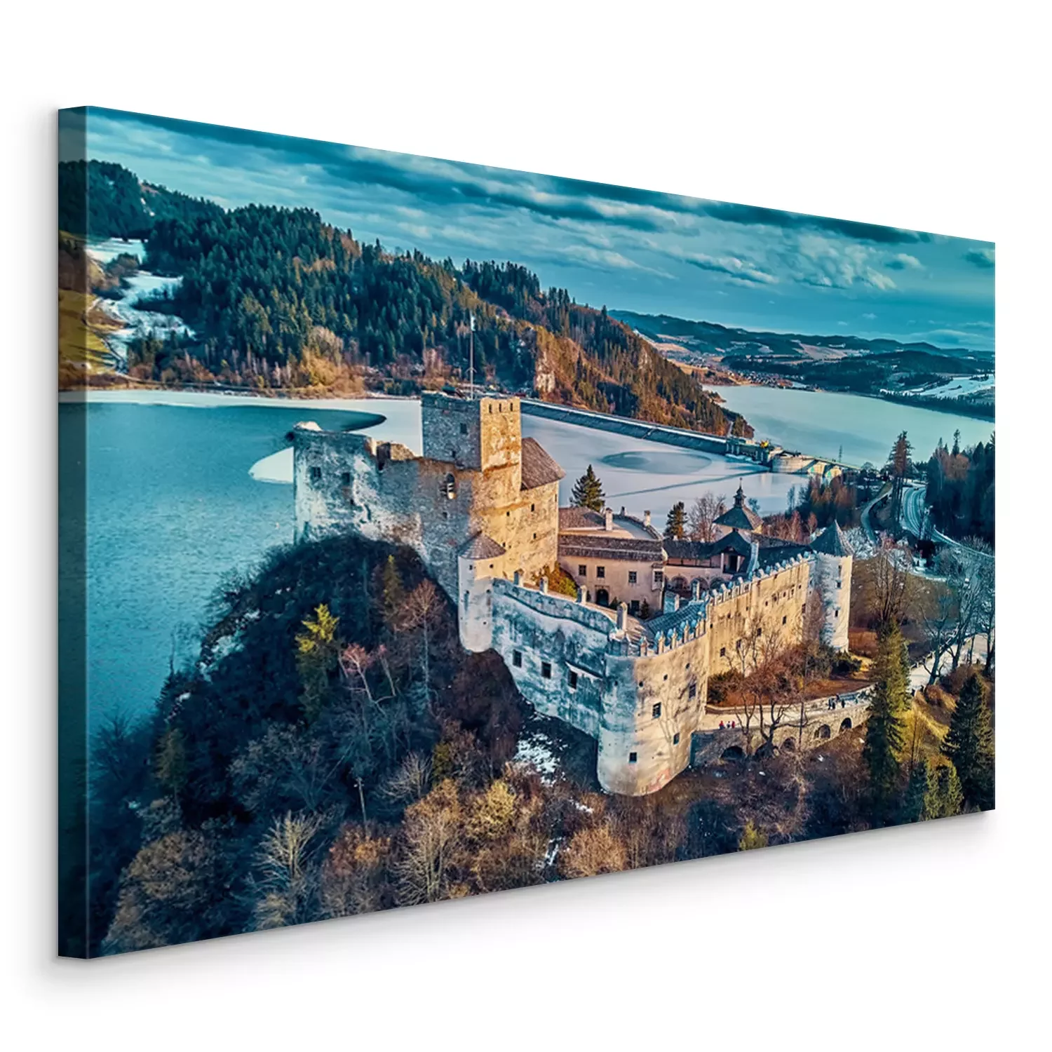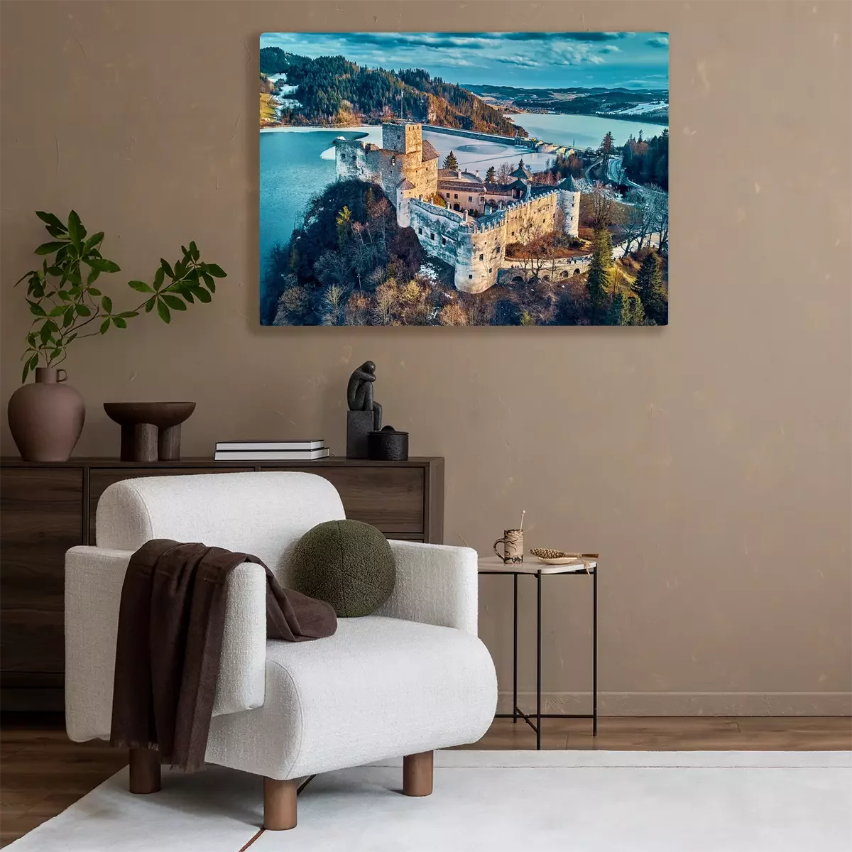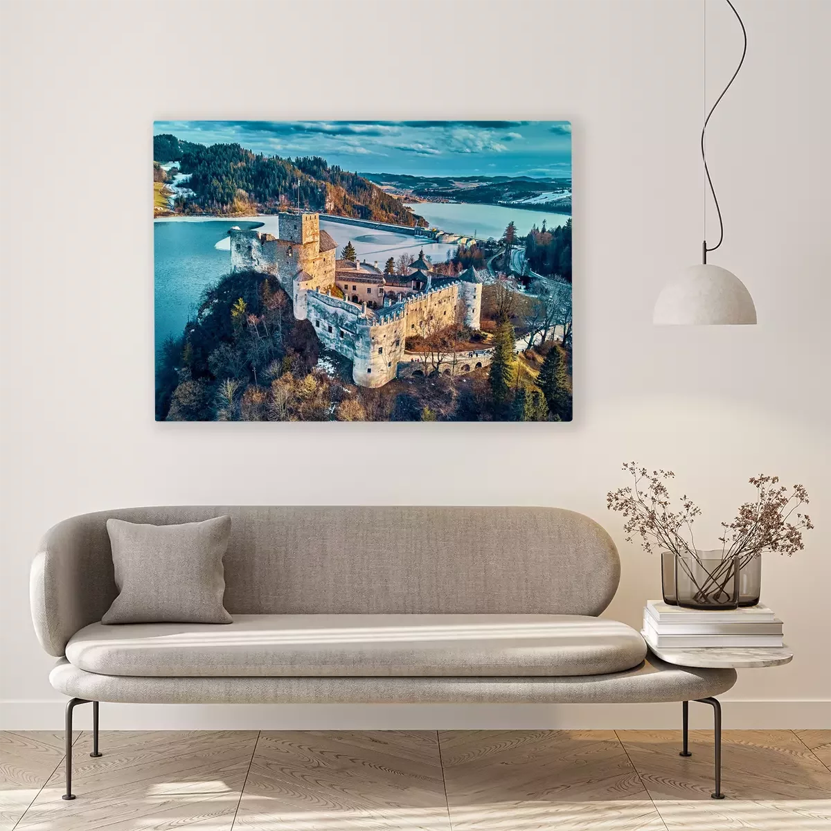 Tableau  Beautiful panoramic aerial drone view to the Niedzica Castle also known as Dunajec Castle, located in the southernmost part of Poland in Niedzica, Nowy Targ County, Dunajec River, Lake Czorsztyn