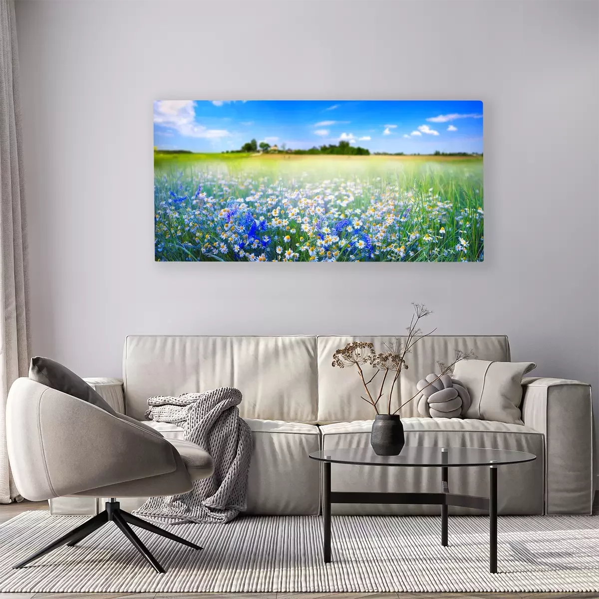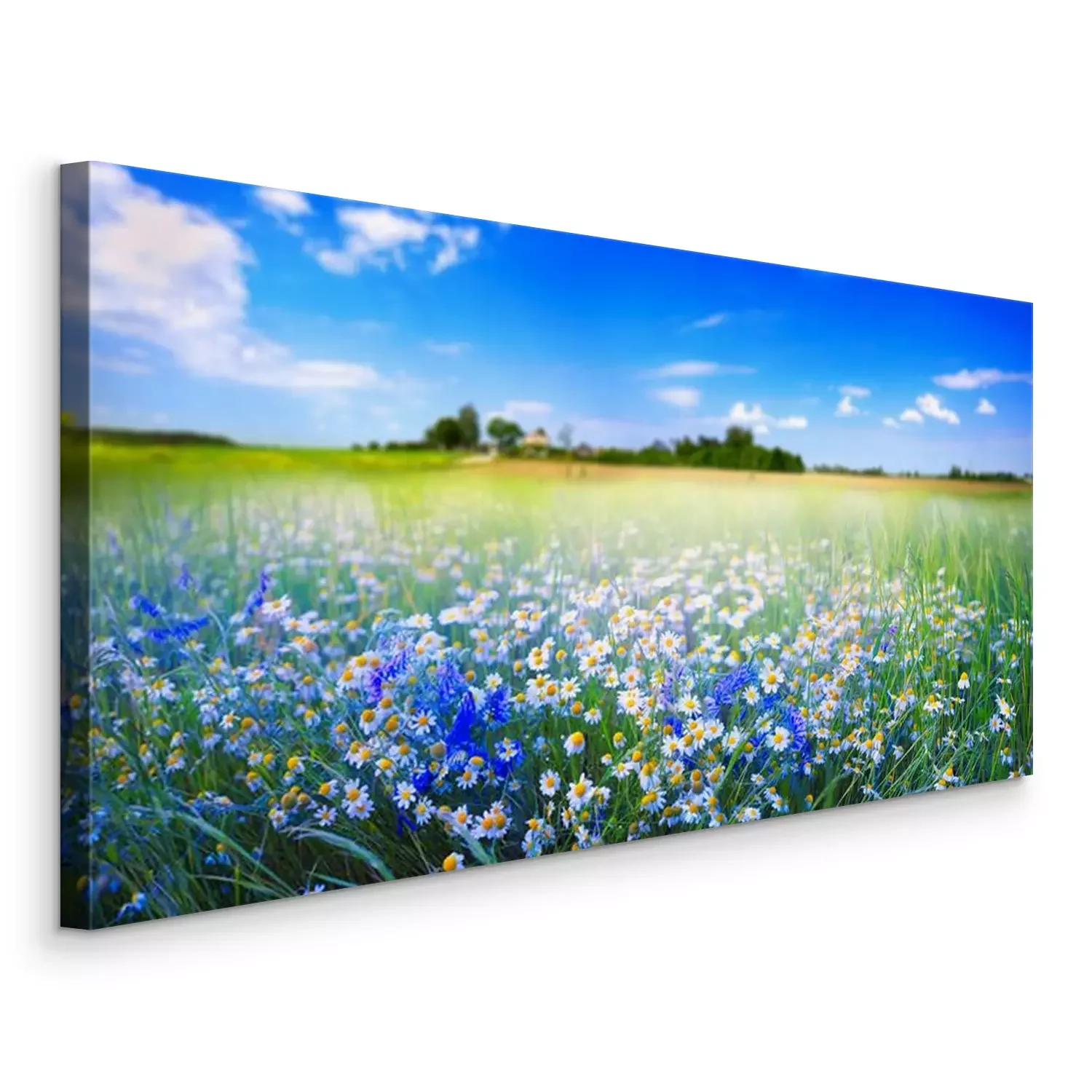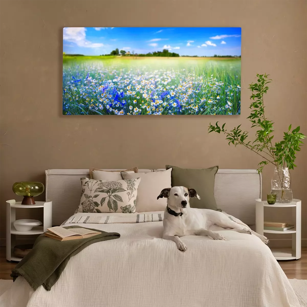 Tableau  Beautiful pastoral natural spring summer landscape with daisies and blue bells in field against blue sky with white clouds on sunny day. Chamomile in meadow in nature, panoramic view.