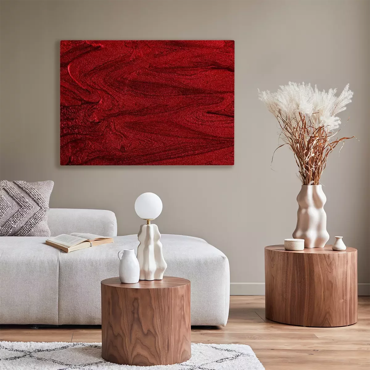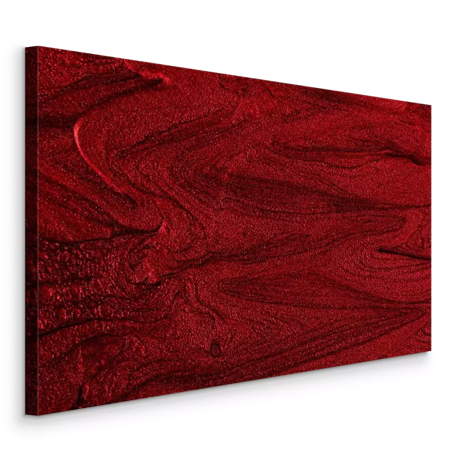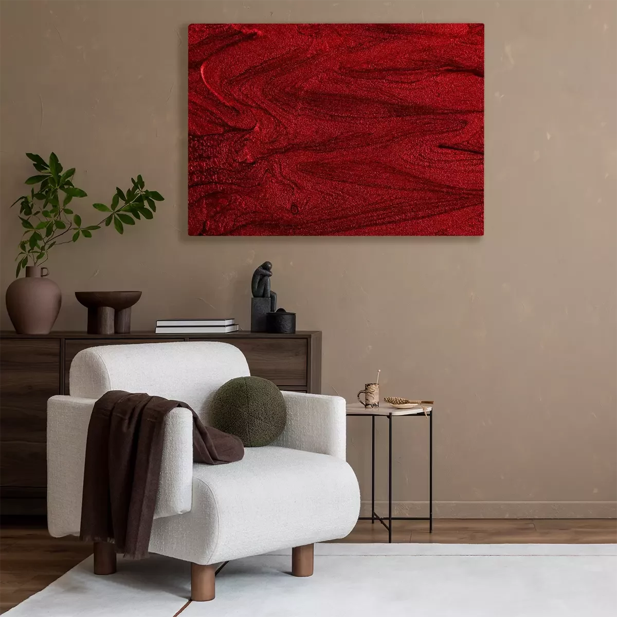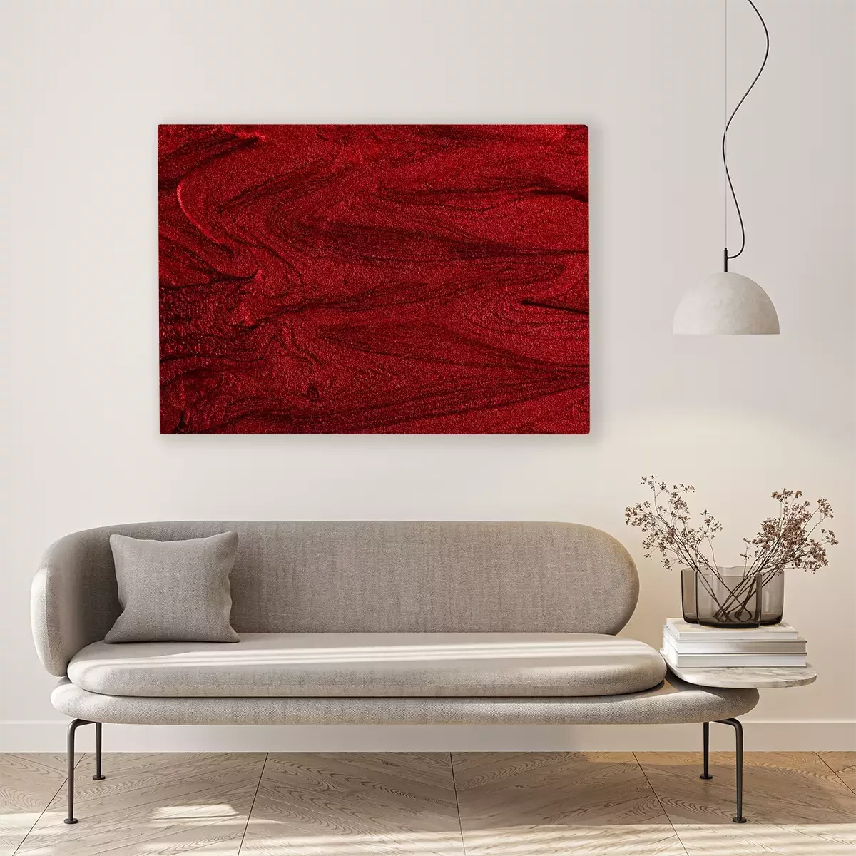 Tableau : Beautiful stains of liquid nail polish,fluid art technique.Bright red marble background.Liquid stripy paint texture.Nail laquer flow modern backdrop.Minimalistic concept.Copy space for design.