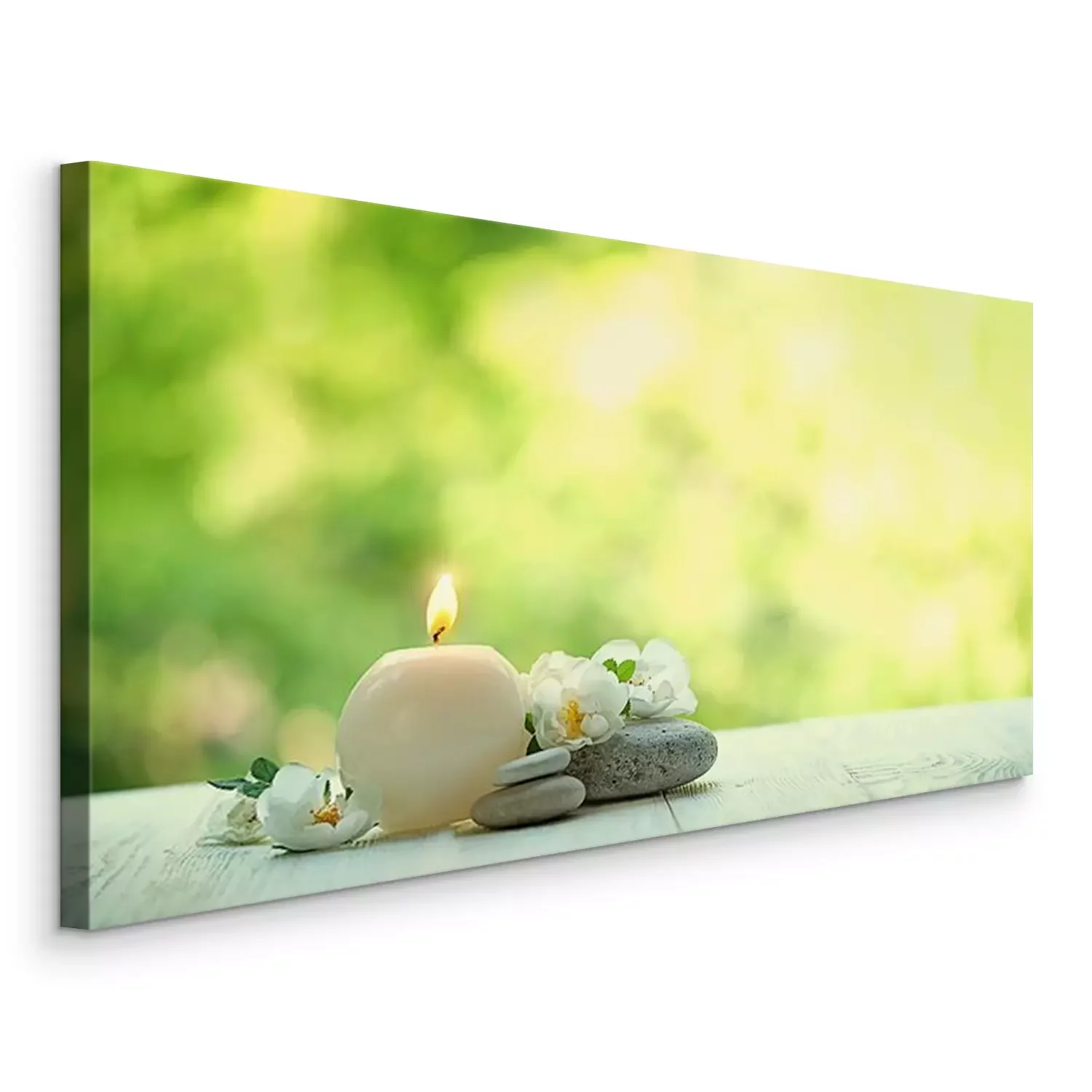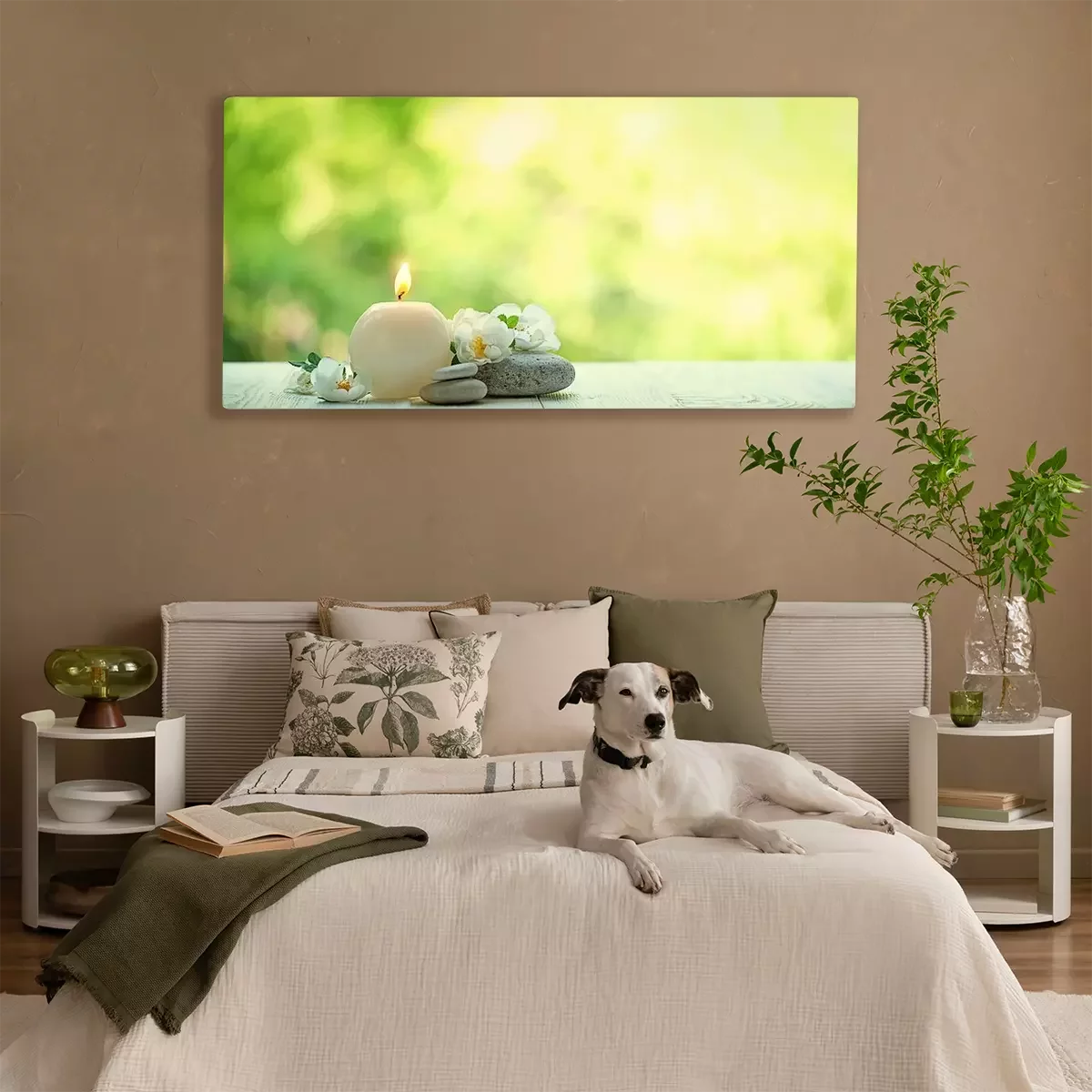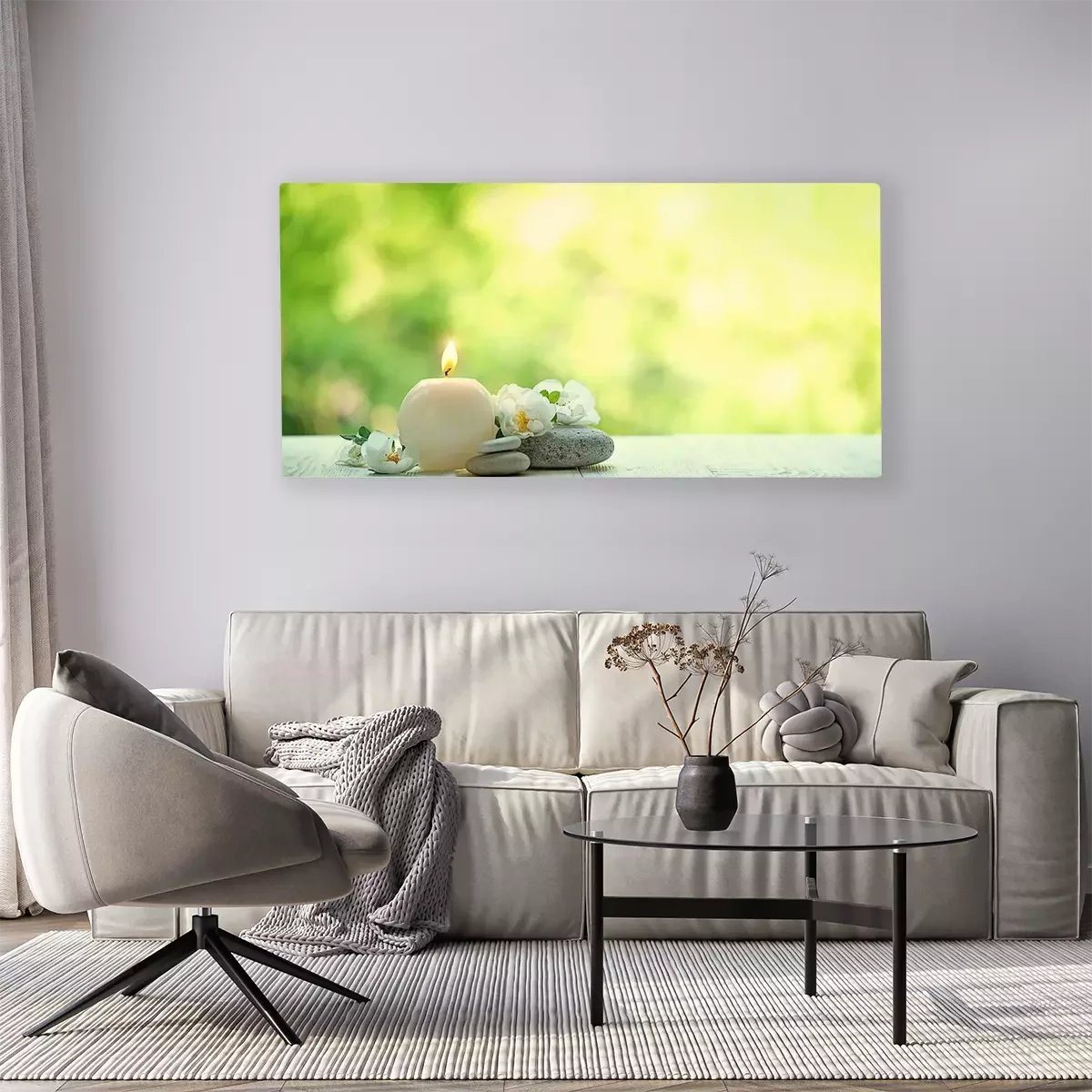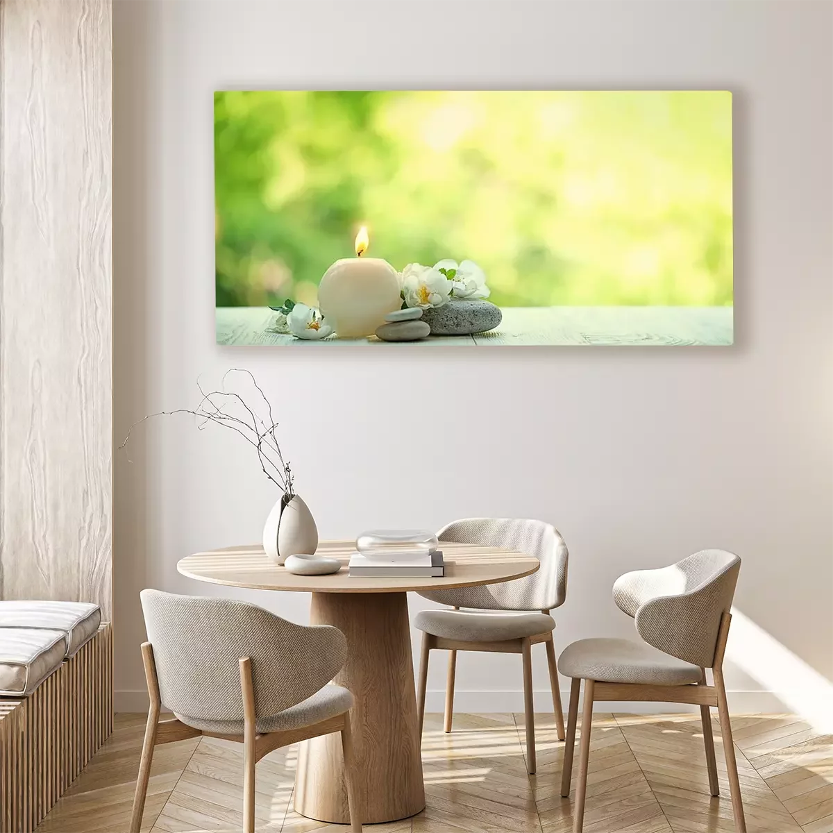 Tableau  beautiful tender scene with candle, flowers and stones. romantic still life. Relax still life with zen pebble stones, candle. spa wellness tranquil scene, soul equanimity calmnes concept. copy space