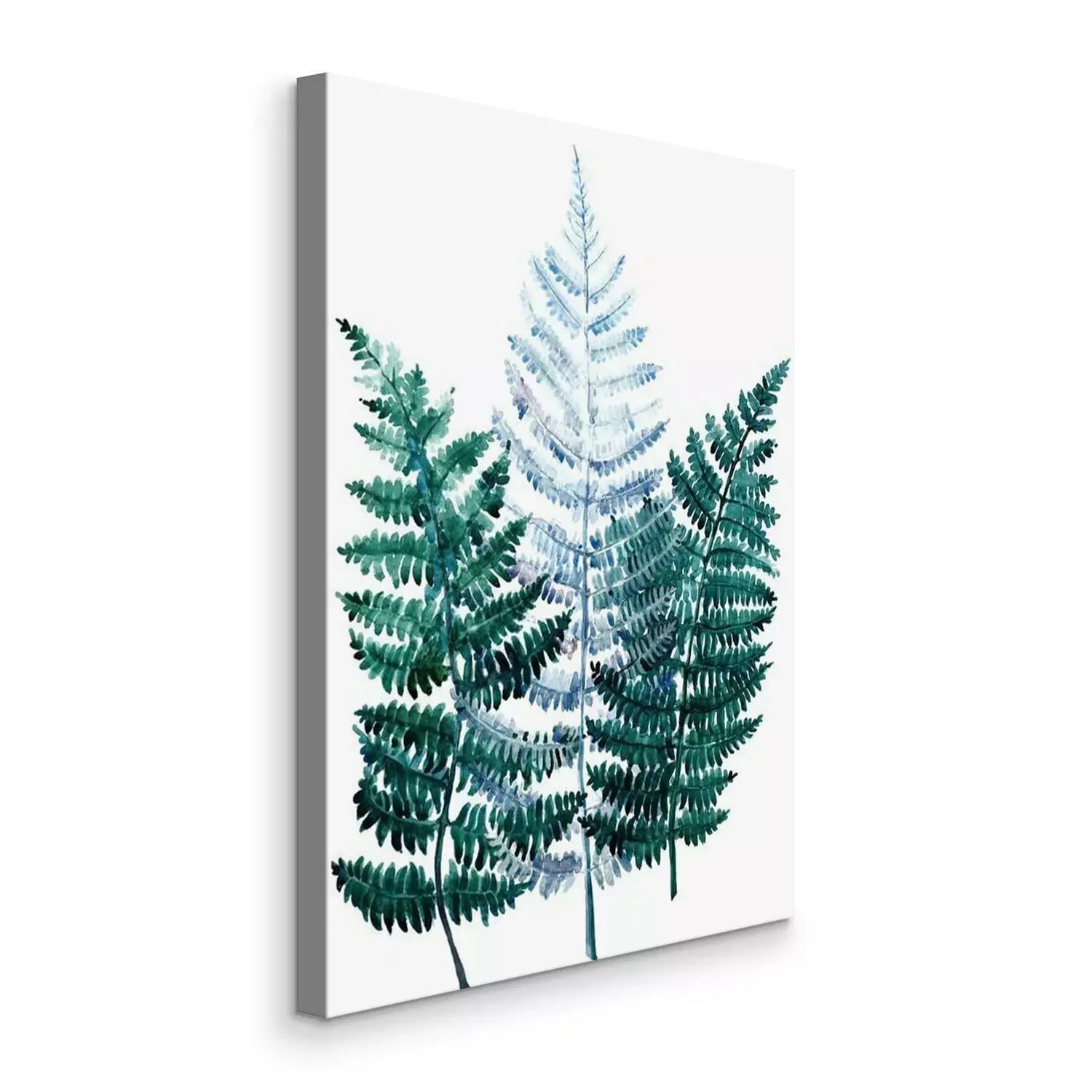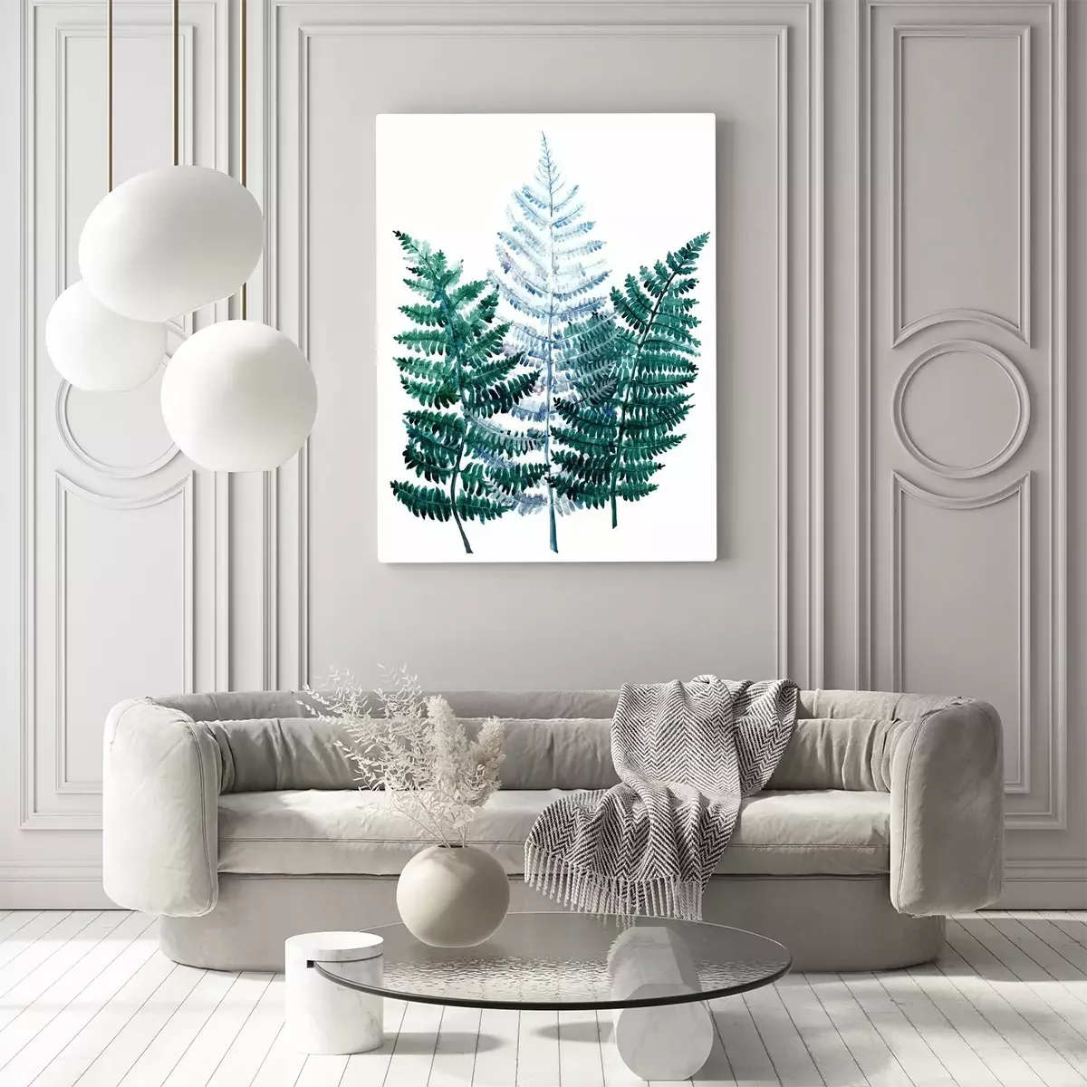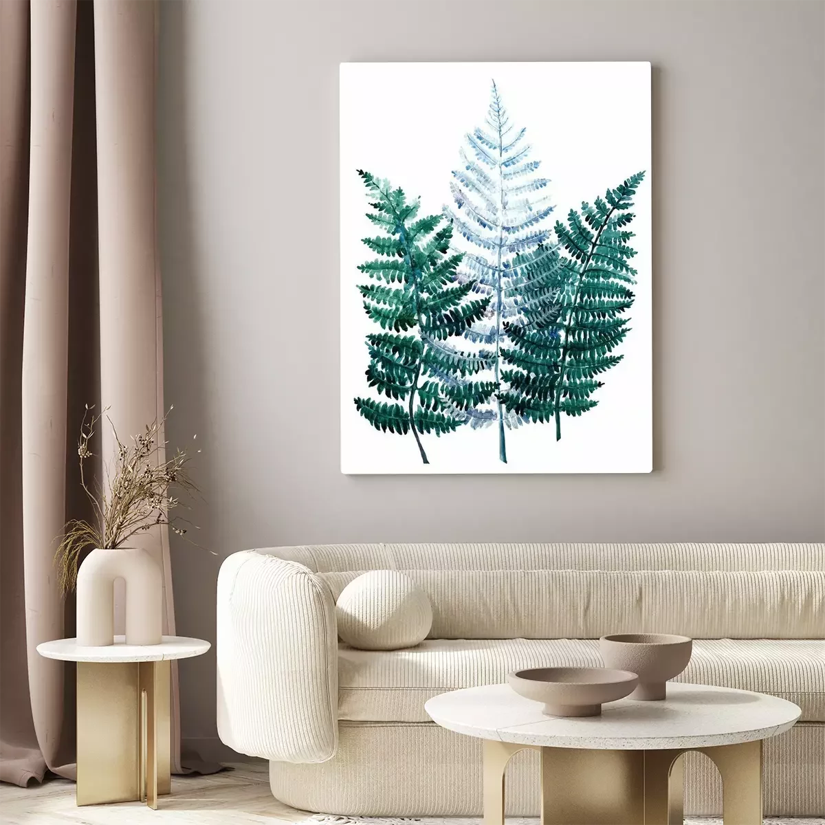 Tableau  Beautiful watercolor tropical leaves painted on white paper, top view