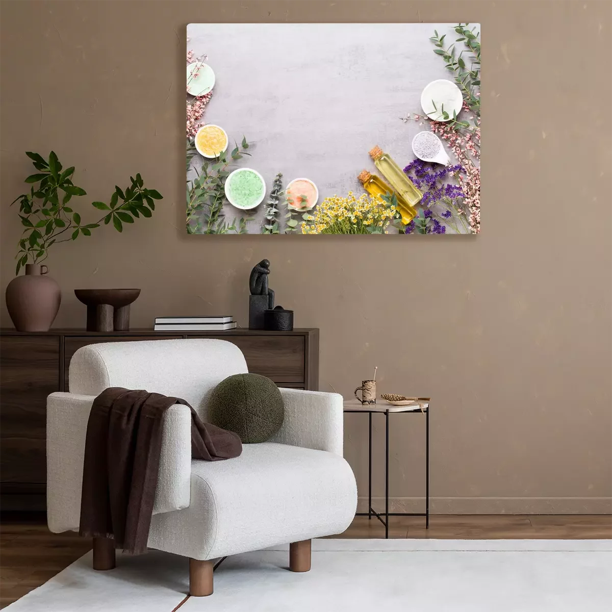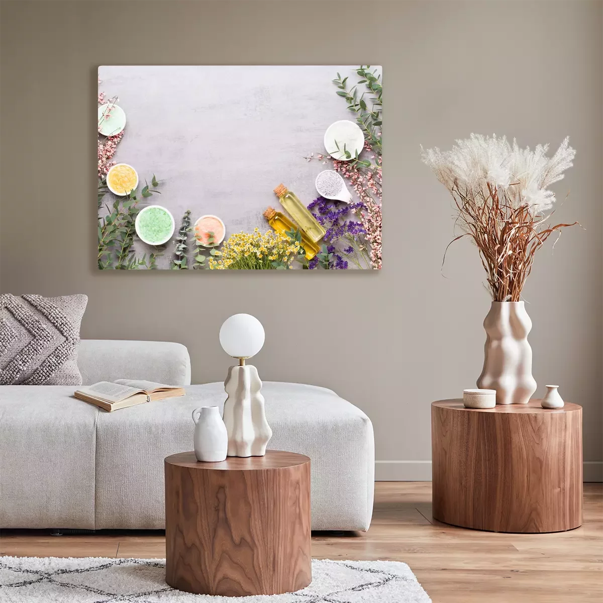 Tableau  Beauty and aromatherapy concept with spa set on pastel rustic wooden background.
