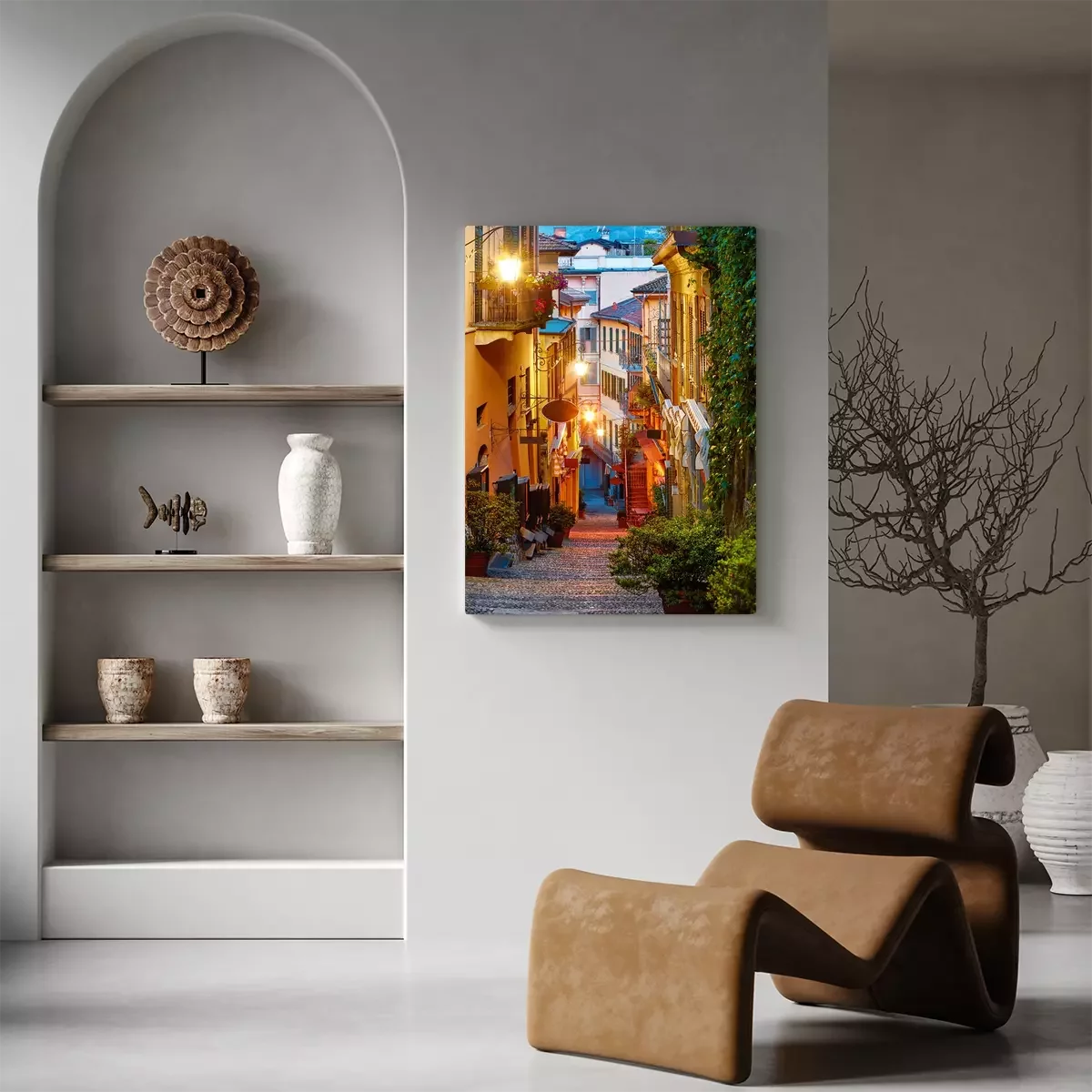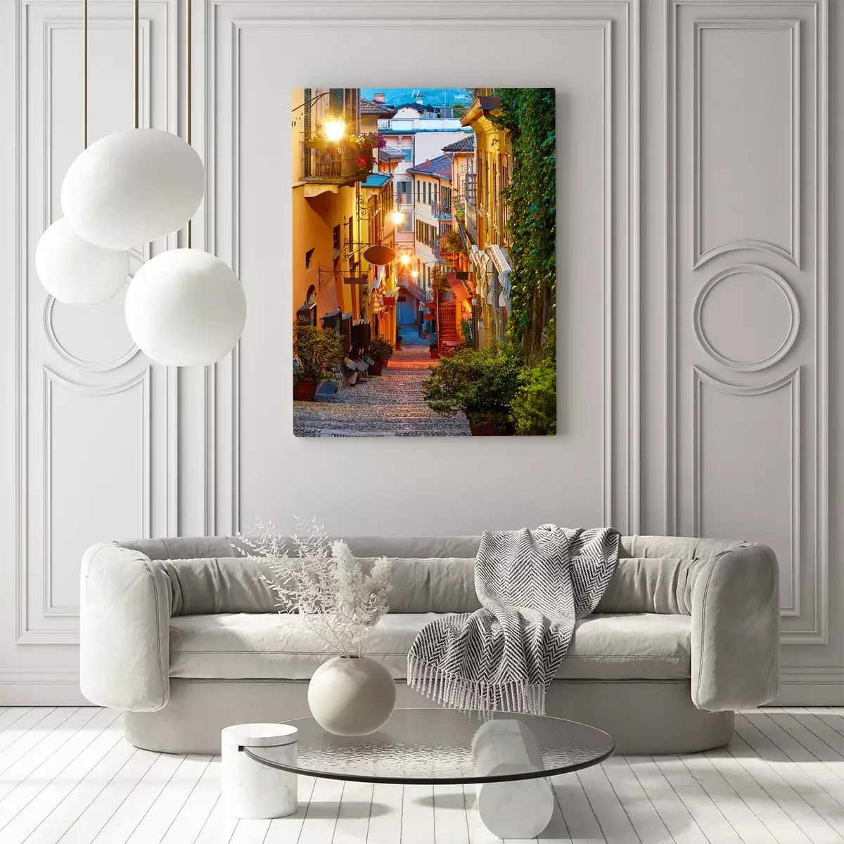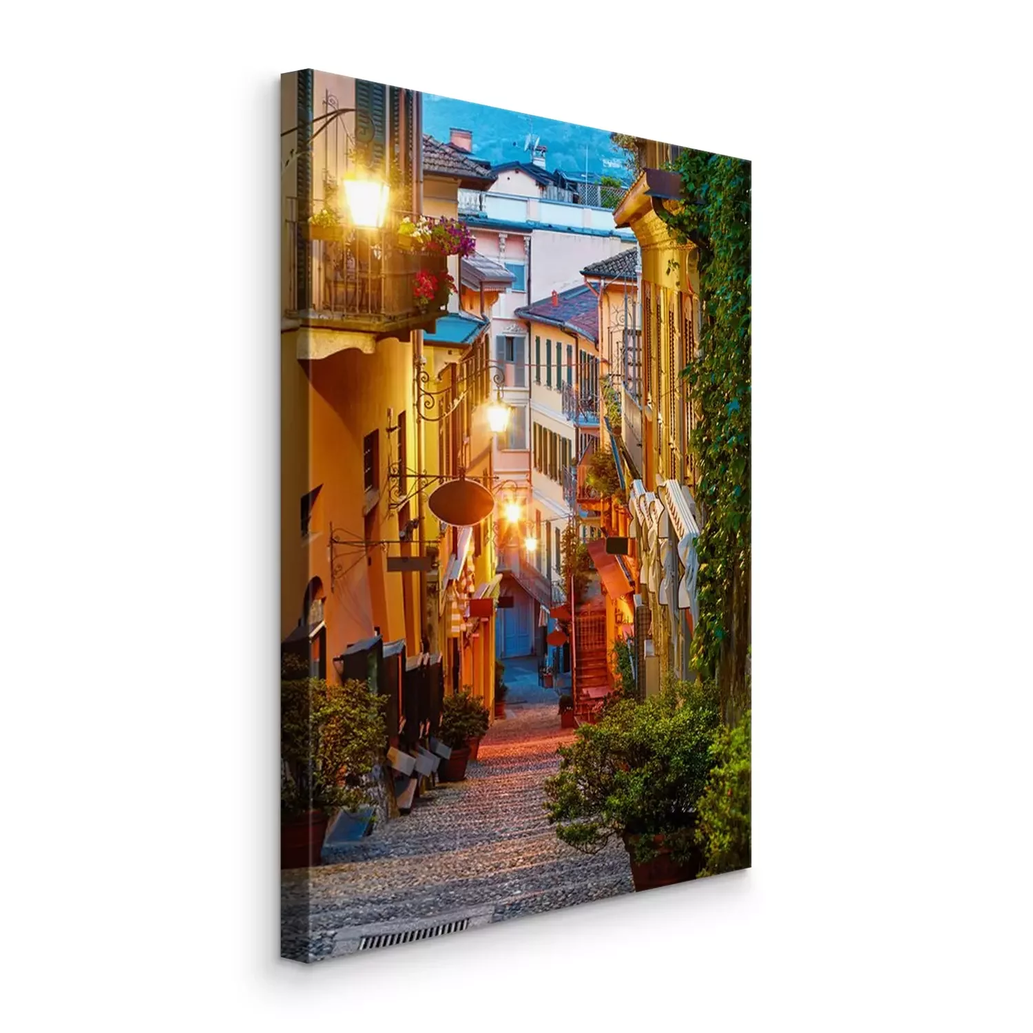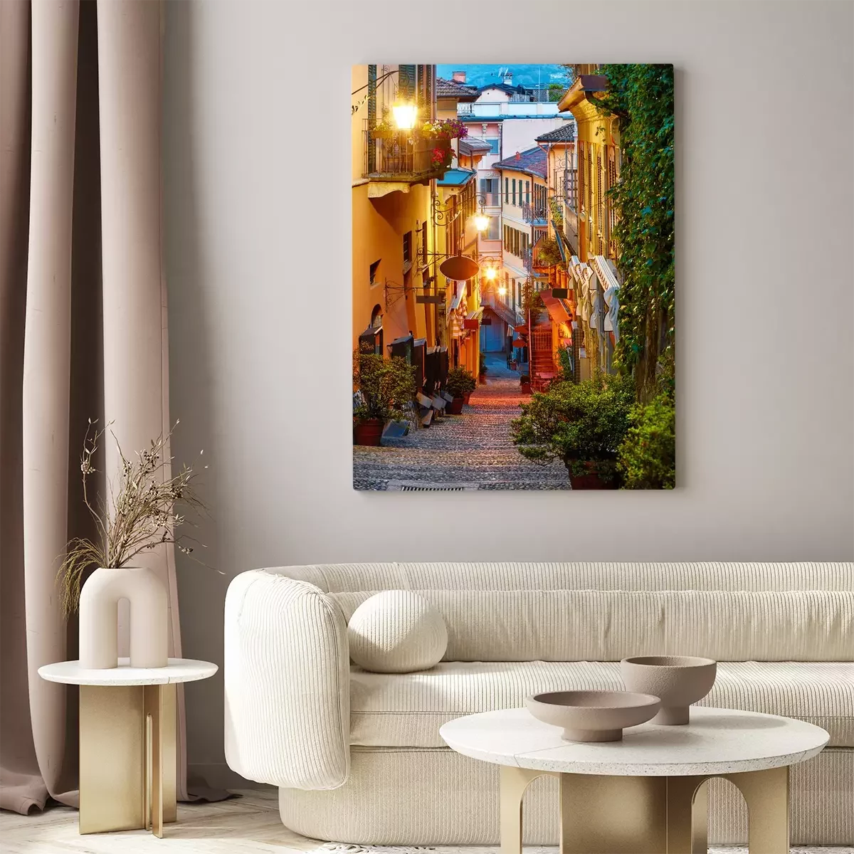 Tableau  Bellagio village at lake Como near Milan Italy, region Lombardy. Famous street with paving stones stairs and cosy restaurants during sunrise with glowing lanterns and green plants on old houses walls.