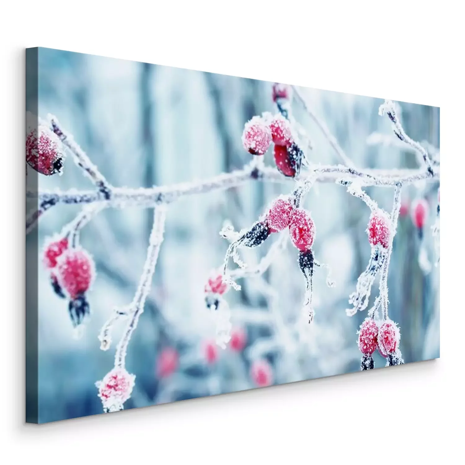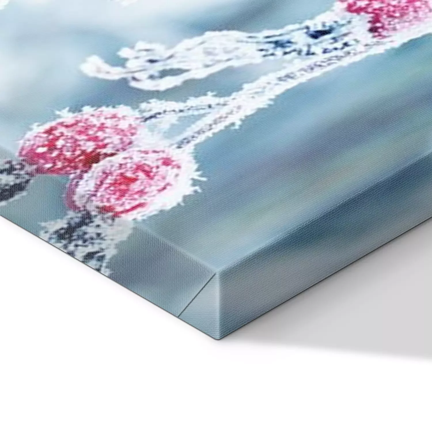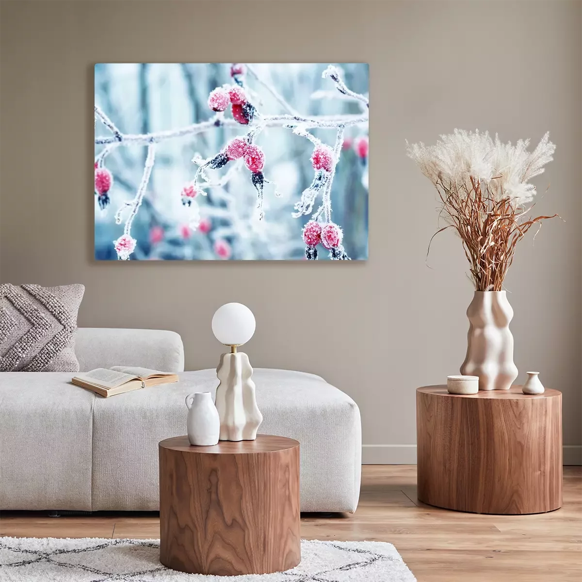 Tableau  belle branche colorée avec des baies rouges mûrs de rose sauvage recouverte de cristaux givrés blancs de givre dans le jardin d'hiver