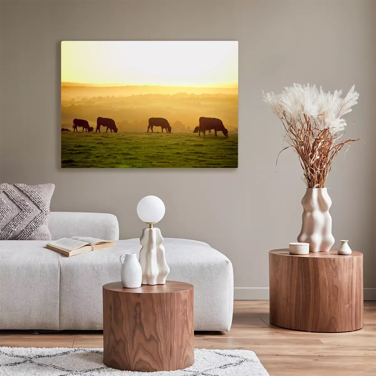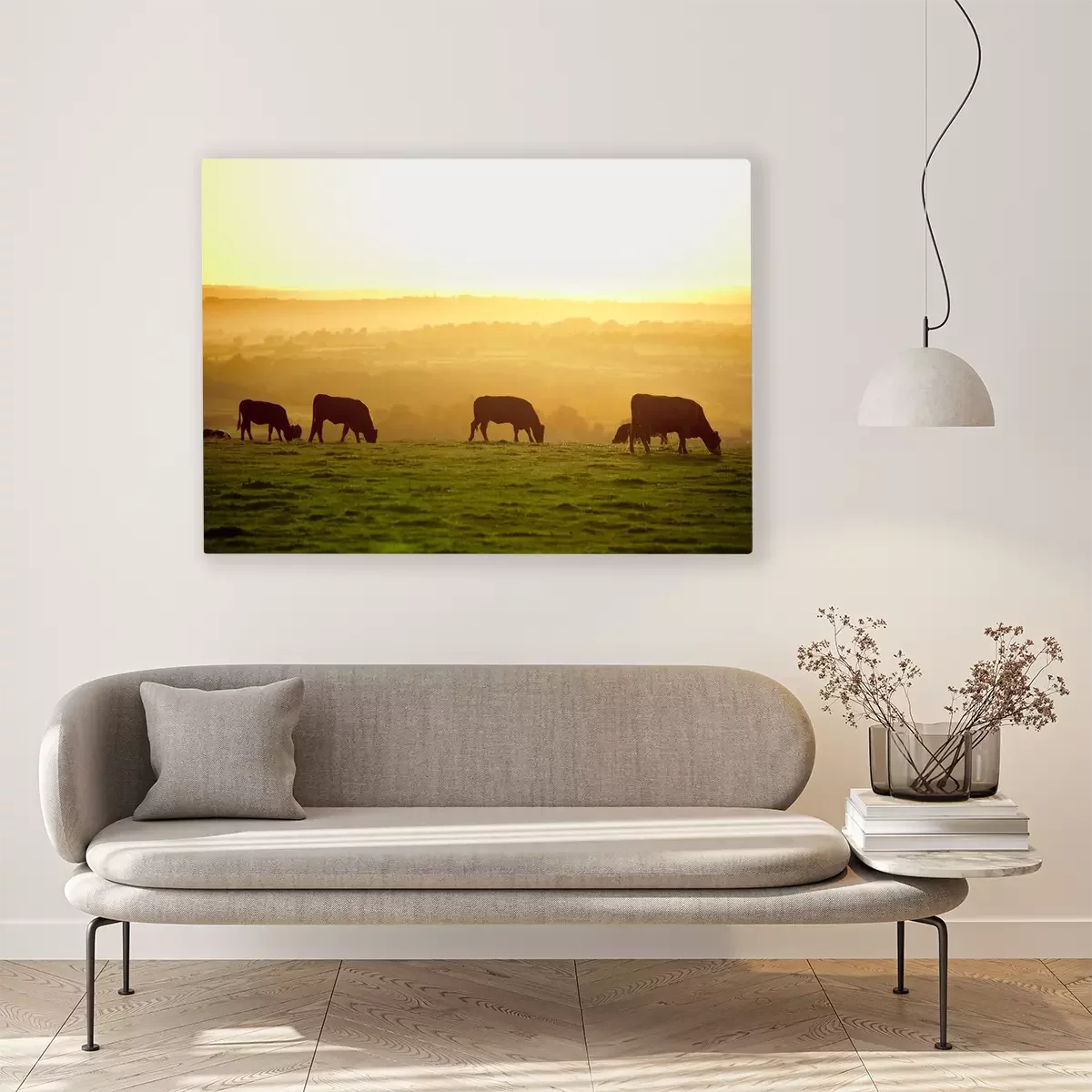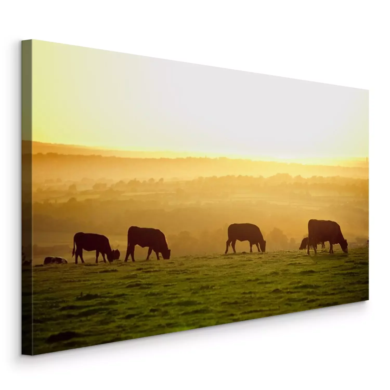 Tableau : Bétail sur un pâturage au coucher du soleil