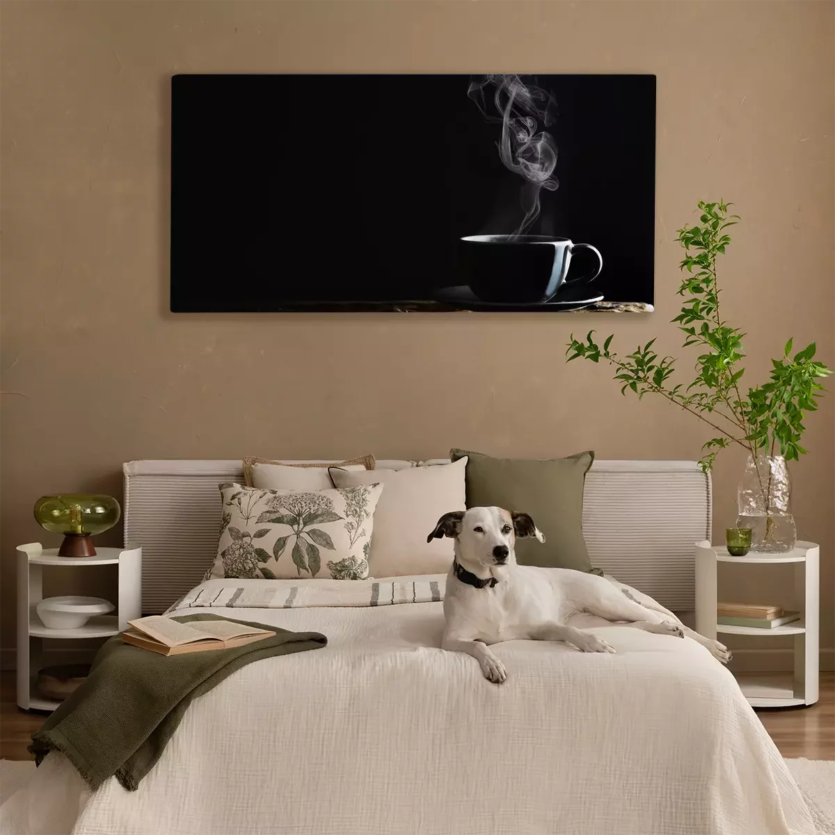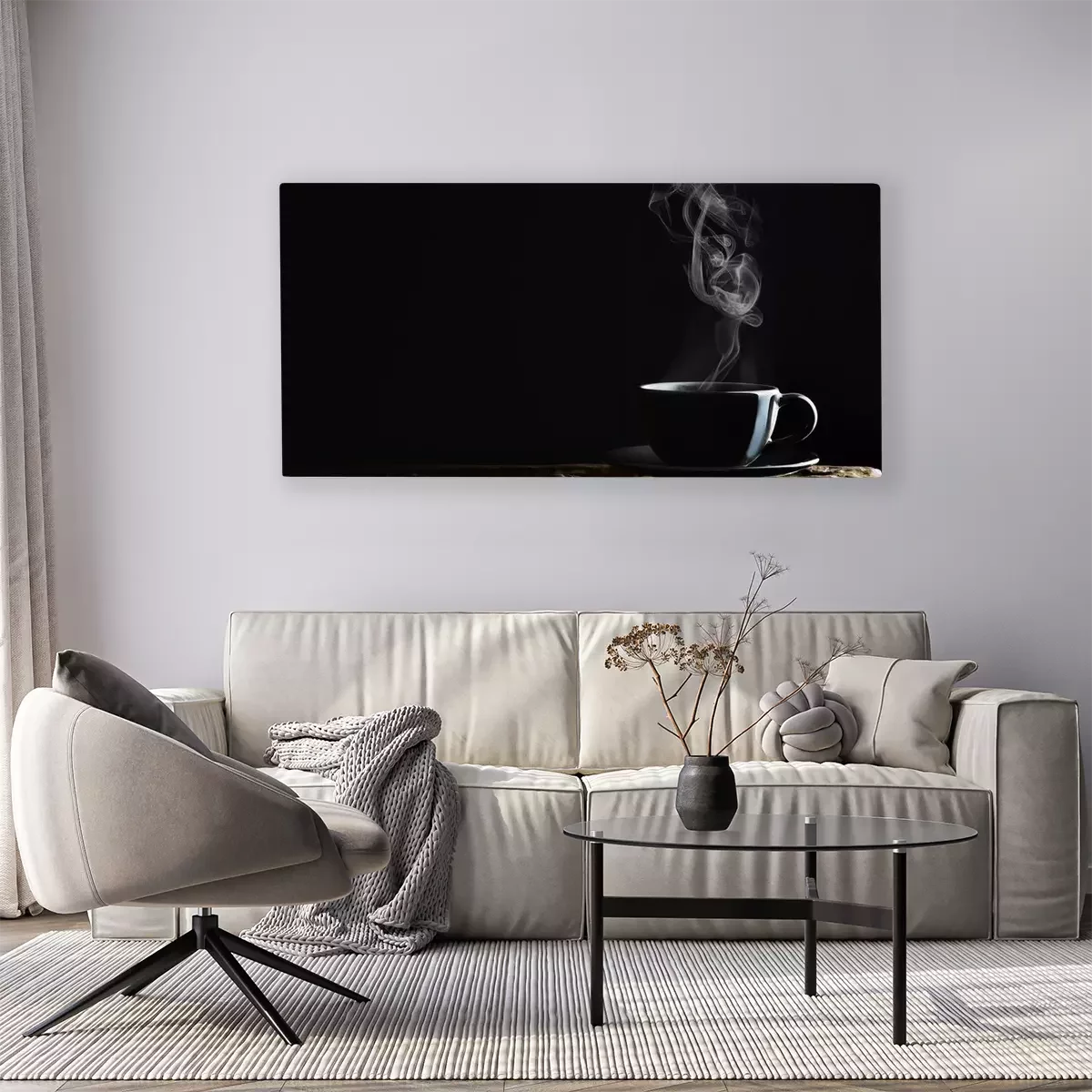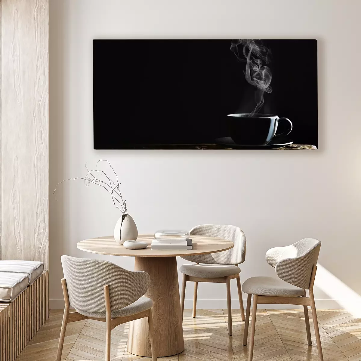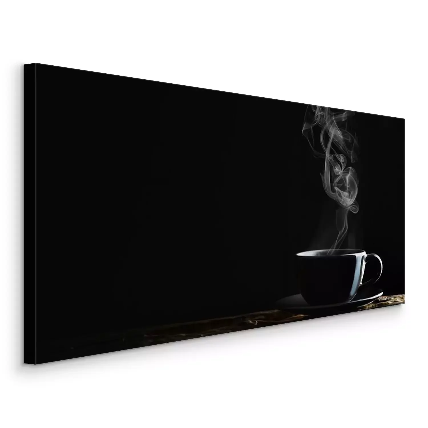 Tableau : beverage background of hot coffee, tea or chocolate in black cup on wooden plank in dark background