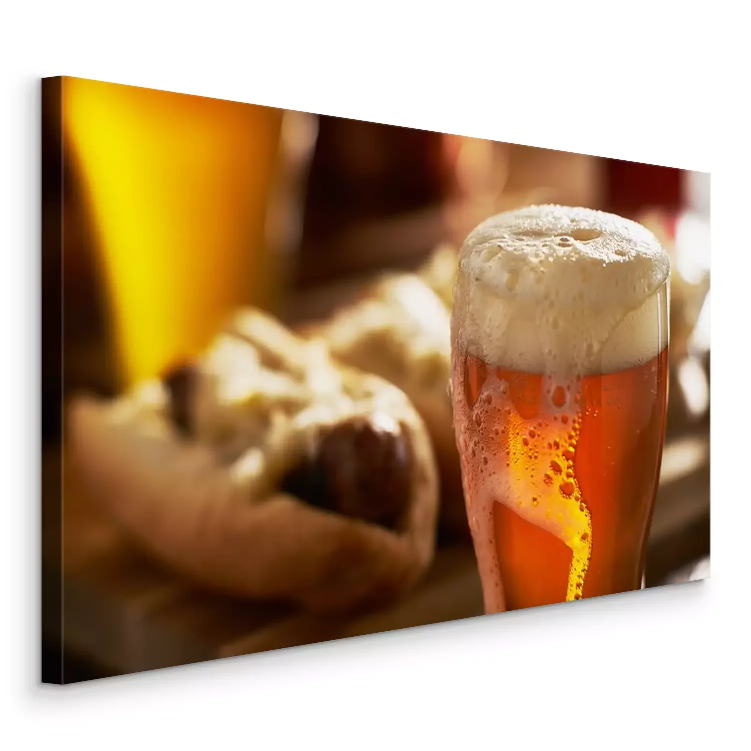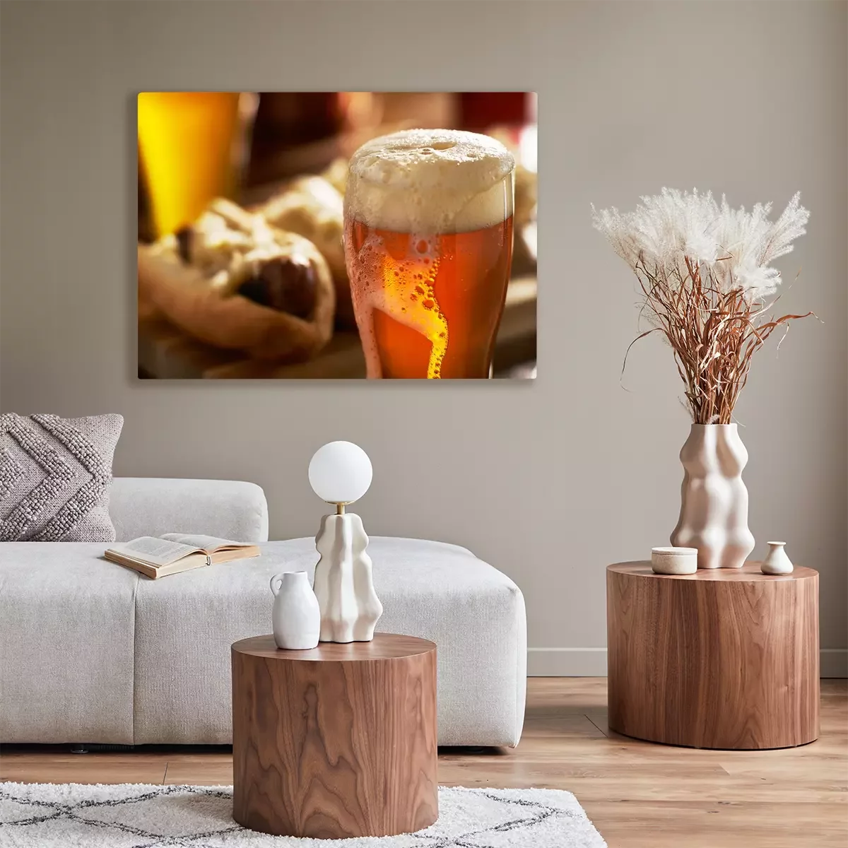 Tableau  Bière IPA avec la tête écumeuse débordante dans la tasse servi avec bratwursts