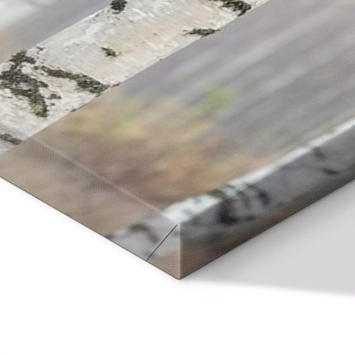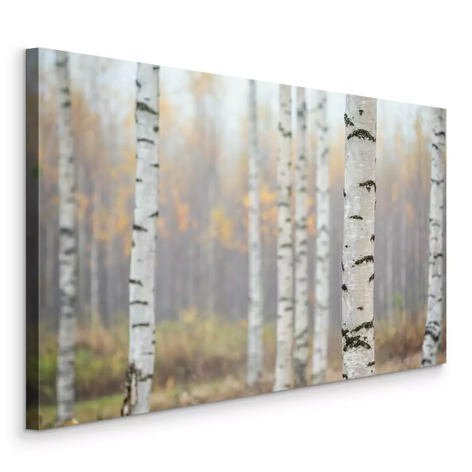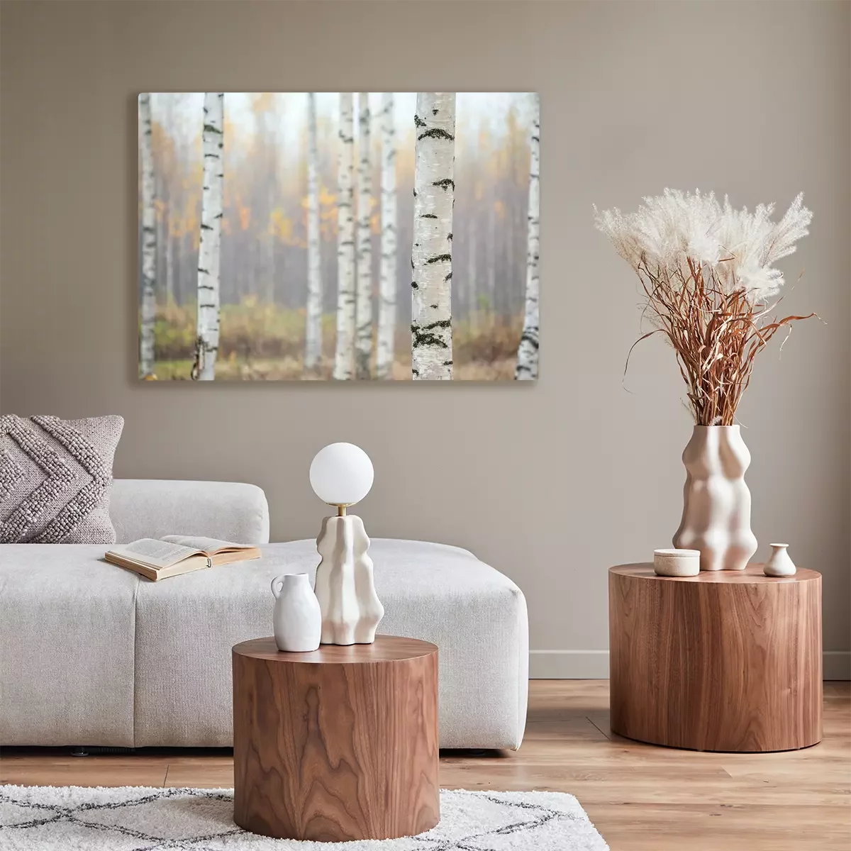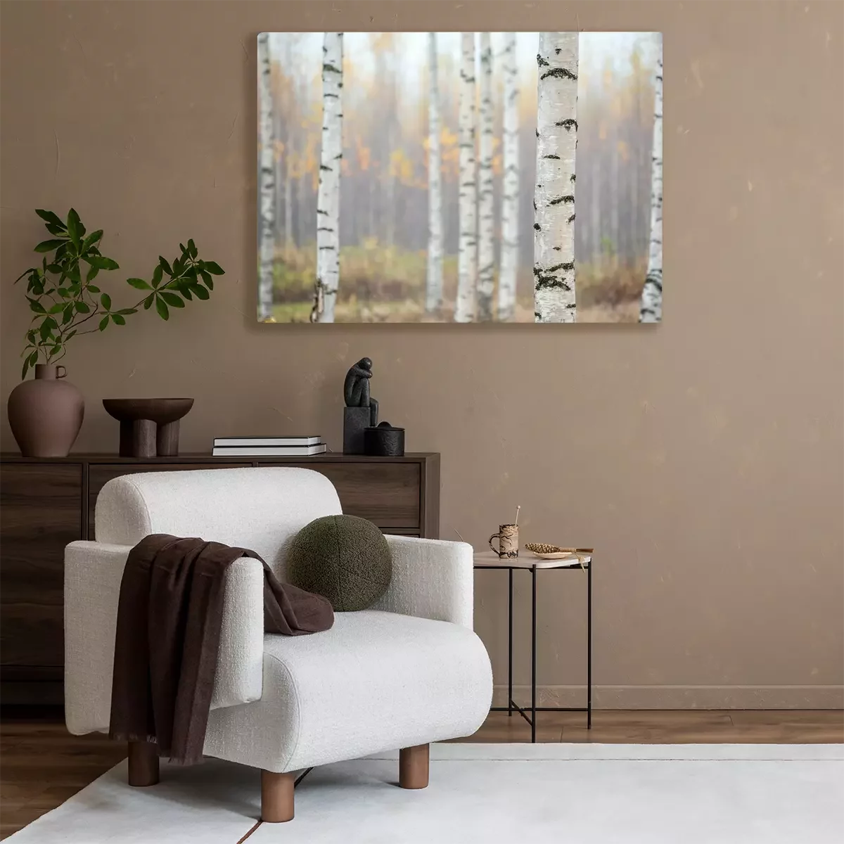 Tableau : Birch forest in fog. Autumn view. Focus in foreground tree trunk.