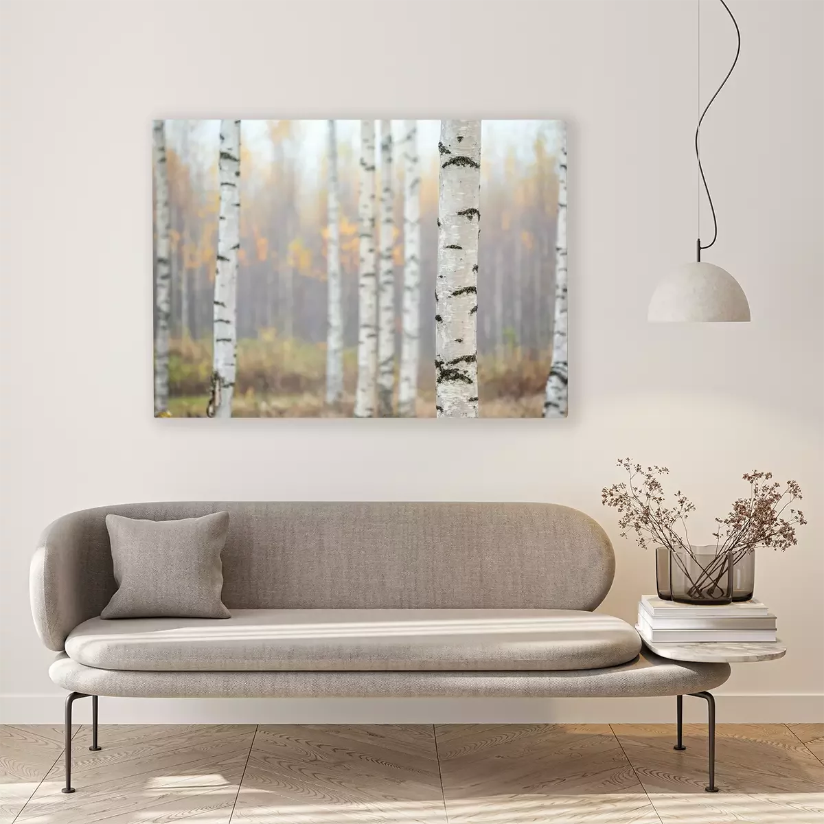 Tableau  Birch forest in fog. Autumn view. Focus in foreground tree trunk.
