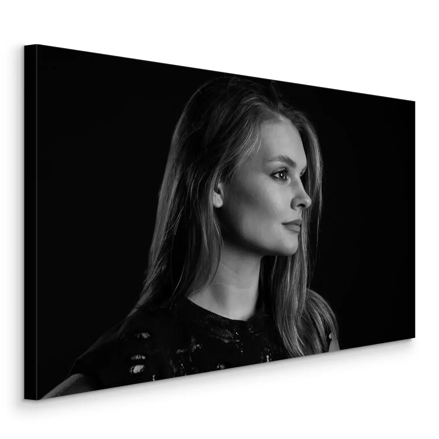 Tableau : black and white portrait of fashion beautiful model, brunette girl with freckles in studio, close up, young woman head shot
