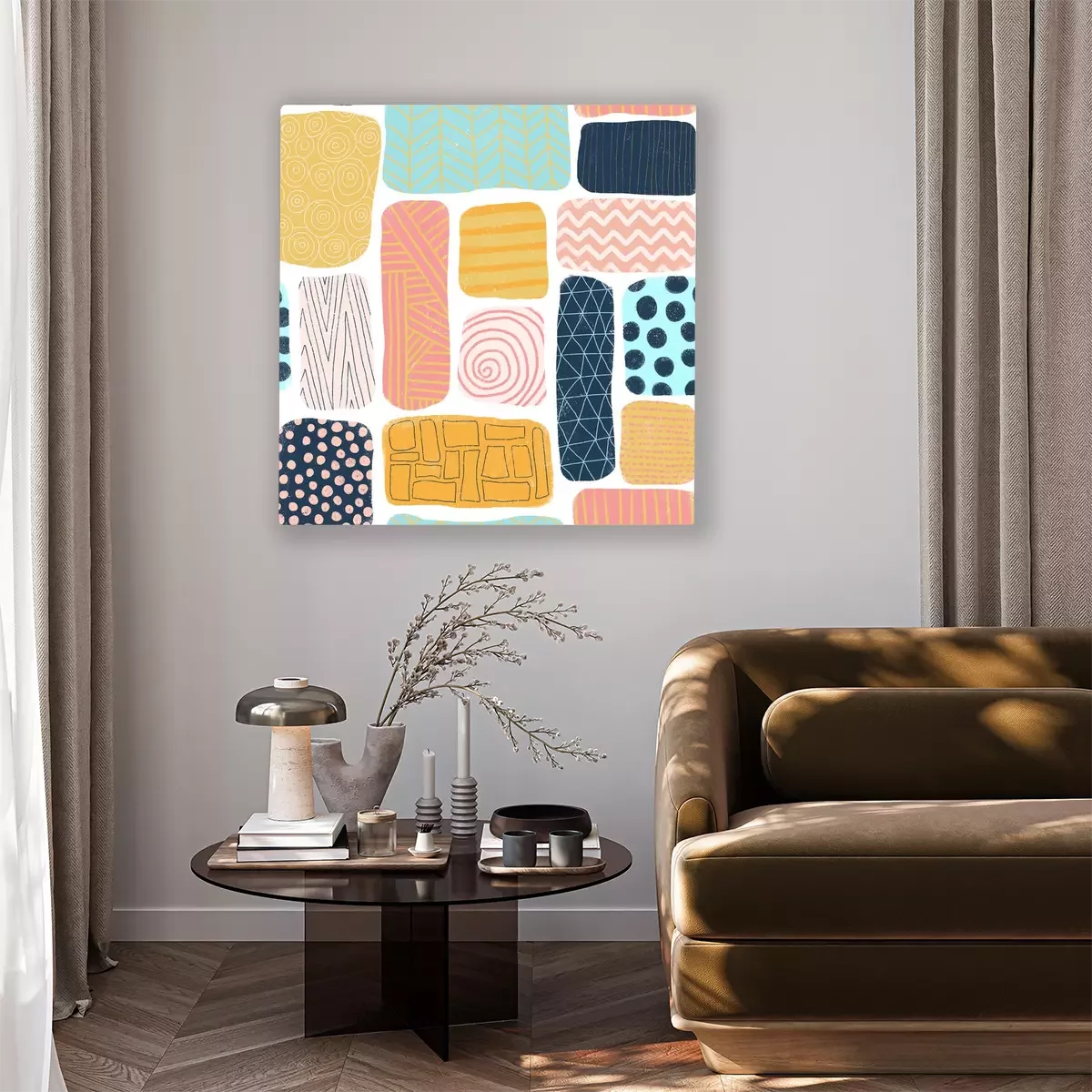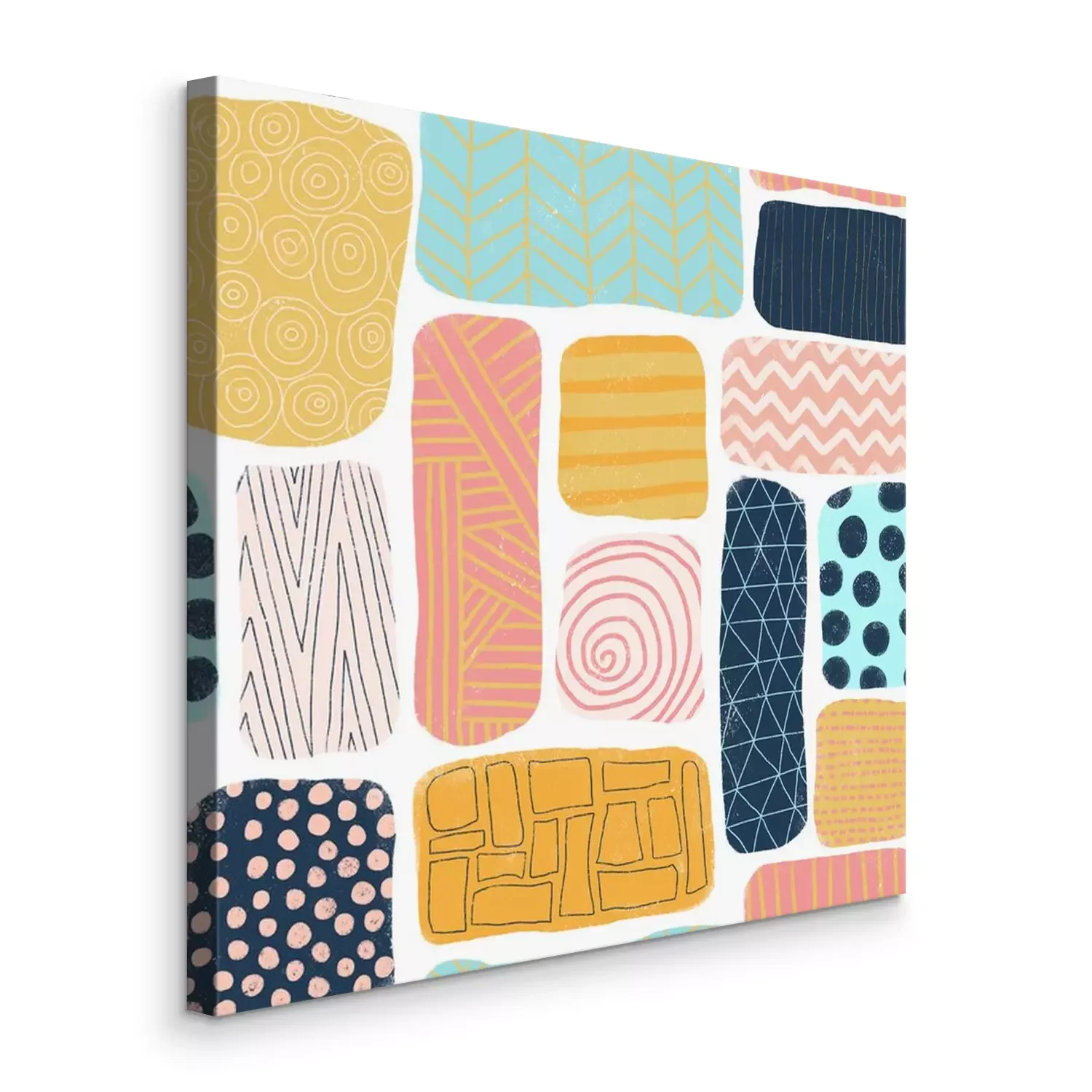 Tableau  Blocs abstraits de modèle sans couture. Doodle carré et rectangle avec différentes textures. Mosaik puzzle style fond bleu, or, rose, corail. Illustration de mignons féminin coloré dessinés à la main.