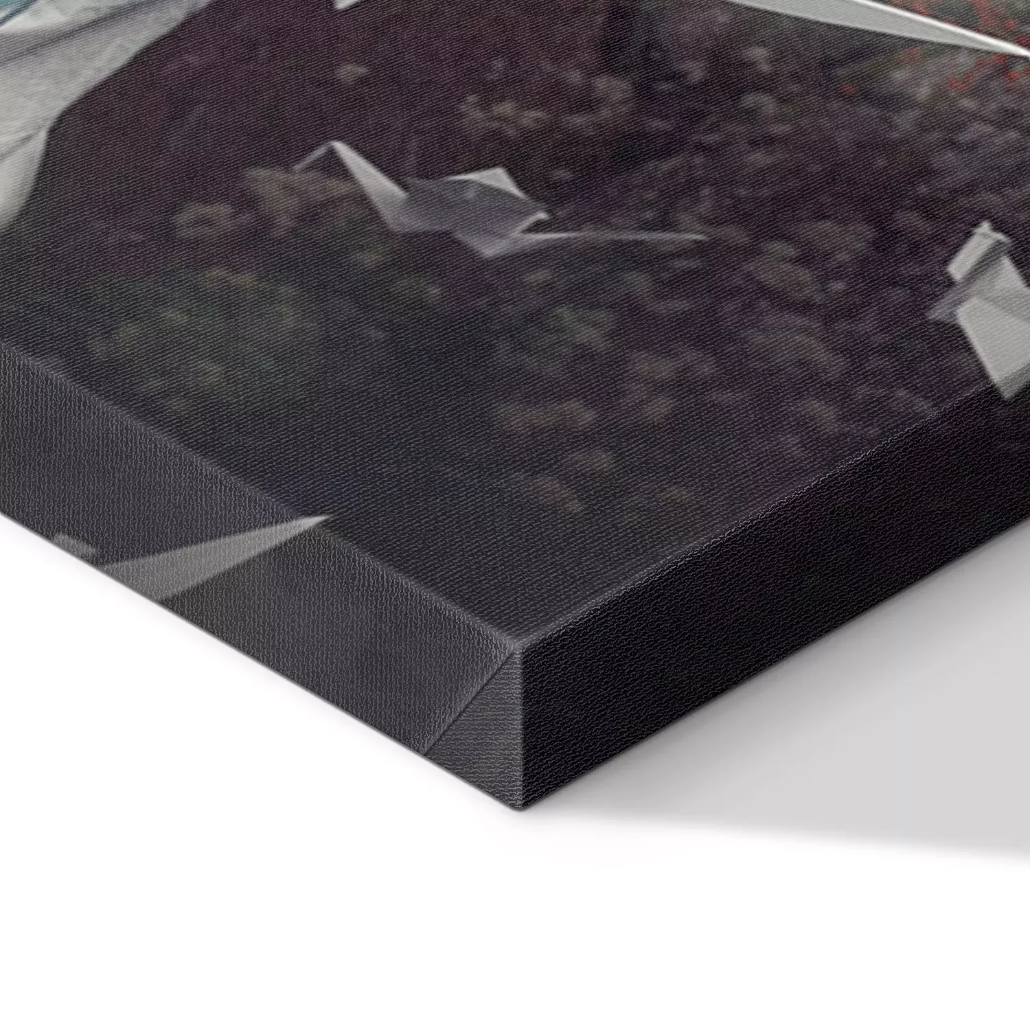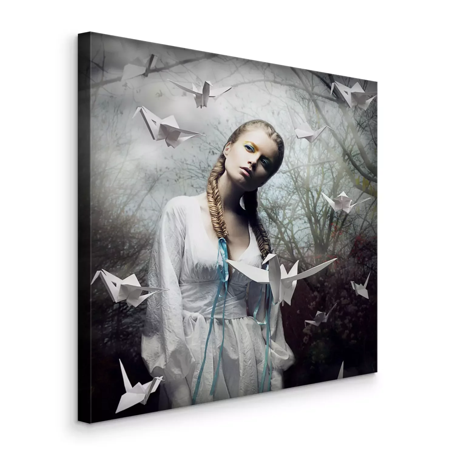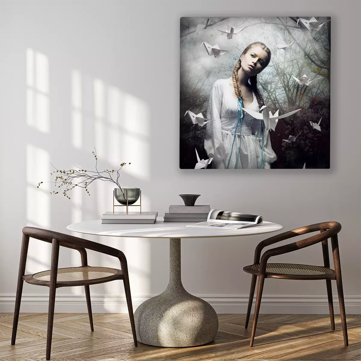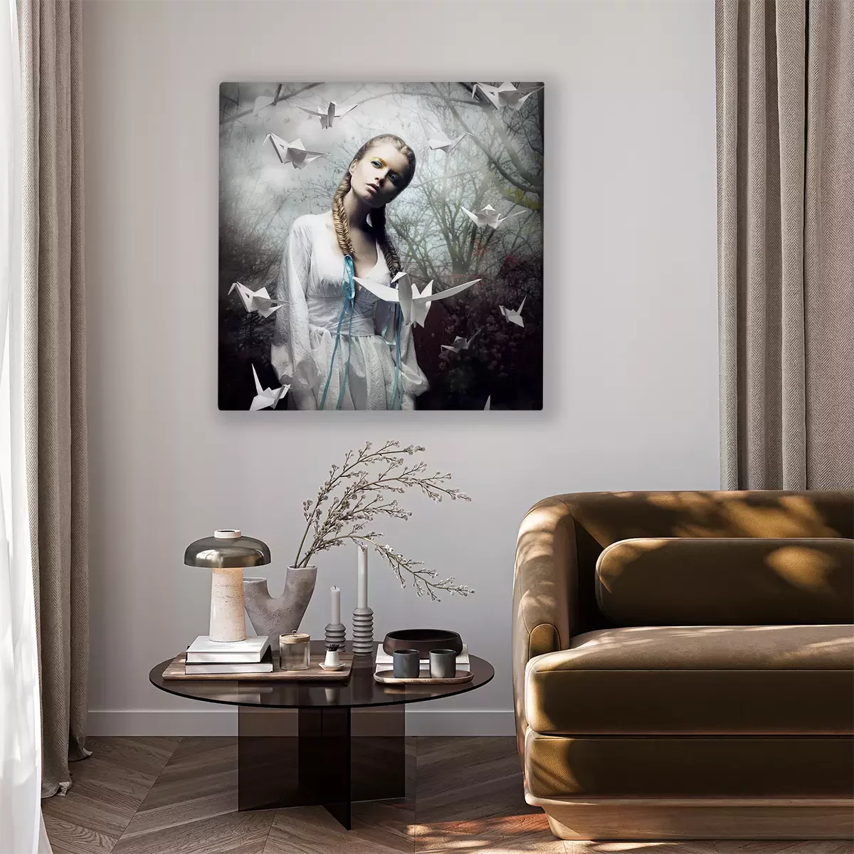 Tableau  Blonde romantique avec Planant Origami oiseaux dans la forêt fantasmagorique