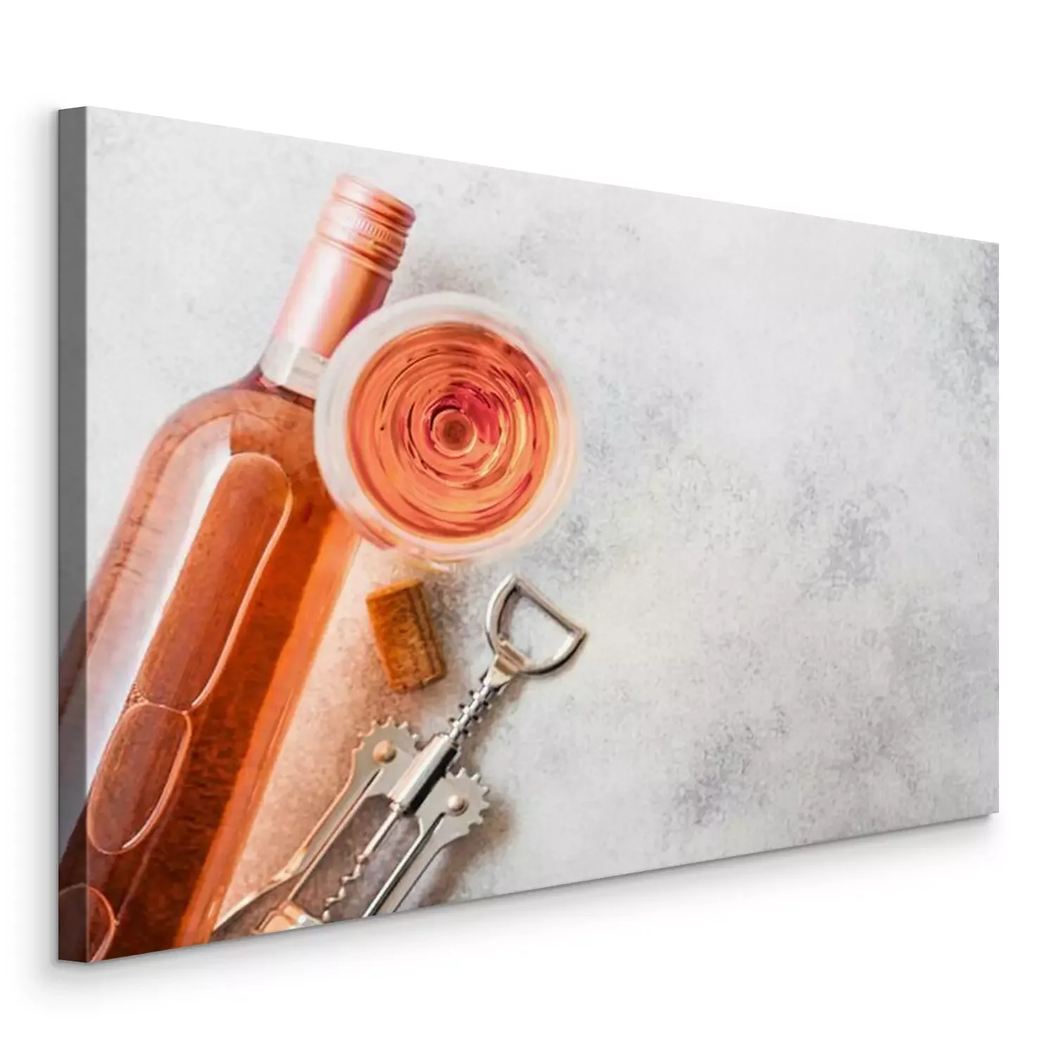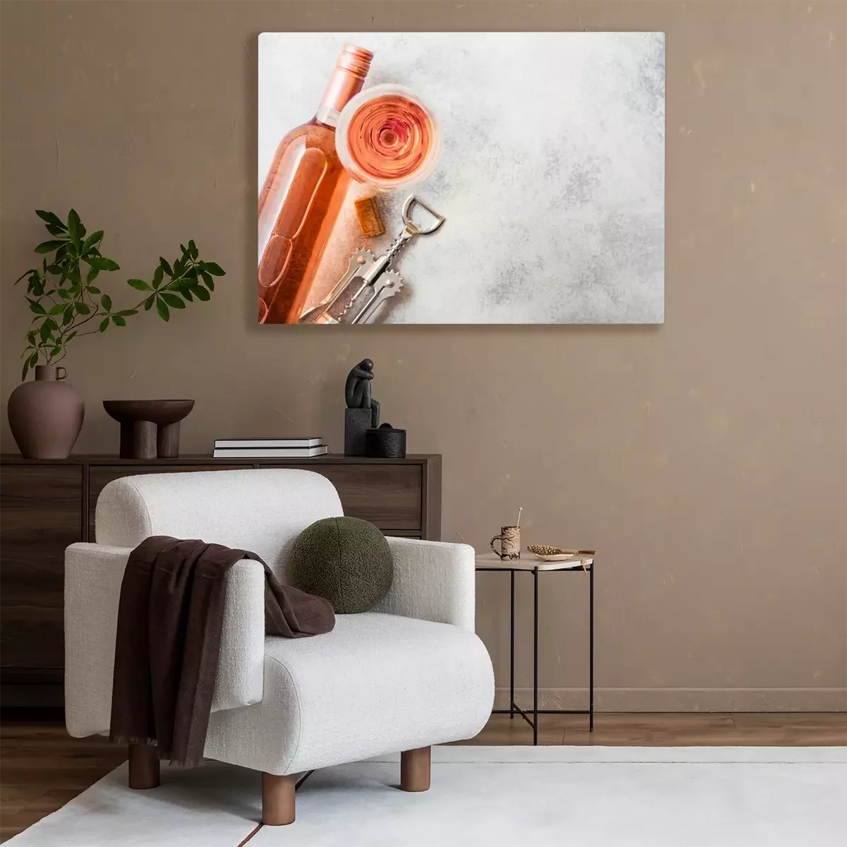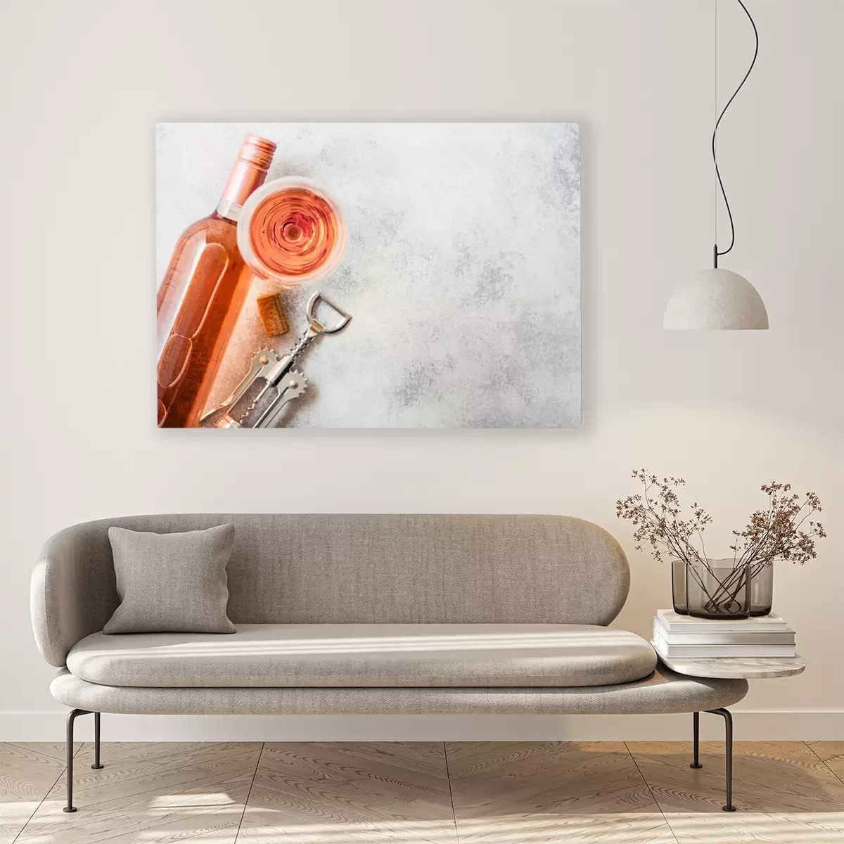 Tableau  Bottle and glasses of pink rose wine with cork and corkscrew opener on stone kitchen table background. Top view. Space for text