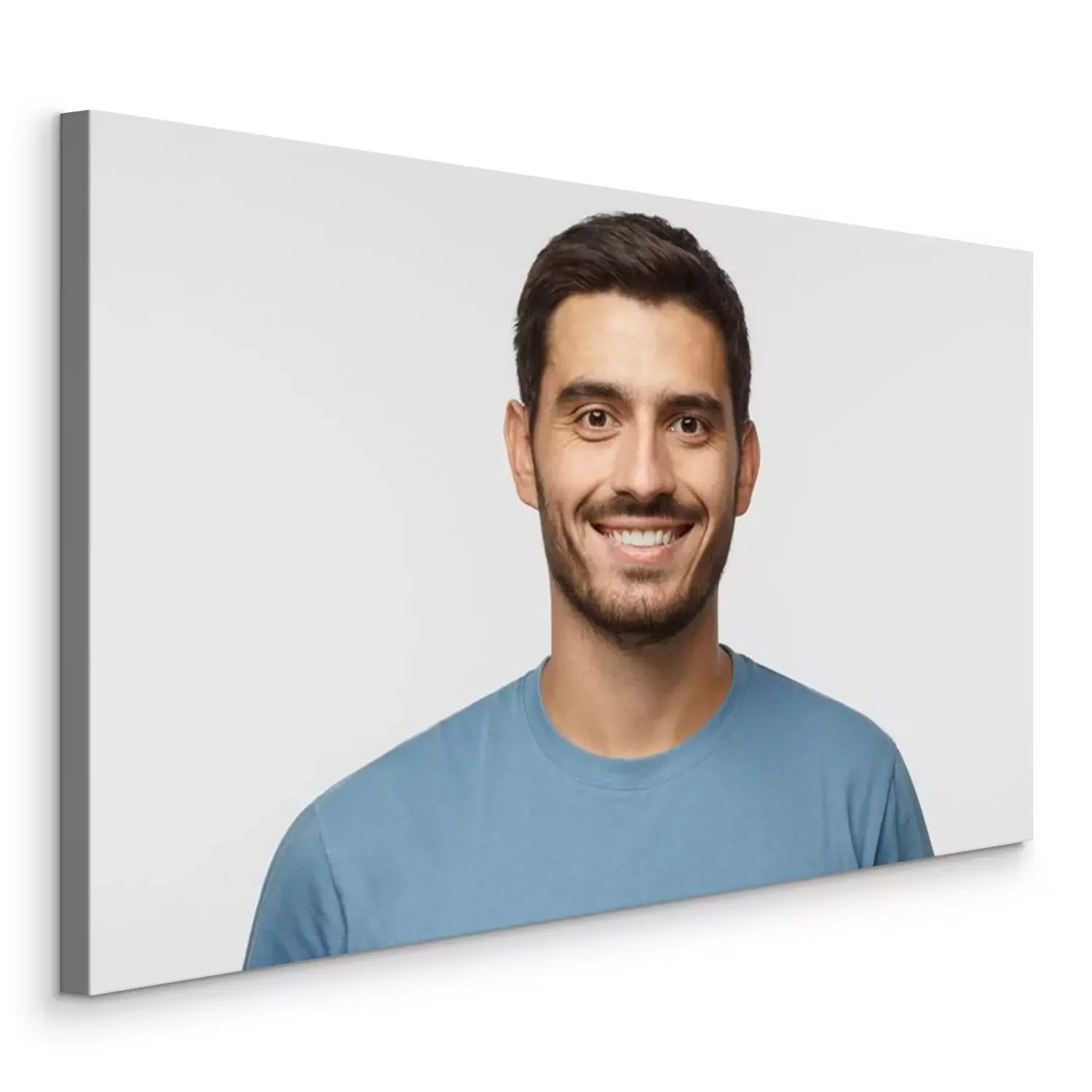 Tableau : Bouchent portrait de jeune beau mec souriant en t-shirt bleu isolé sur fond gris