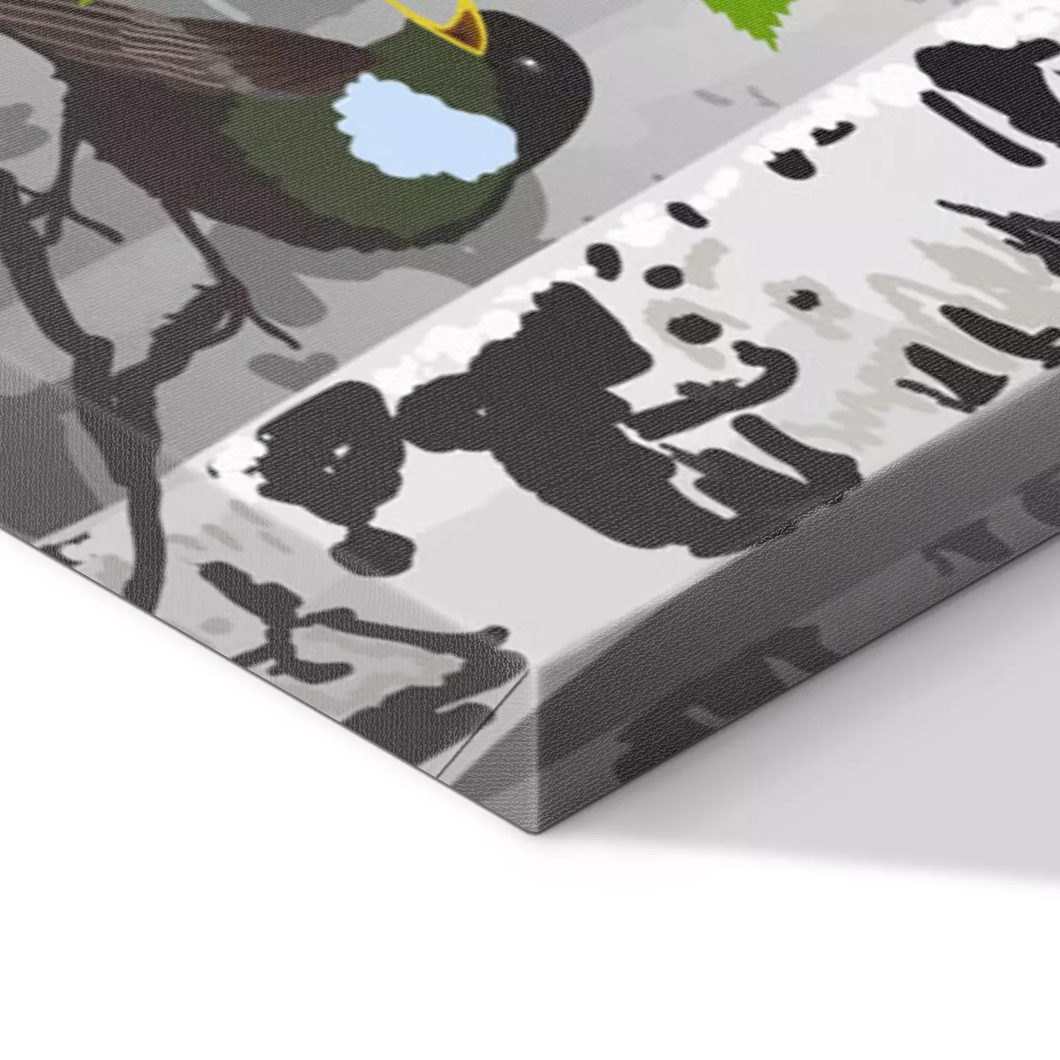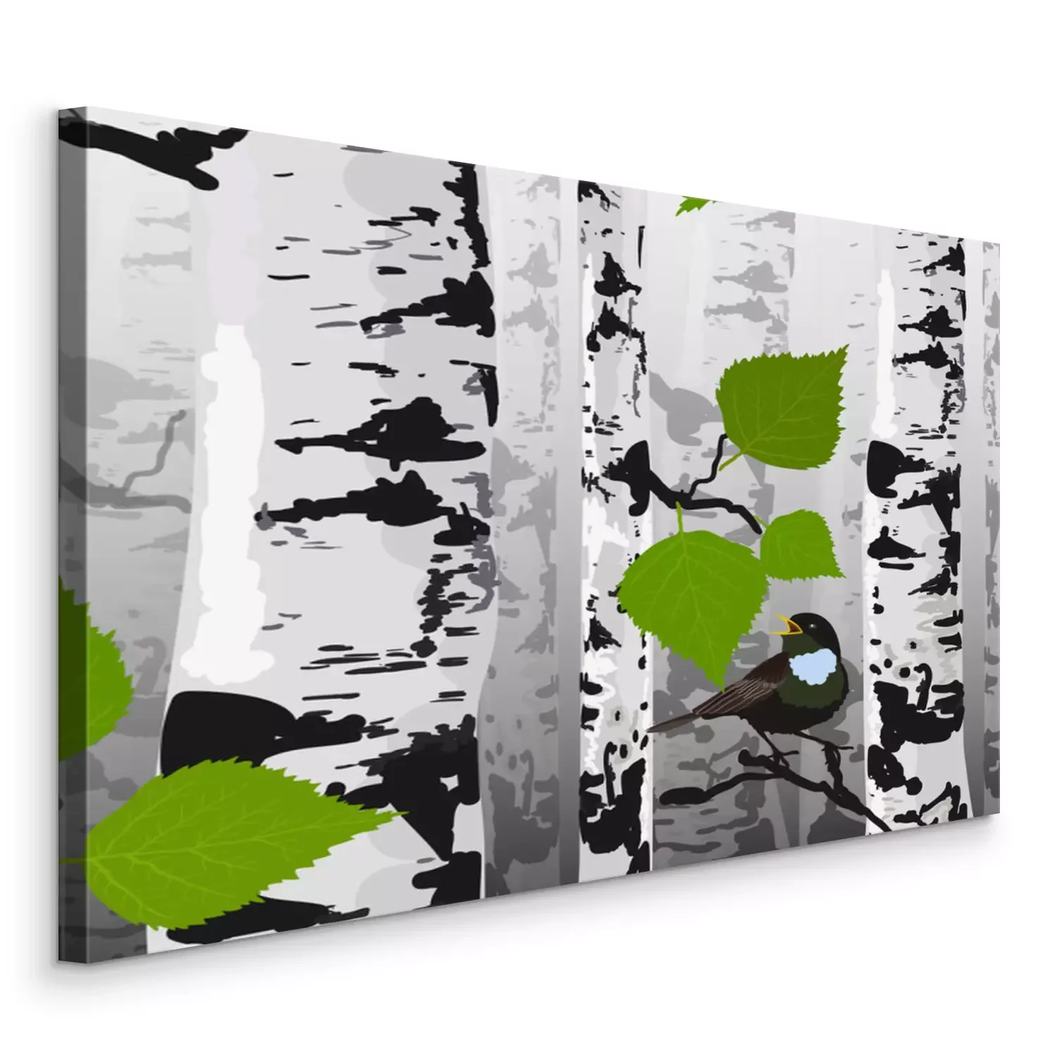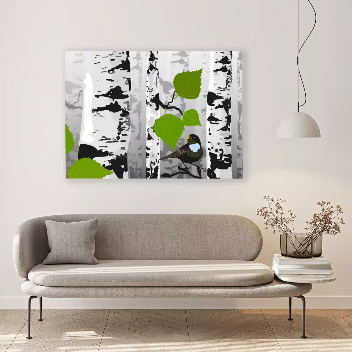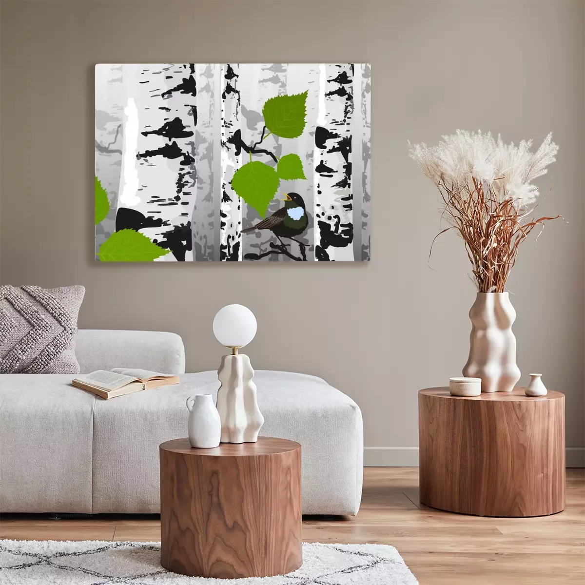 Tableau : Bouleaux noirs et blancs et un oiseau
