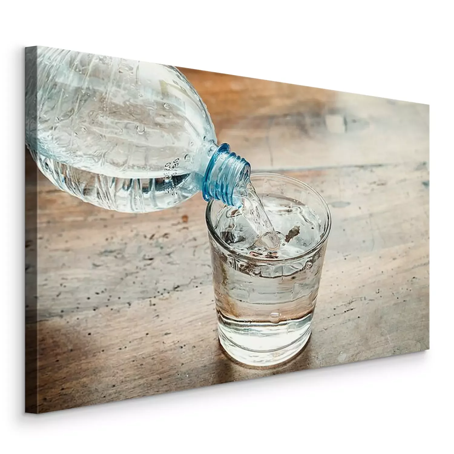 Tableau  bouteille d'eau bleue versé dans un verre clair