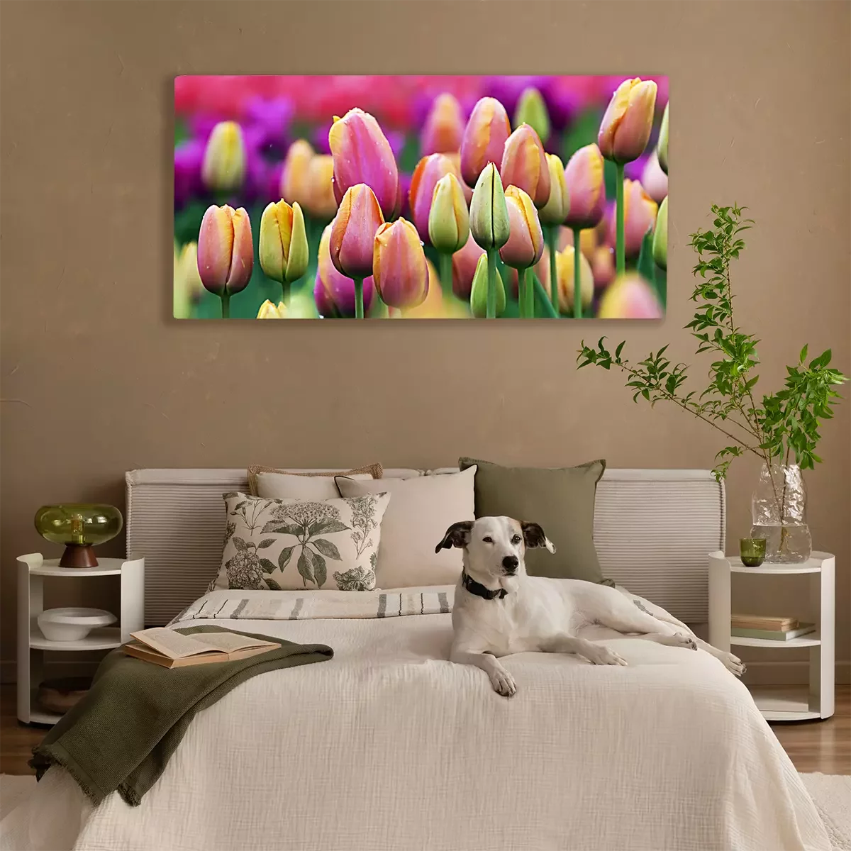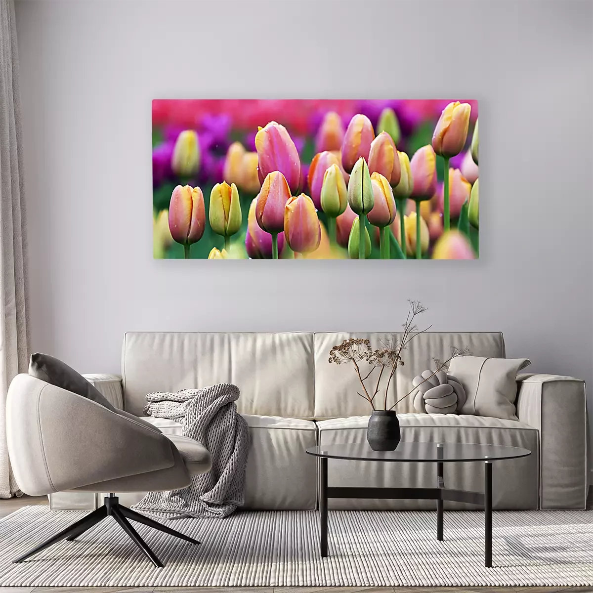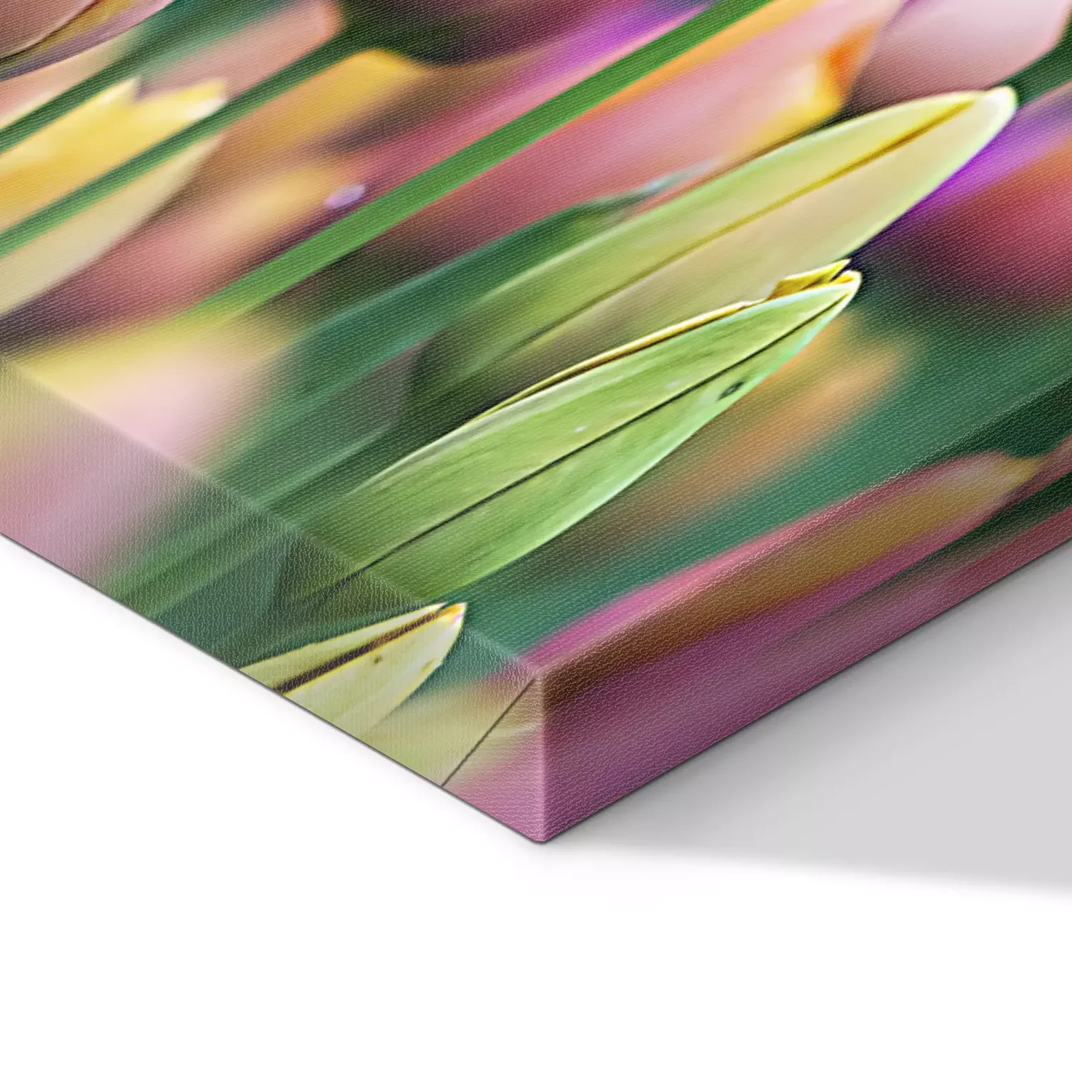 Boutons de tulipes roses et jaunes sur fond de parterre de fleurs