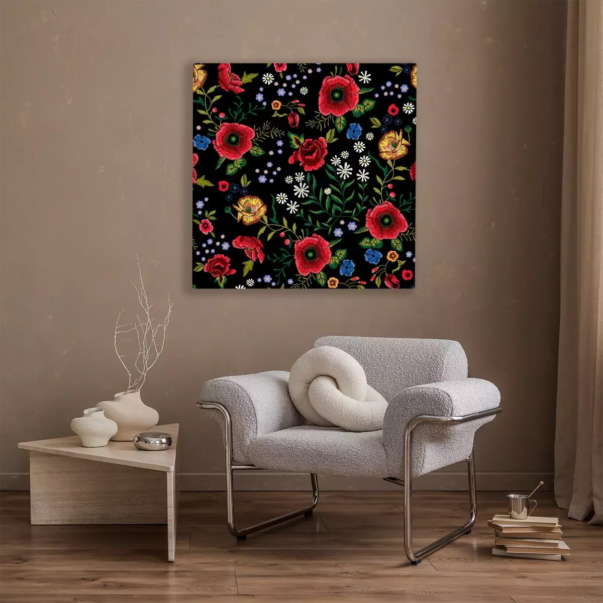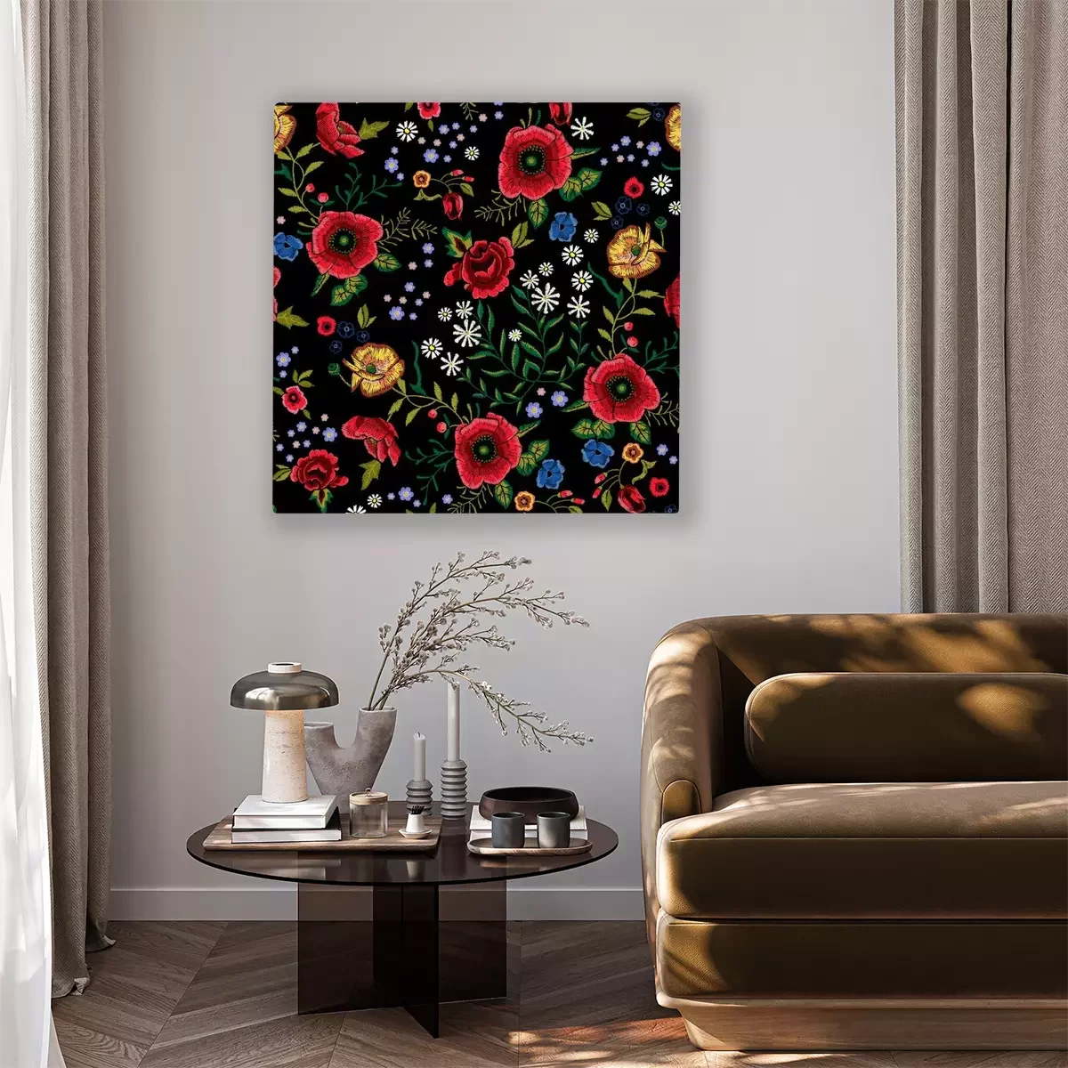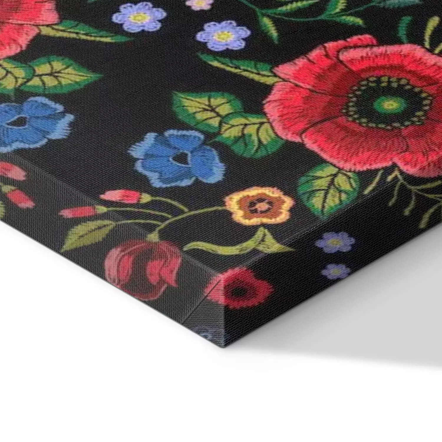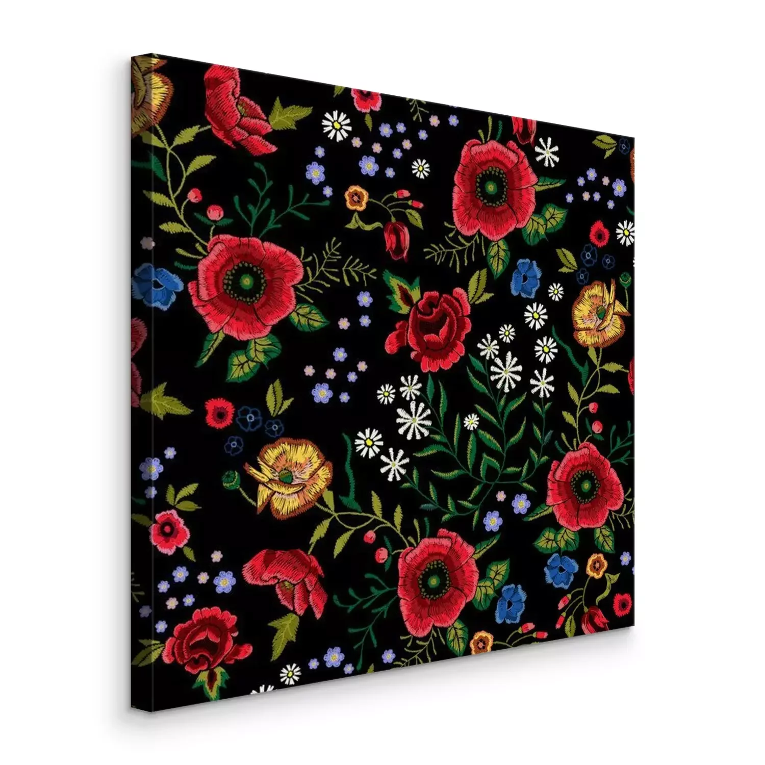 Tableau : Broderie traditionnelle modèle sans couture avec coquelicots rouges et roses.