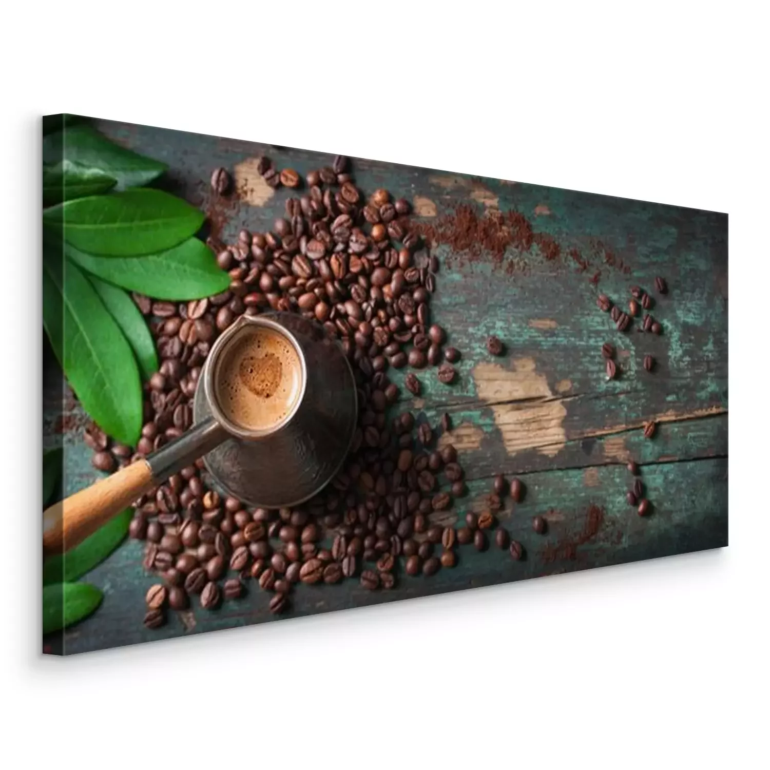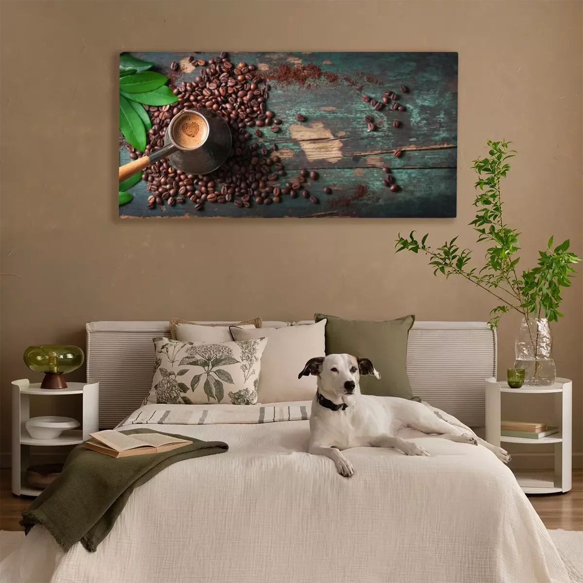 Tableau  Café chaud dans une cafetière ou un turc sur un fond en bois avec des feuilles de café et des haricots, horizontal avec copie espace. Vue de dessus