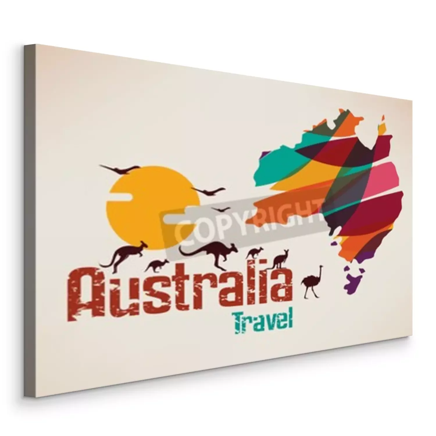 Tableau  Carte de voyage en Australie, symbole décratif du continent australien avec des silhouettes de kangourous sautées