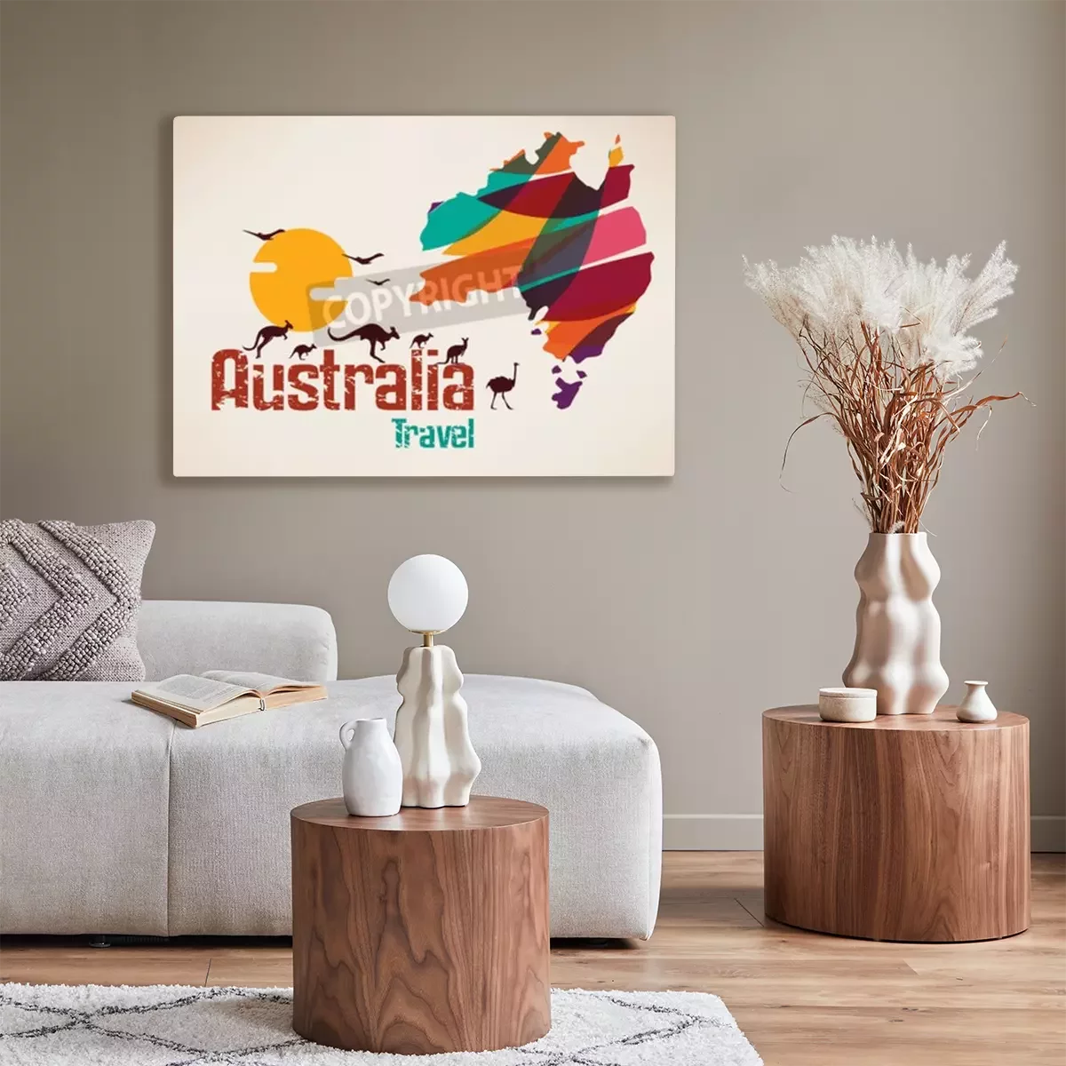 Tableau : Carte de voyage en Australie, symbole décratif du continent australien avec des silhouettes de kangourous sautées