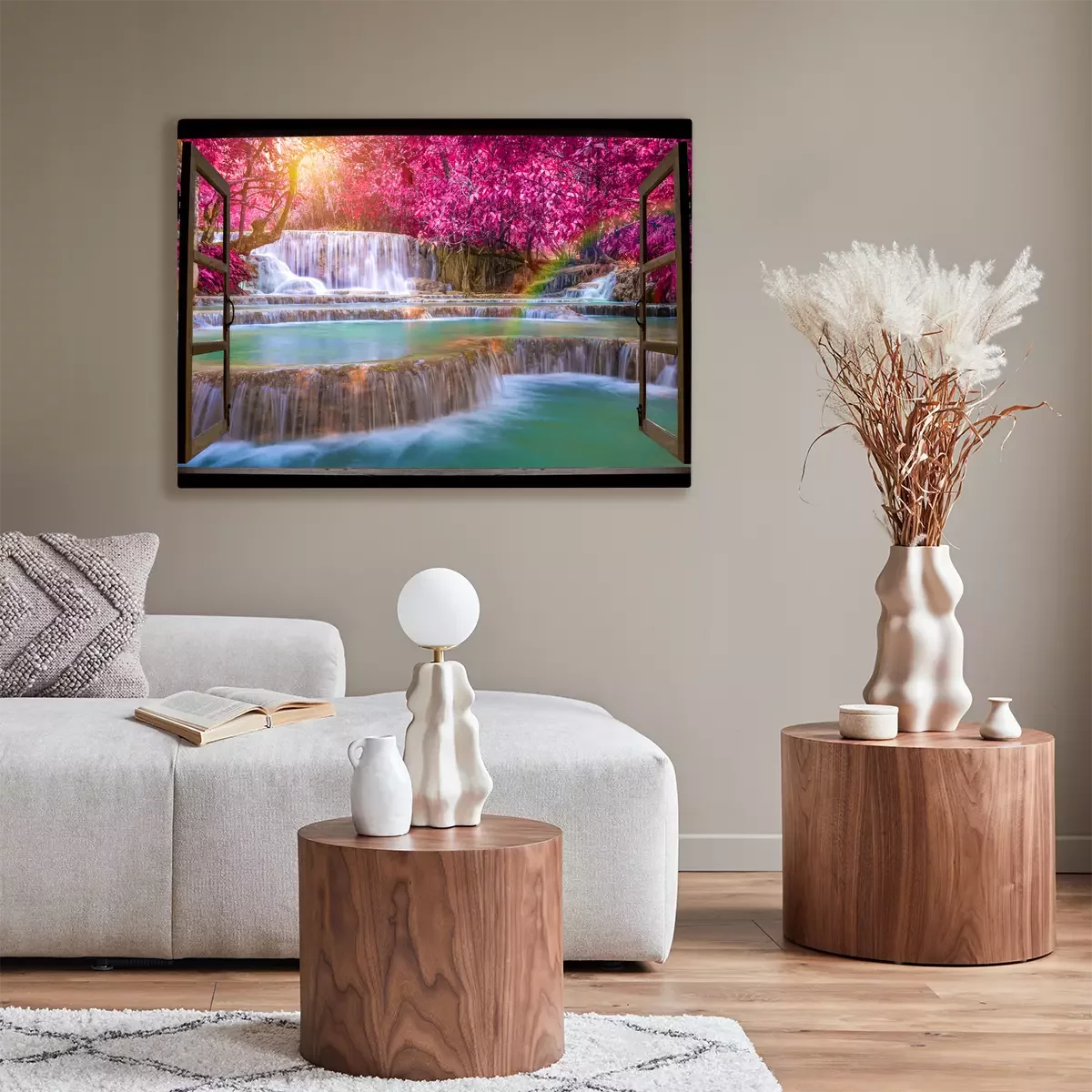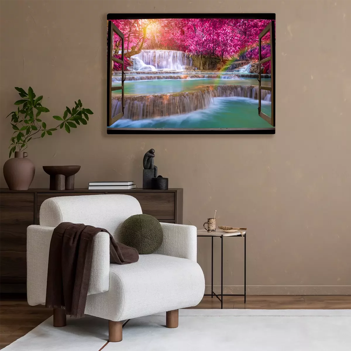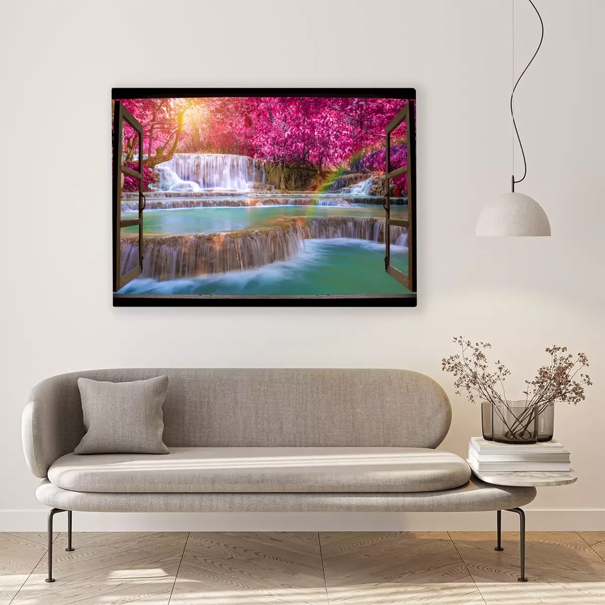 Cascade et arbres roses