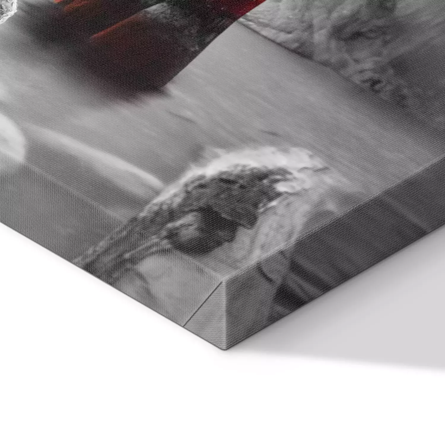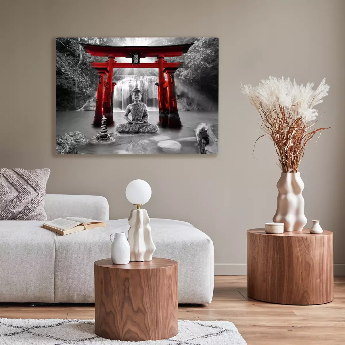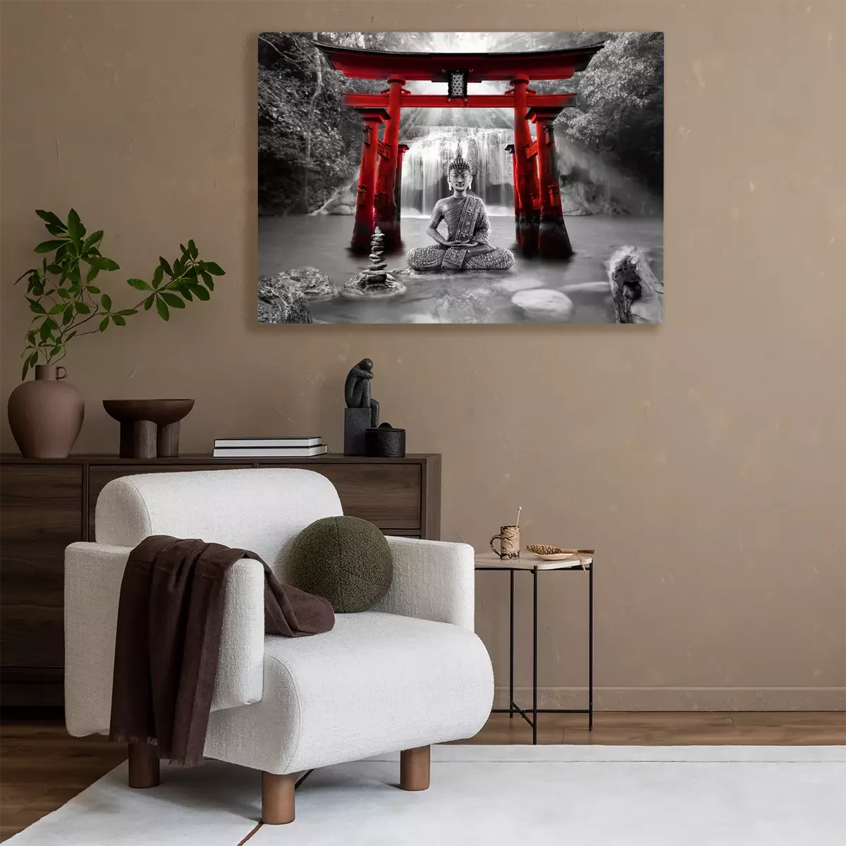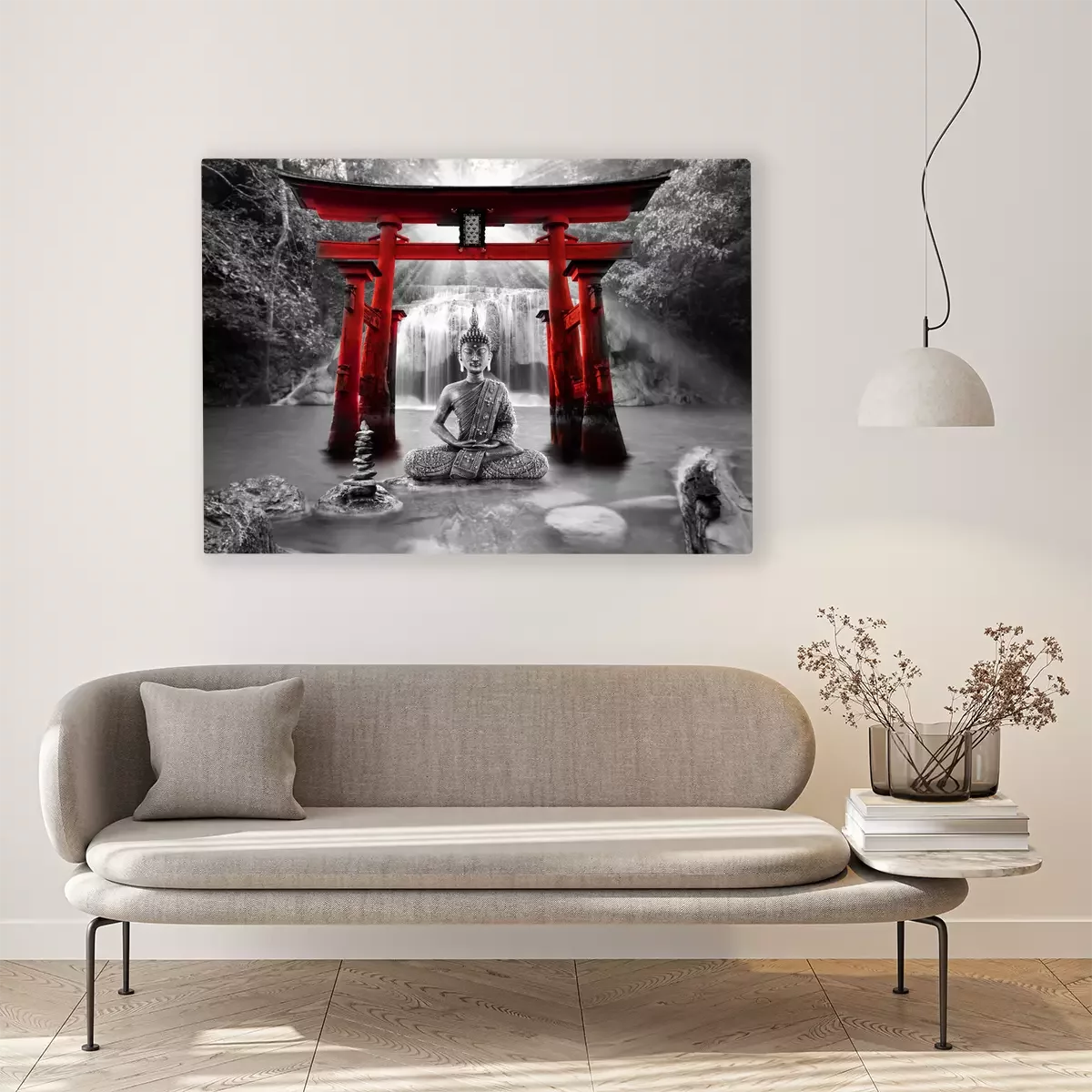 Cascade et bouddha en noir et blanc avec une arche rouge