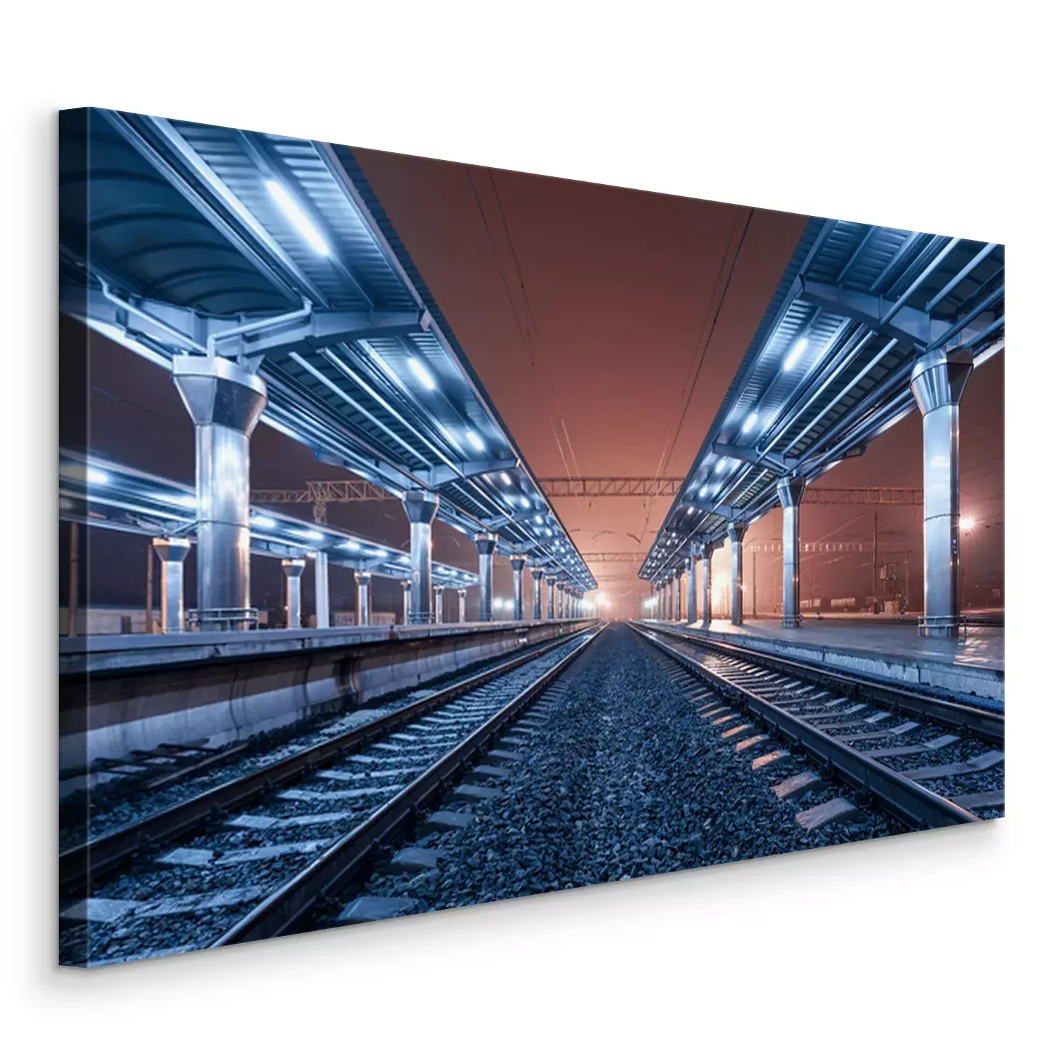 Gare la nuit. Plate-forme de train dans le brouillard. Railroad