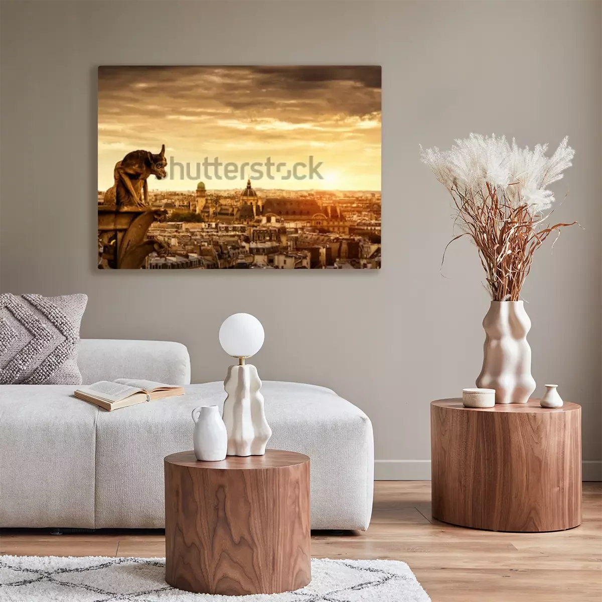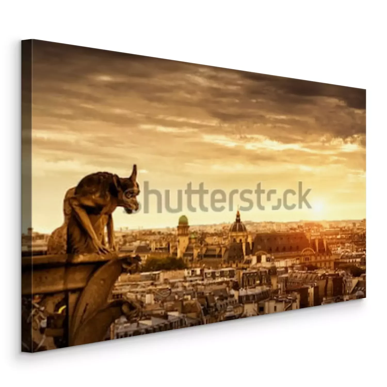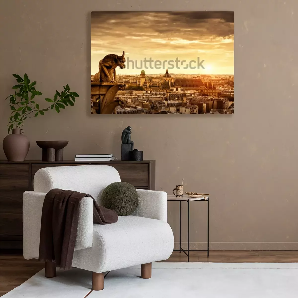 Tableau  Chimère ou gargouille sur la cathédrale de Notre Dame de Paris surplombant Paris au coucher du soleil, France. Panorama de Paris avec la statue maléfique au soleil. Belle vue ensoleillée de Paris sous