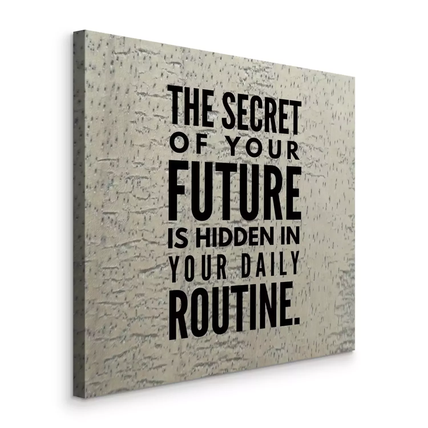 Tableau : Citation de motivation "Le secret de votre avenir est caché dans votre routine quotidienne." sur un fond en bois.