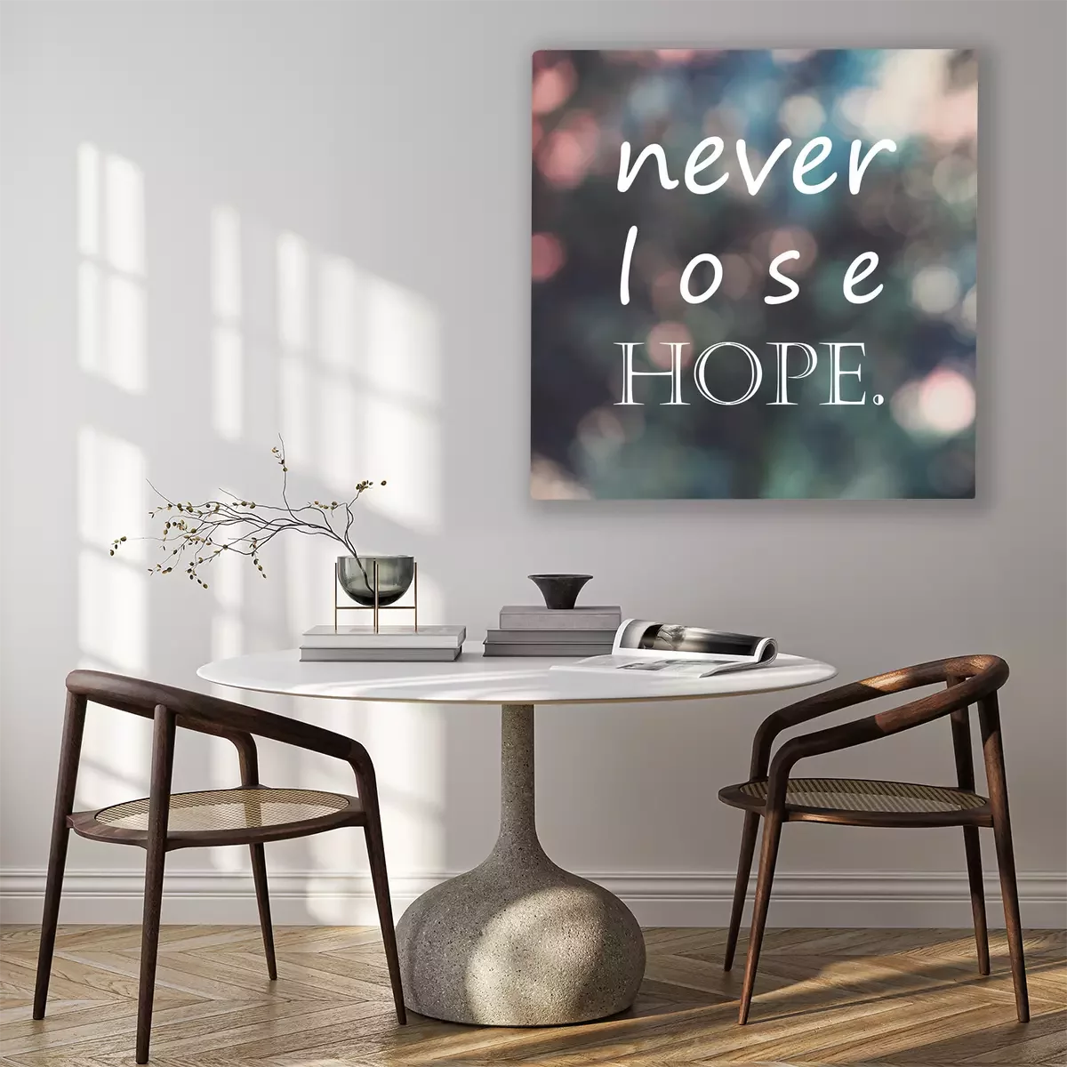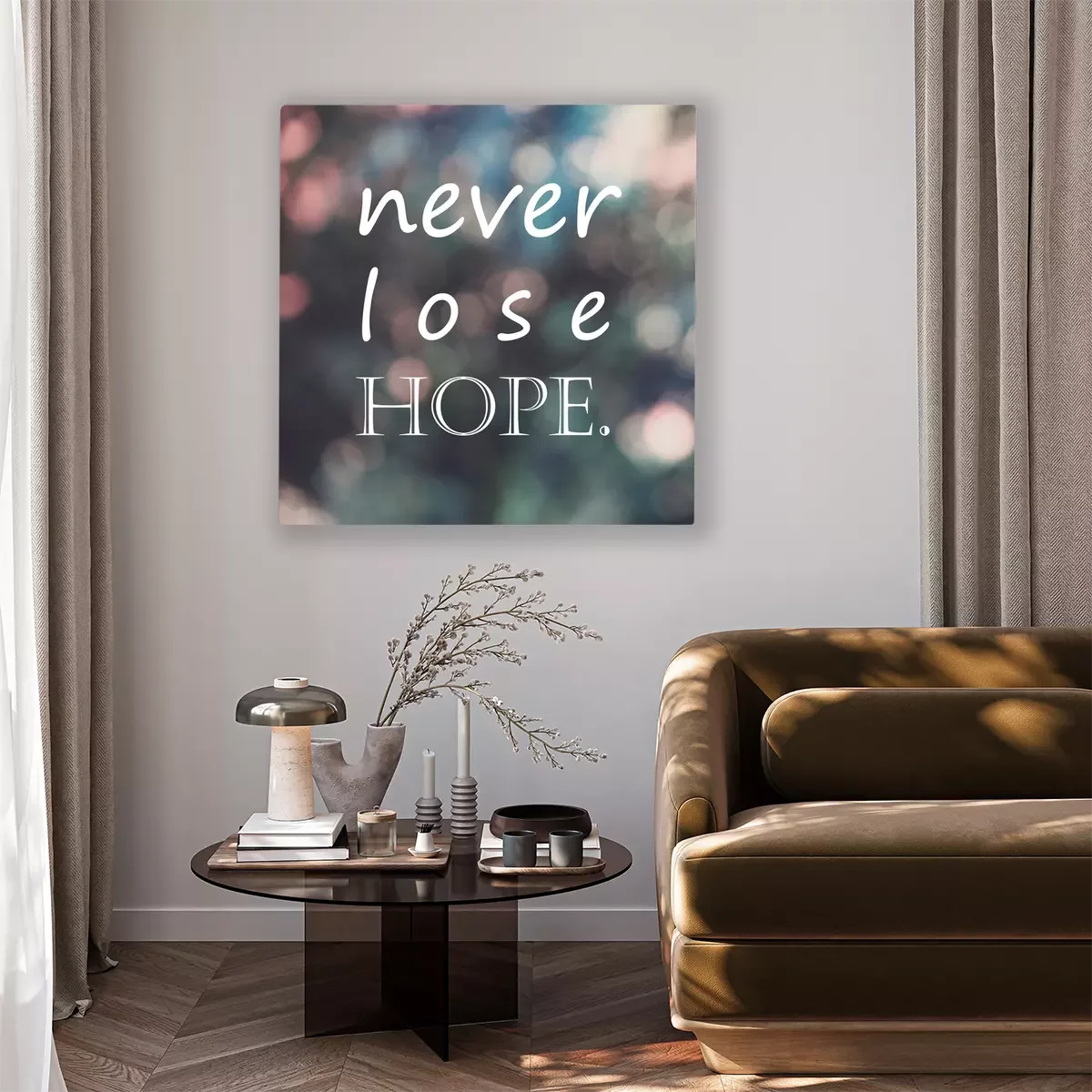Tableau  Citation de vie de motivation de typographie, "ne jamais perdre l'espoir" sur fond de bokeh de flou, filtre de couleur