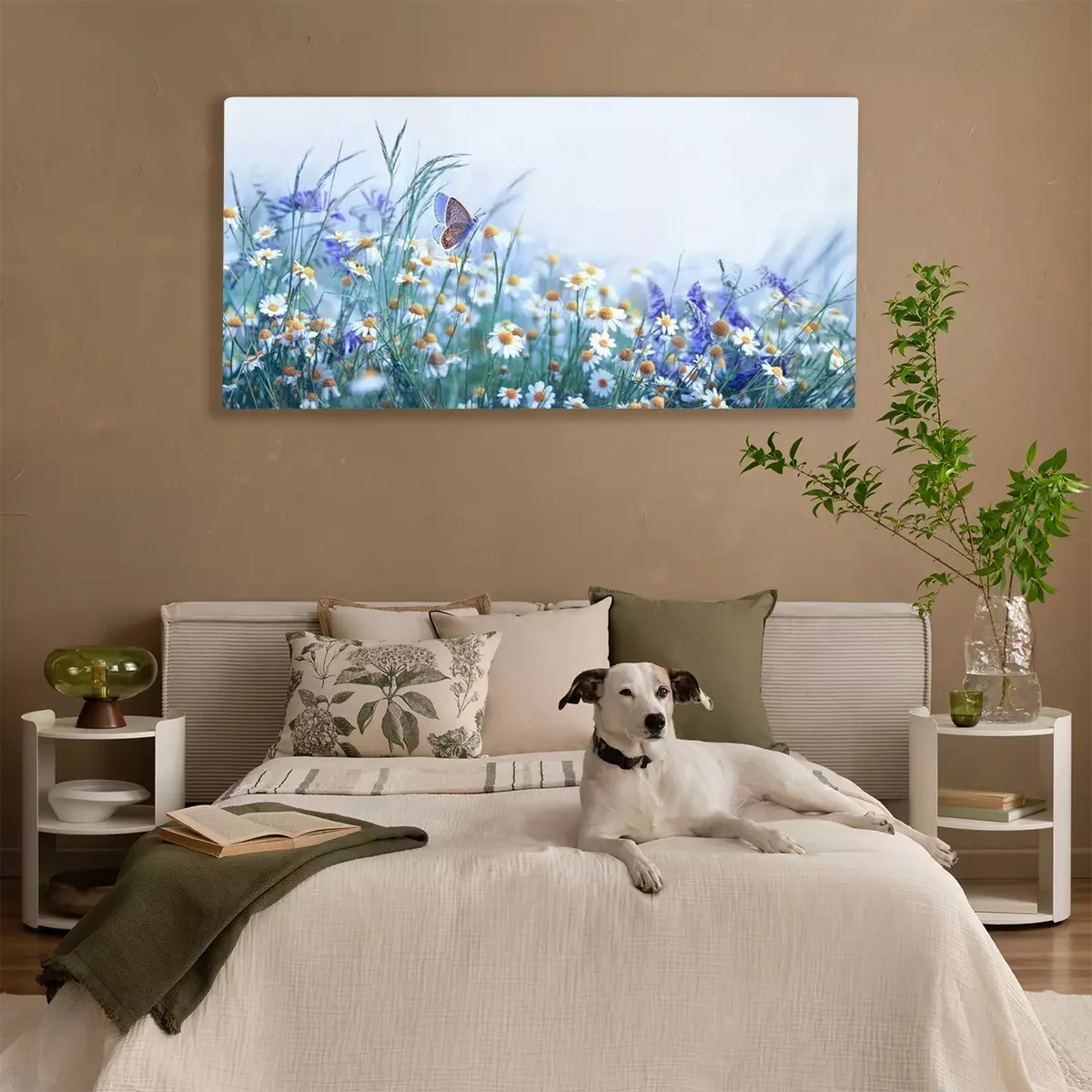 Beautiful field meadow flowers chamomile and violet wild bells and three flying butterflies in morning green grass in sunlight, natural landscape. Delightful pastoral airy fresh artistic image nature.