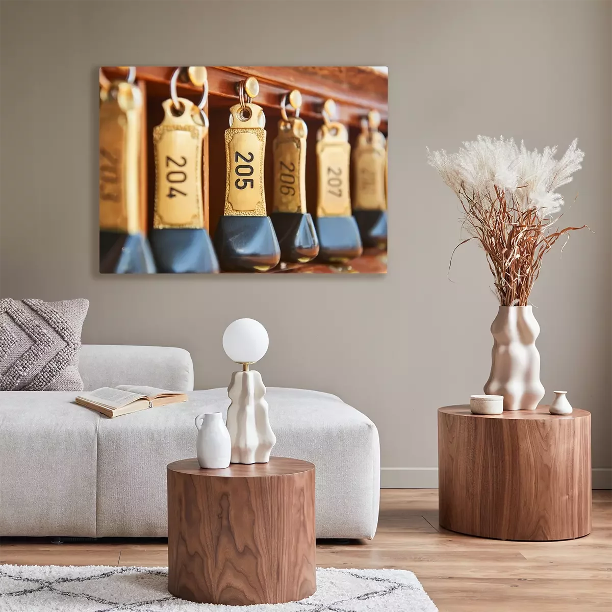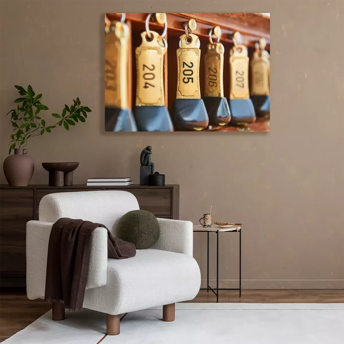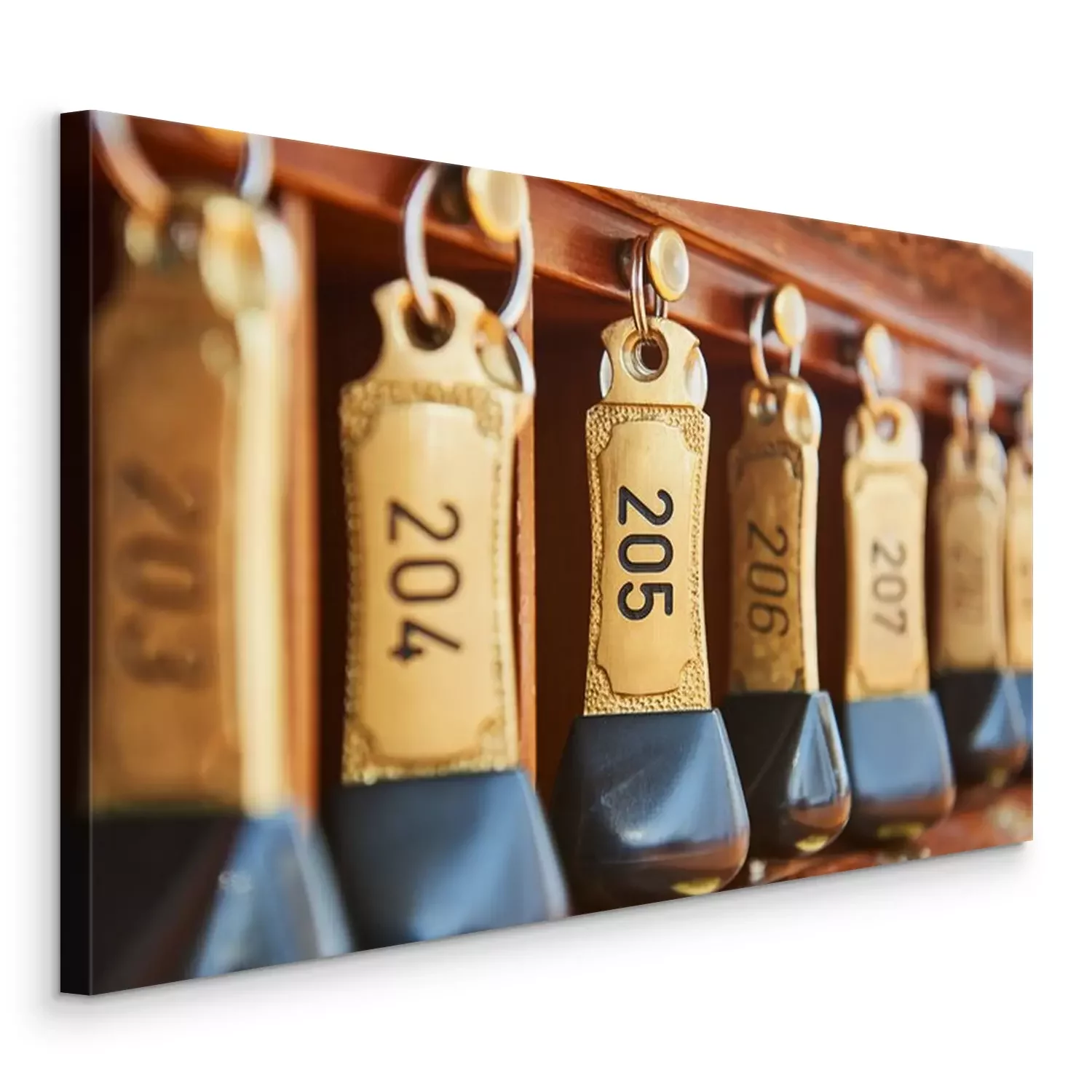 Tableau : Clés de l'hôtel avec numéros de chambre accroché à la réception