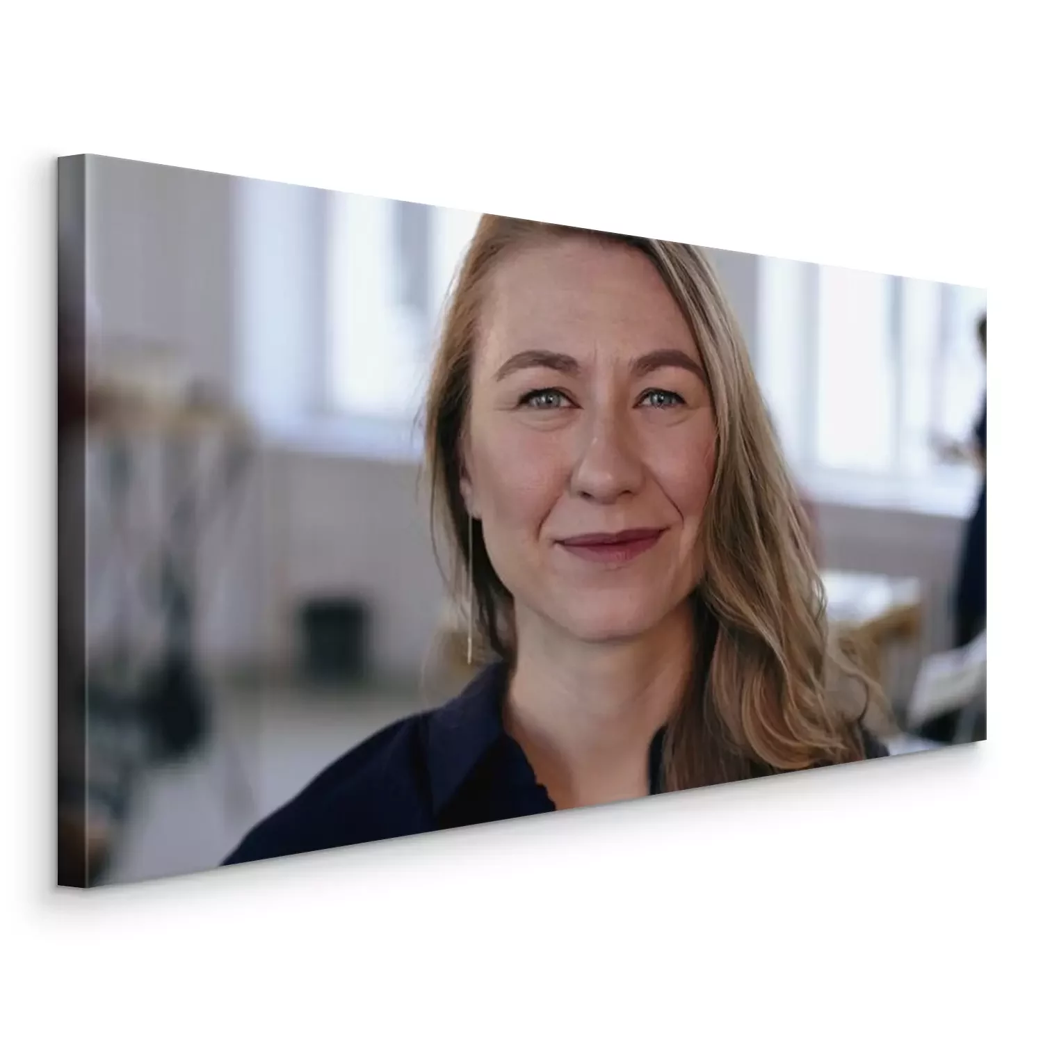 Tableau  Close-up portrait of happy Caucasian blonde business woman posing at trendy modern office workplace, smiling cheerfully.