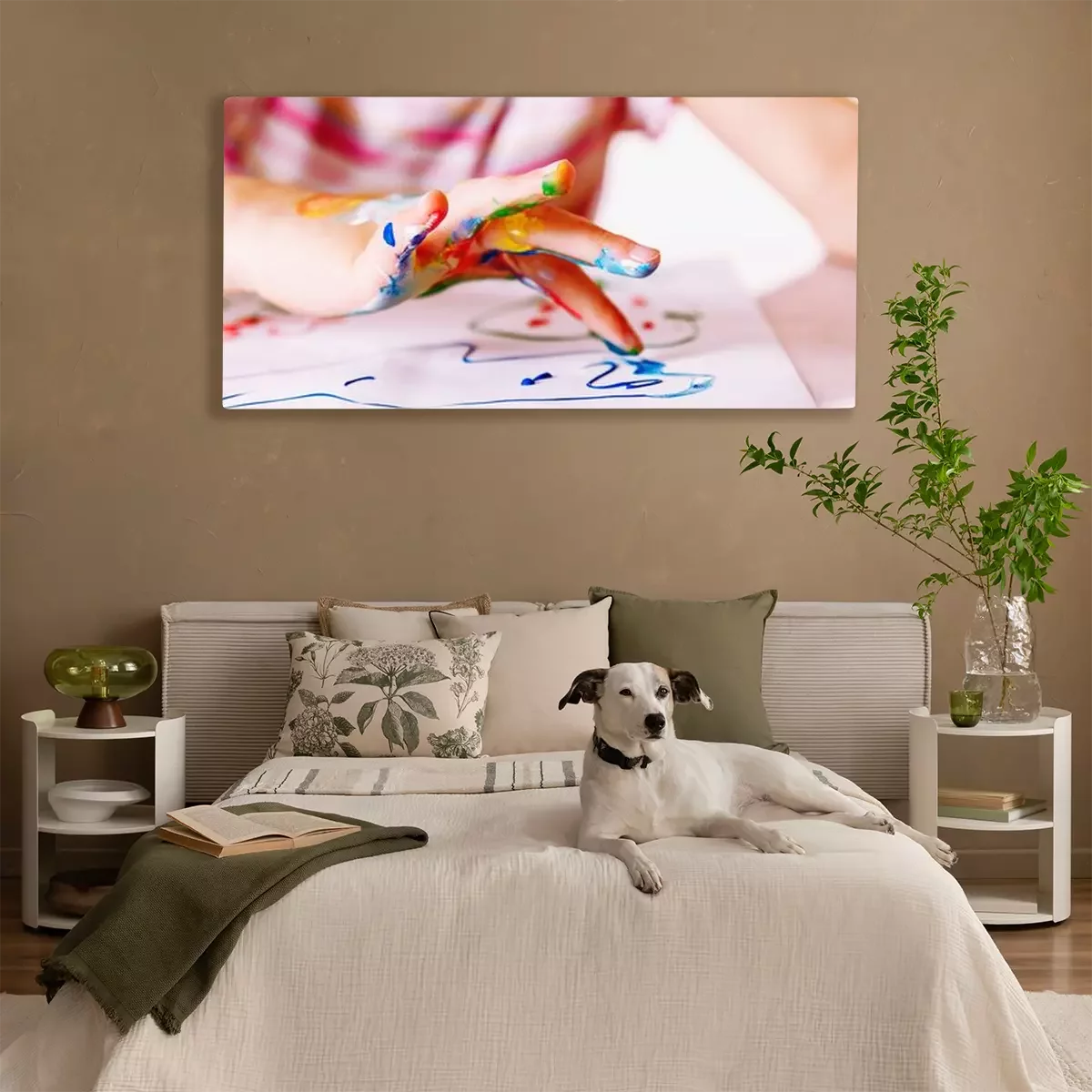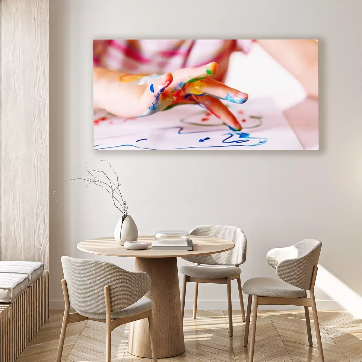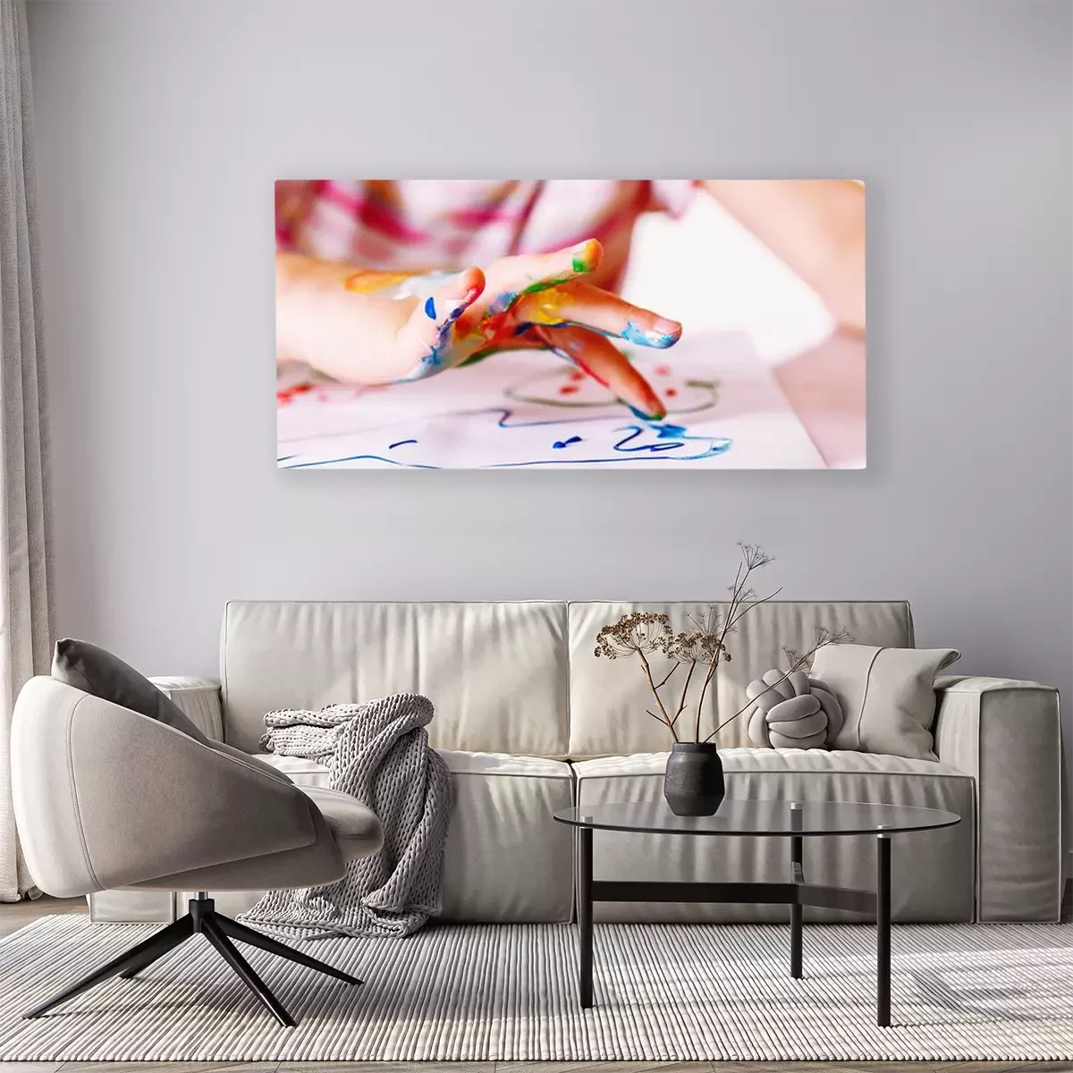 Tableau  Close up young girl painting with colorful hands. Art,  creativity and painting concept. Horizontal image.