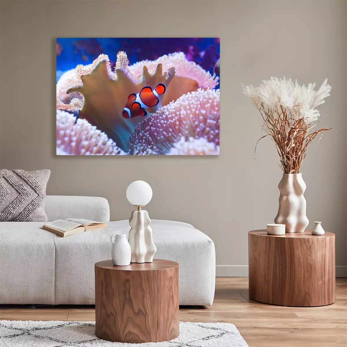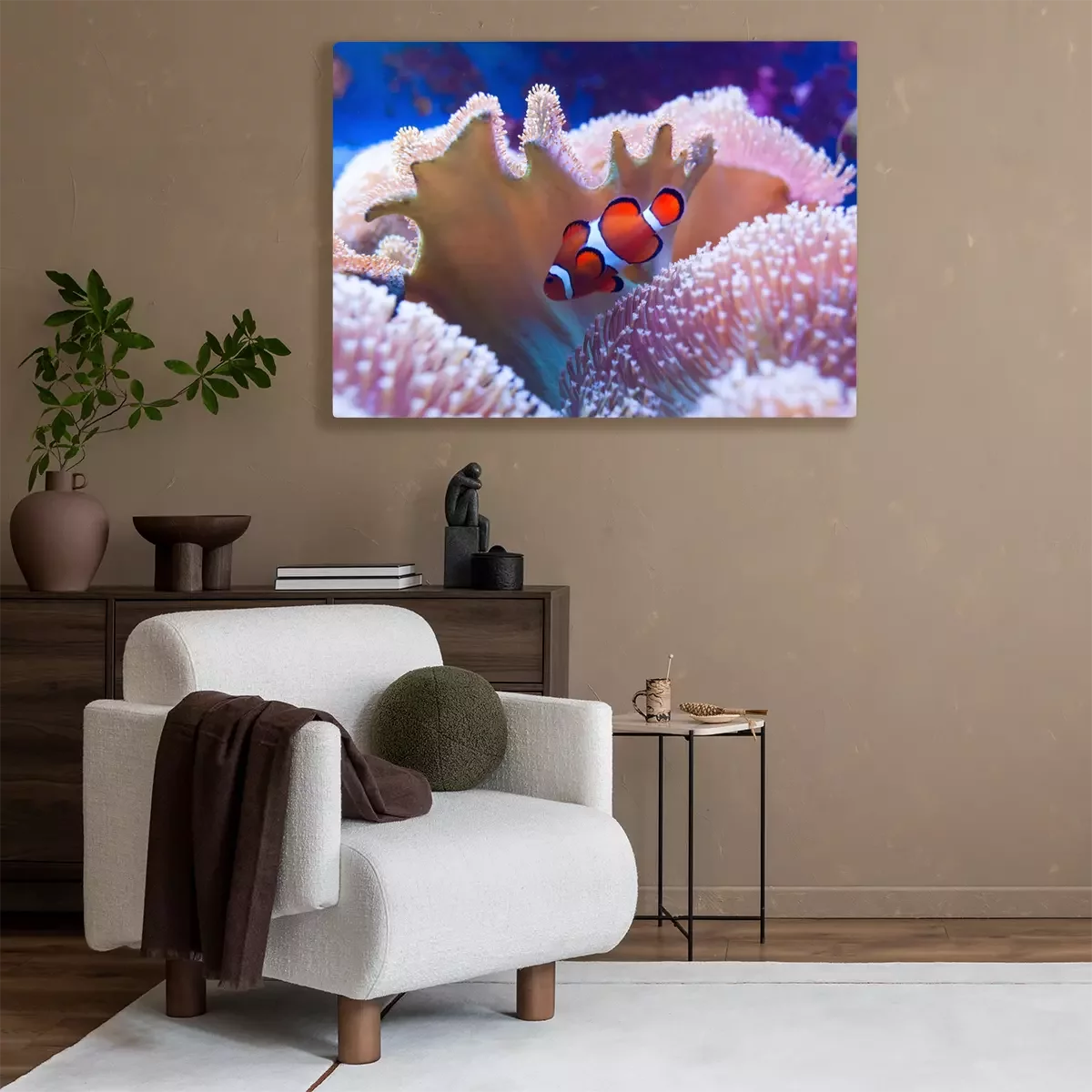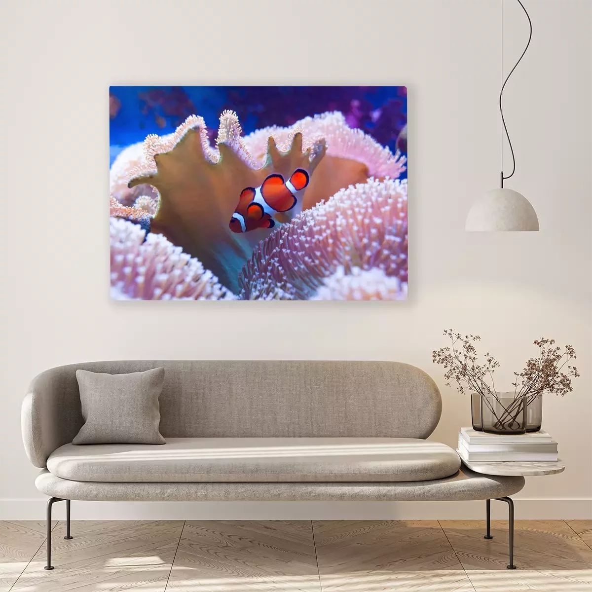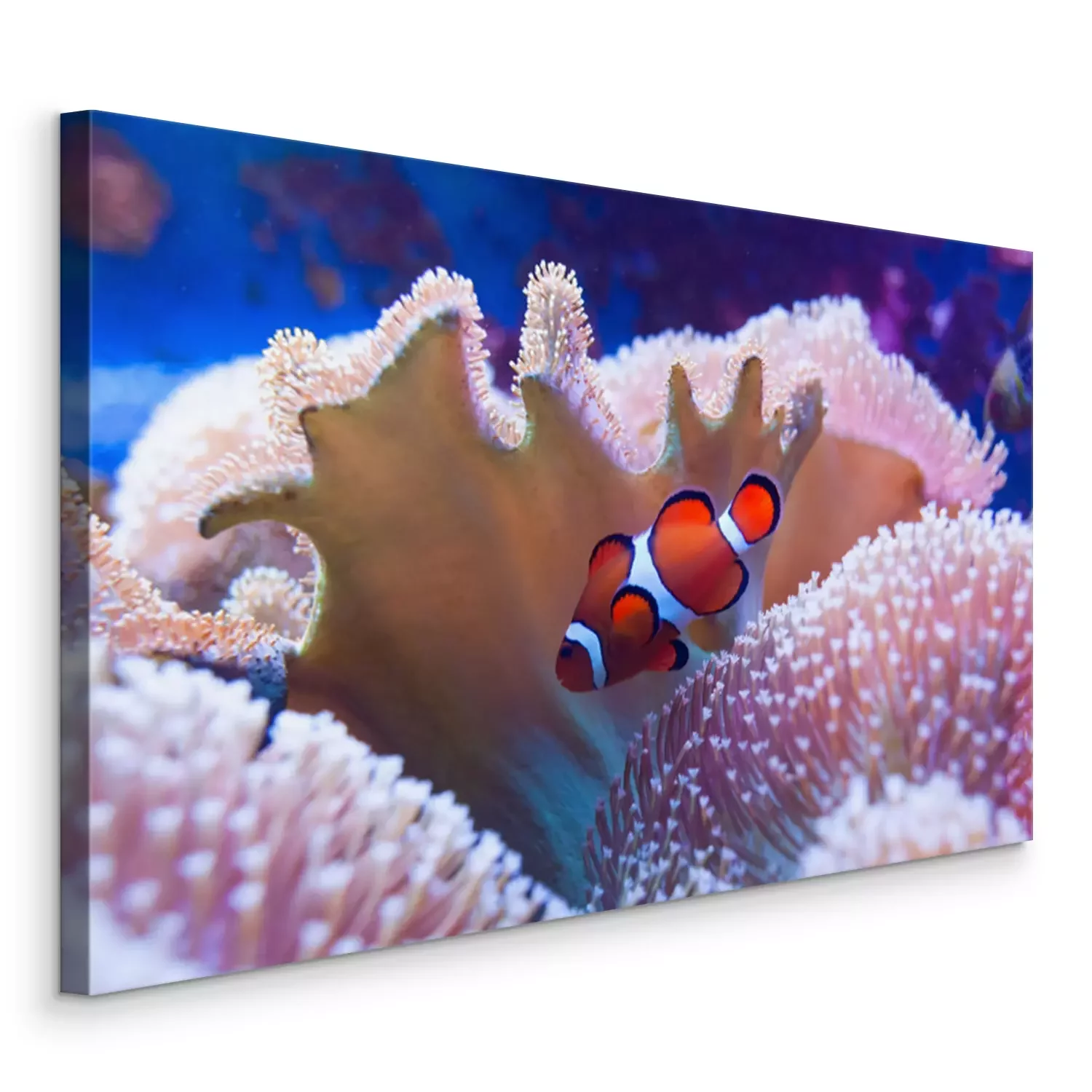 Tableau : Clown fish swimming in the corals.