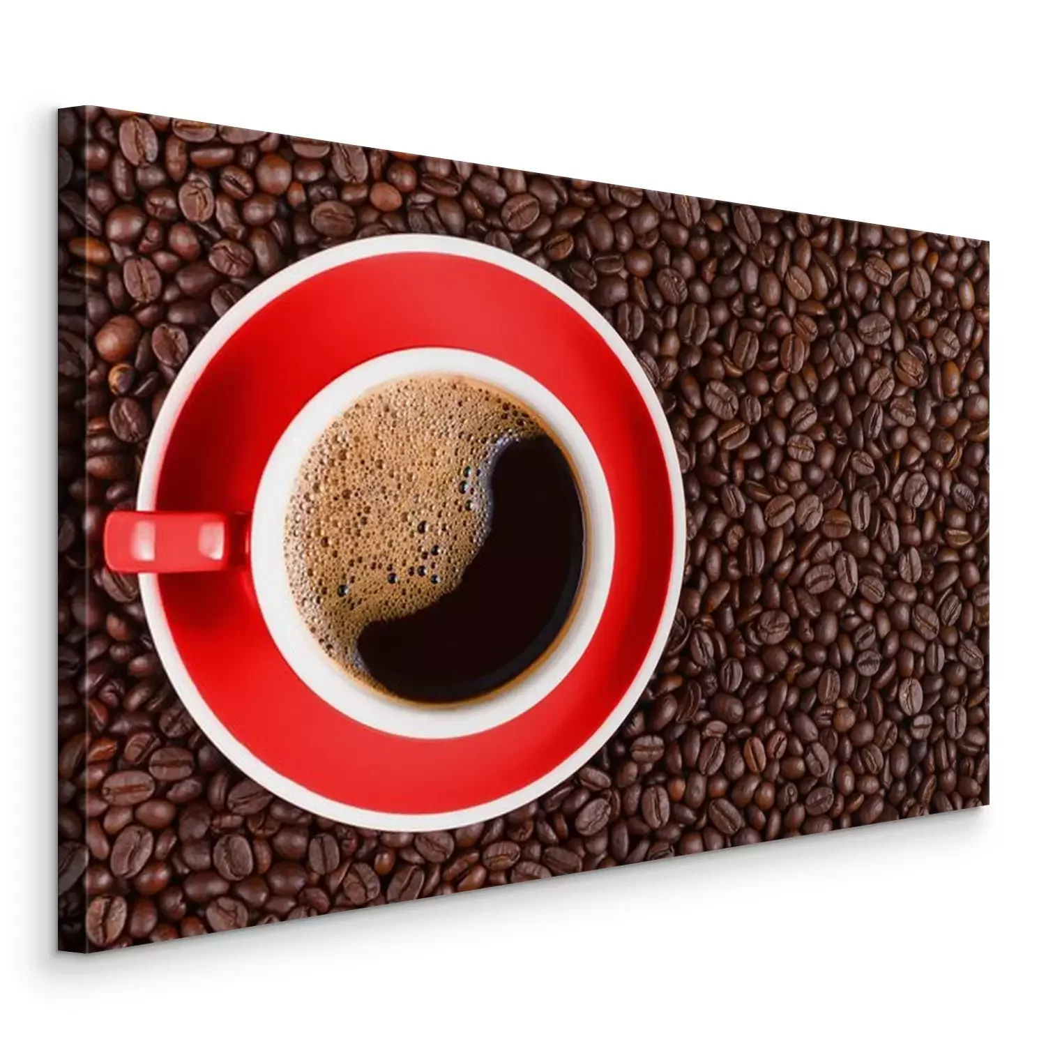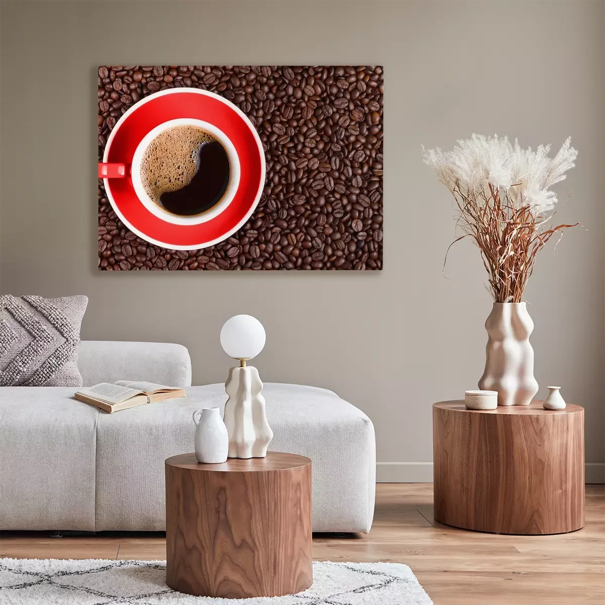 Tableau : coffee background of hot black coffee in red cup on roasted arabica coffee beans background