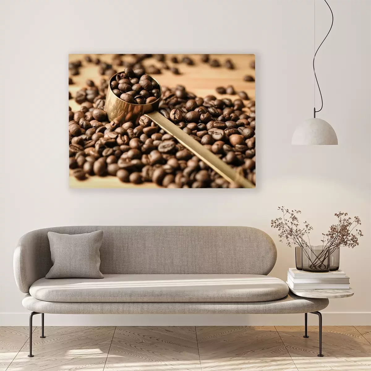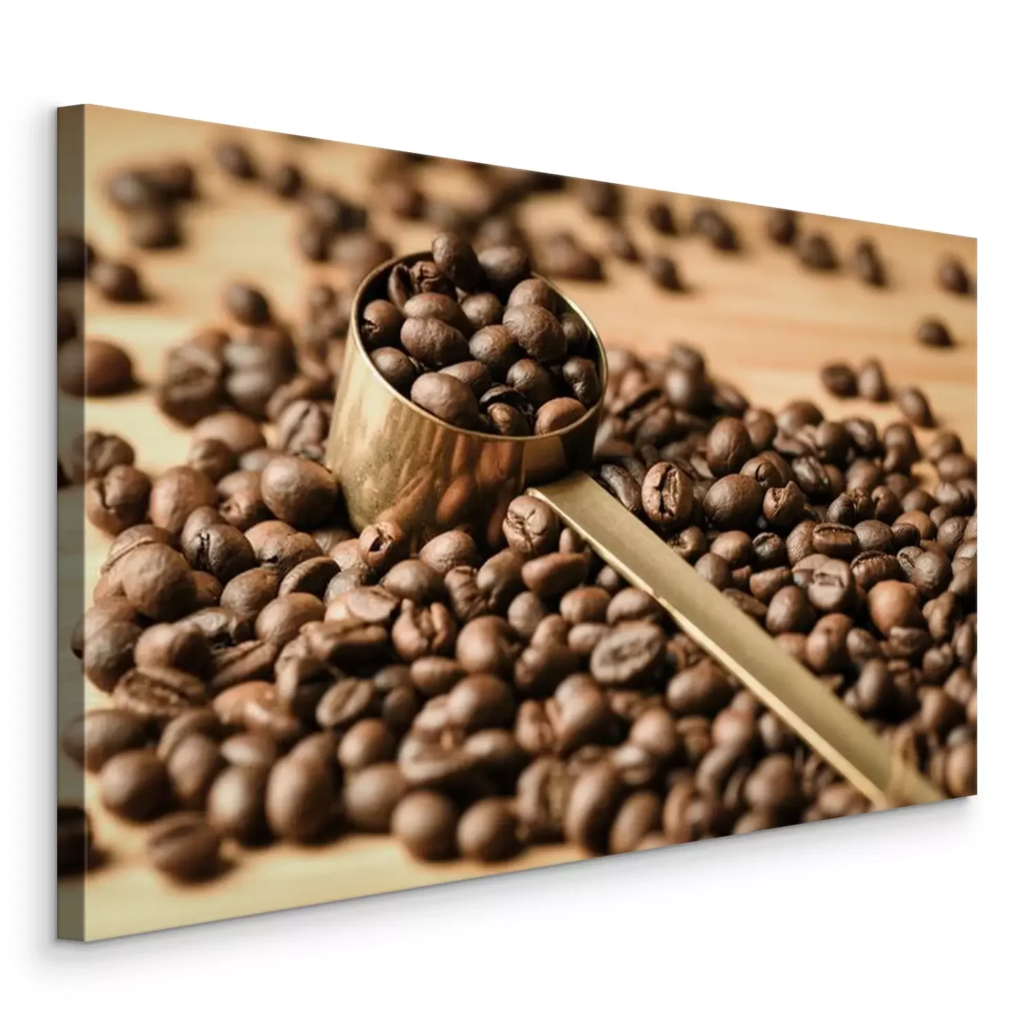 Tableau : Coffee beans are poured on a wooden surface and in the middle is a coffee spoon full of beans