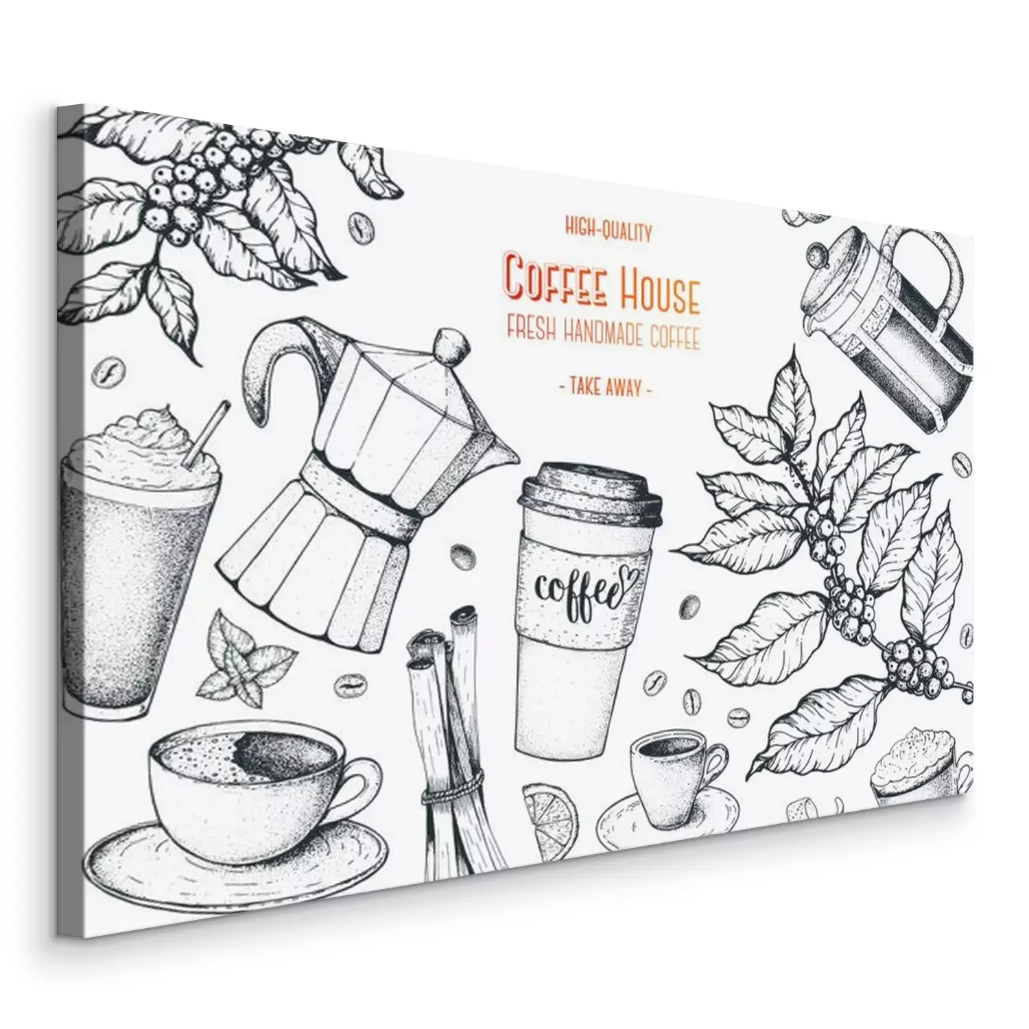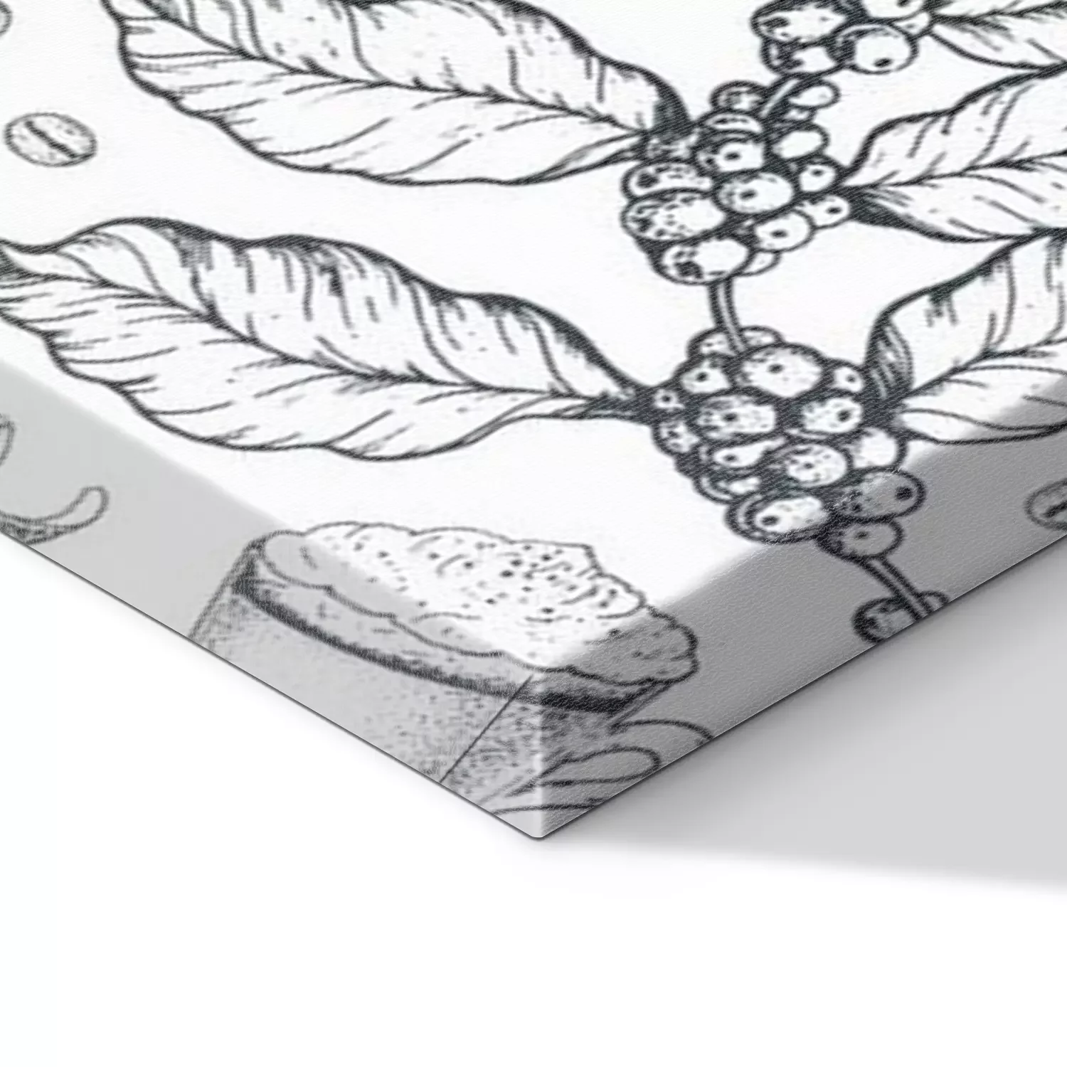 Tableau  Coffee cups, beans and coffee tree illustration. Vintage design for coffee shop. Engraved vector illustration.