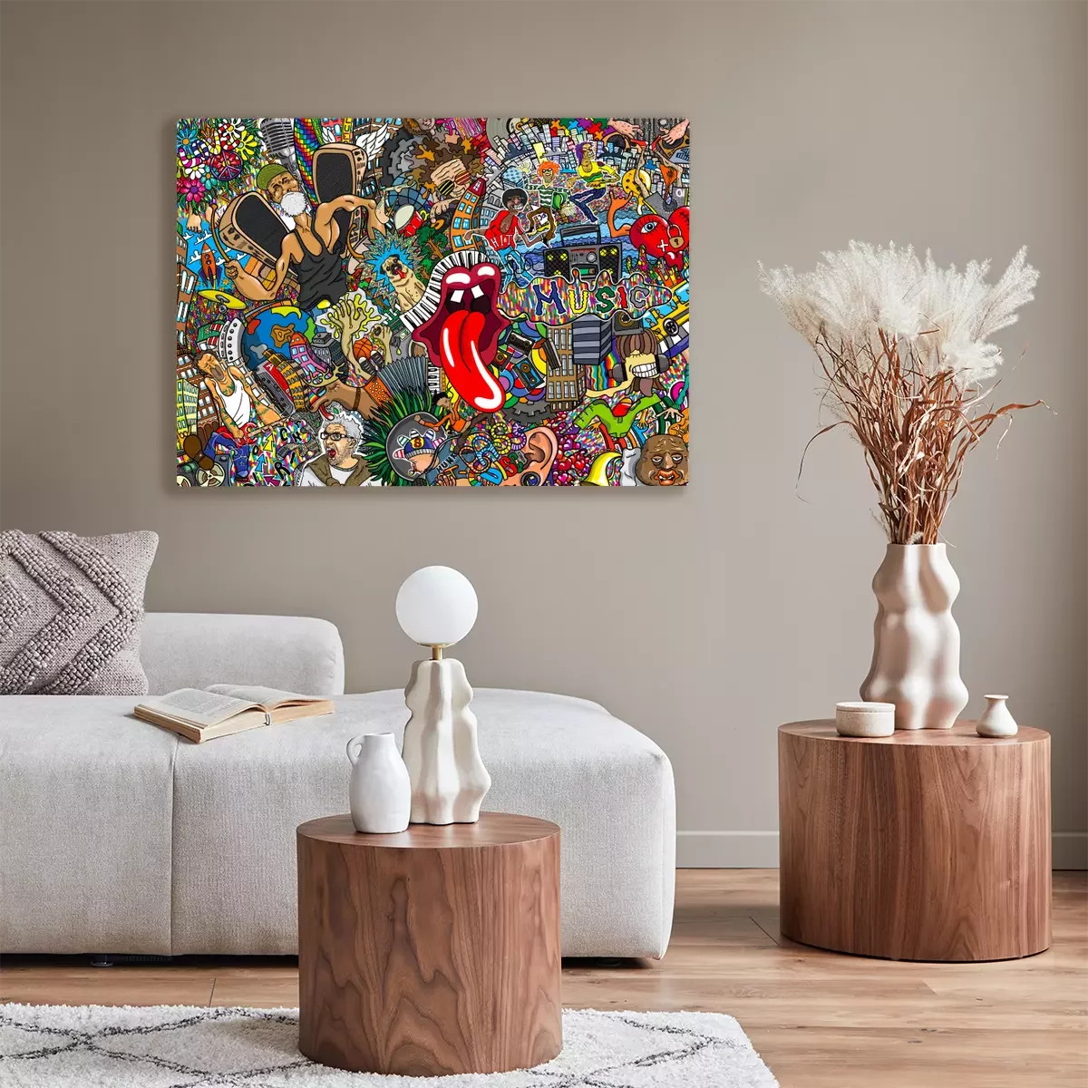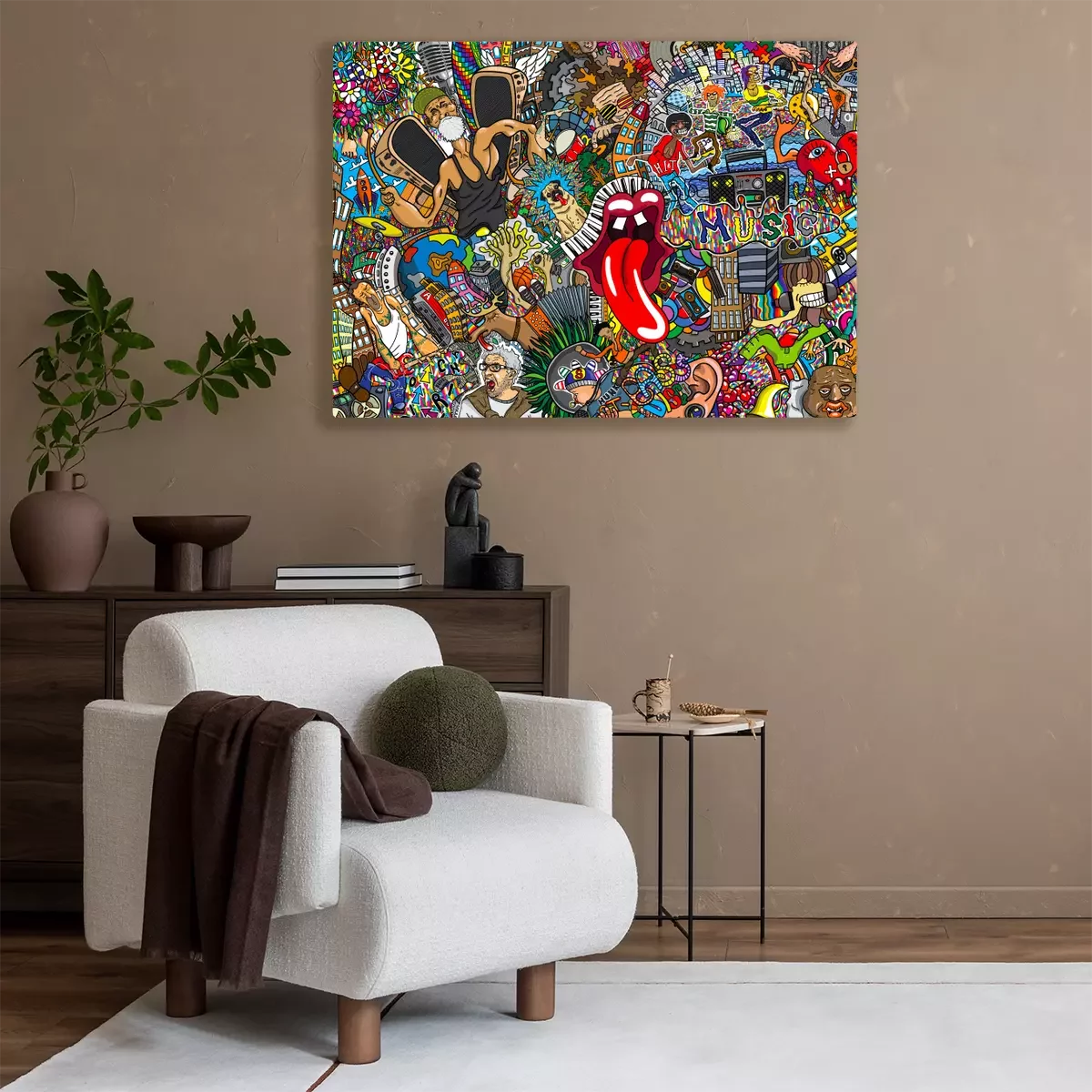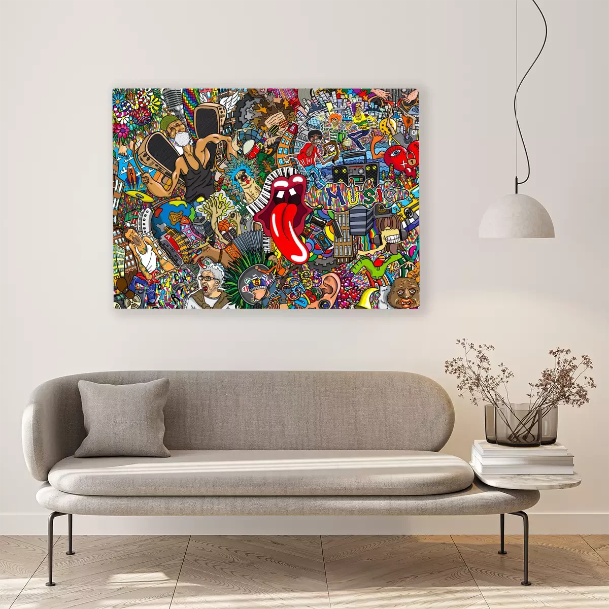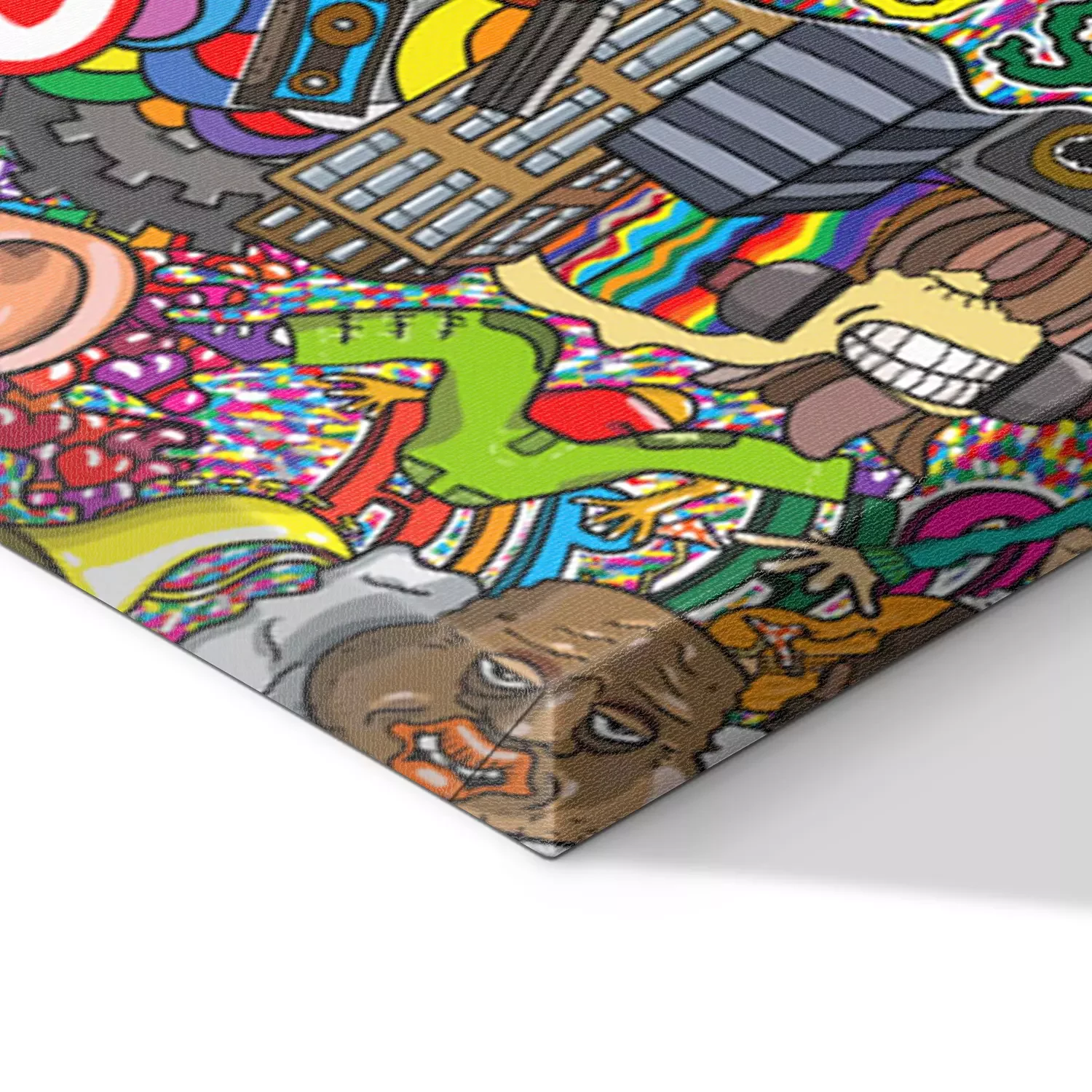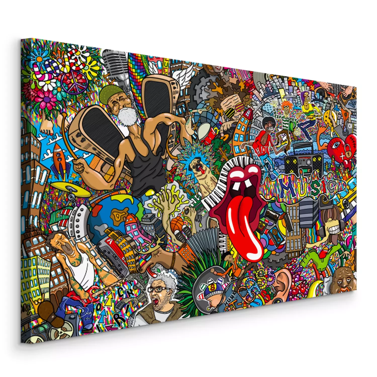 Tableau : Collage graffiti coloré avec musique et motifs pop culture